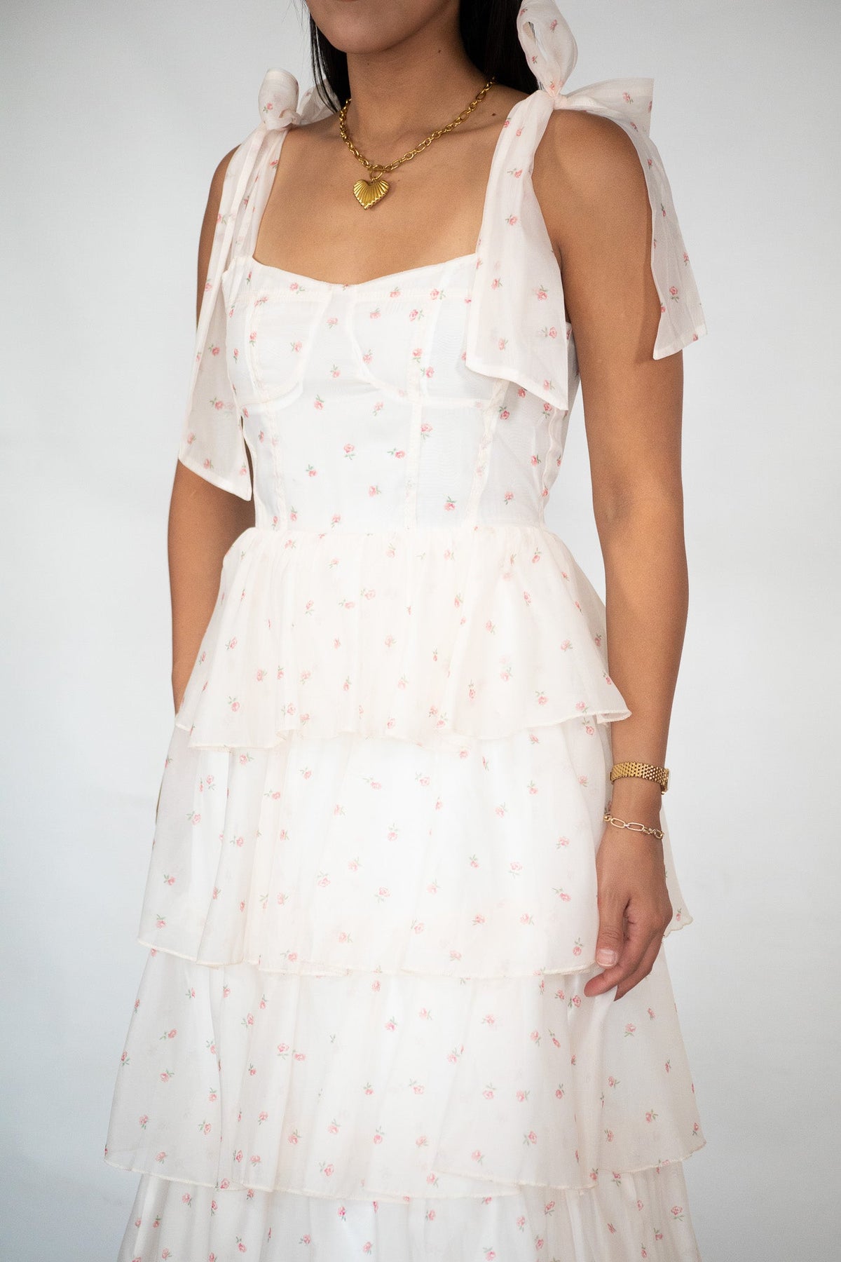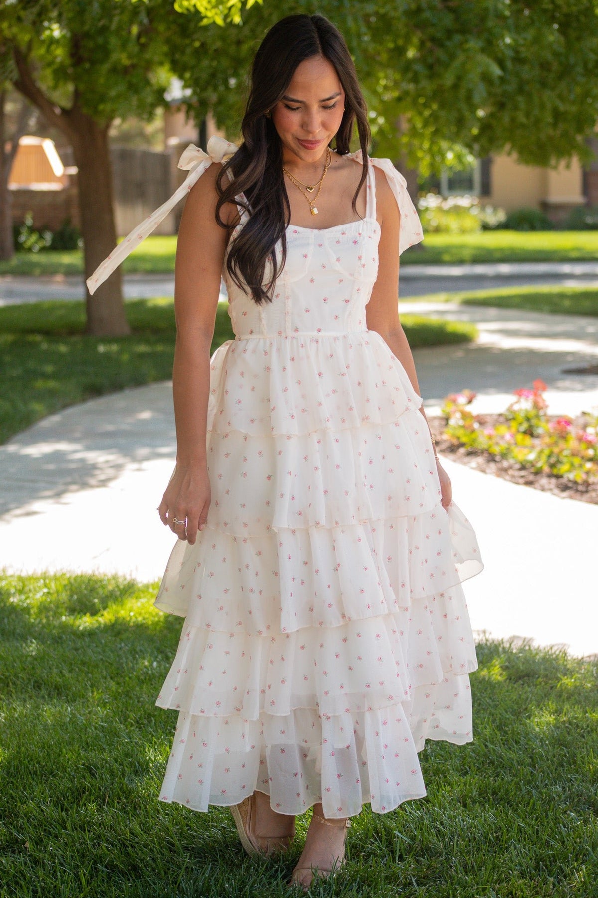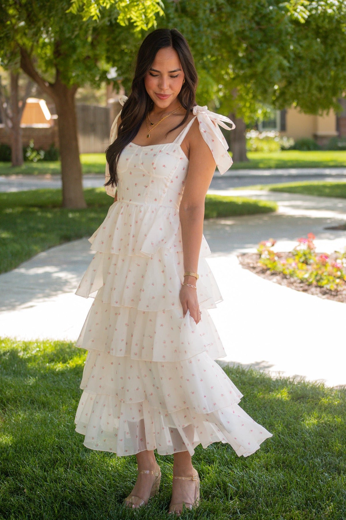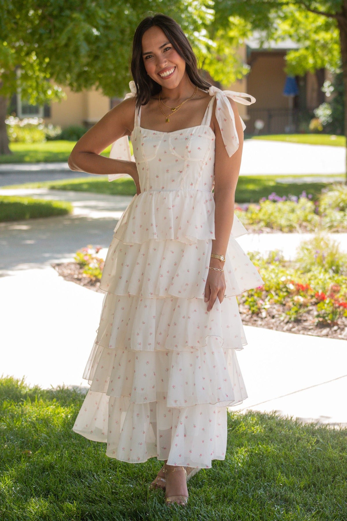 Romantic and floaty, The Elsie Dress features tiered layers of soft tulle with a subtle floral print, tie straps, and a flattering fitted bodice. It’s everything you want in a garden party dress—airy, feminine, and made to twirl.