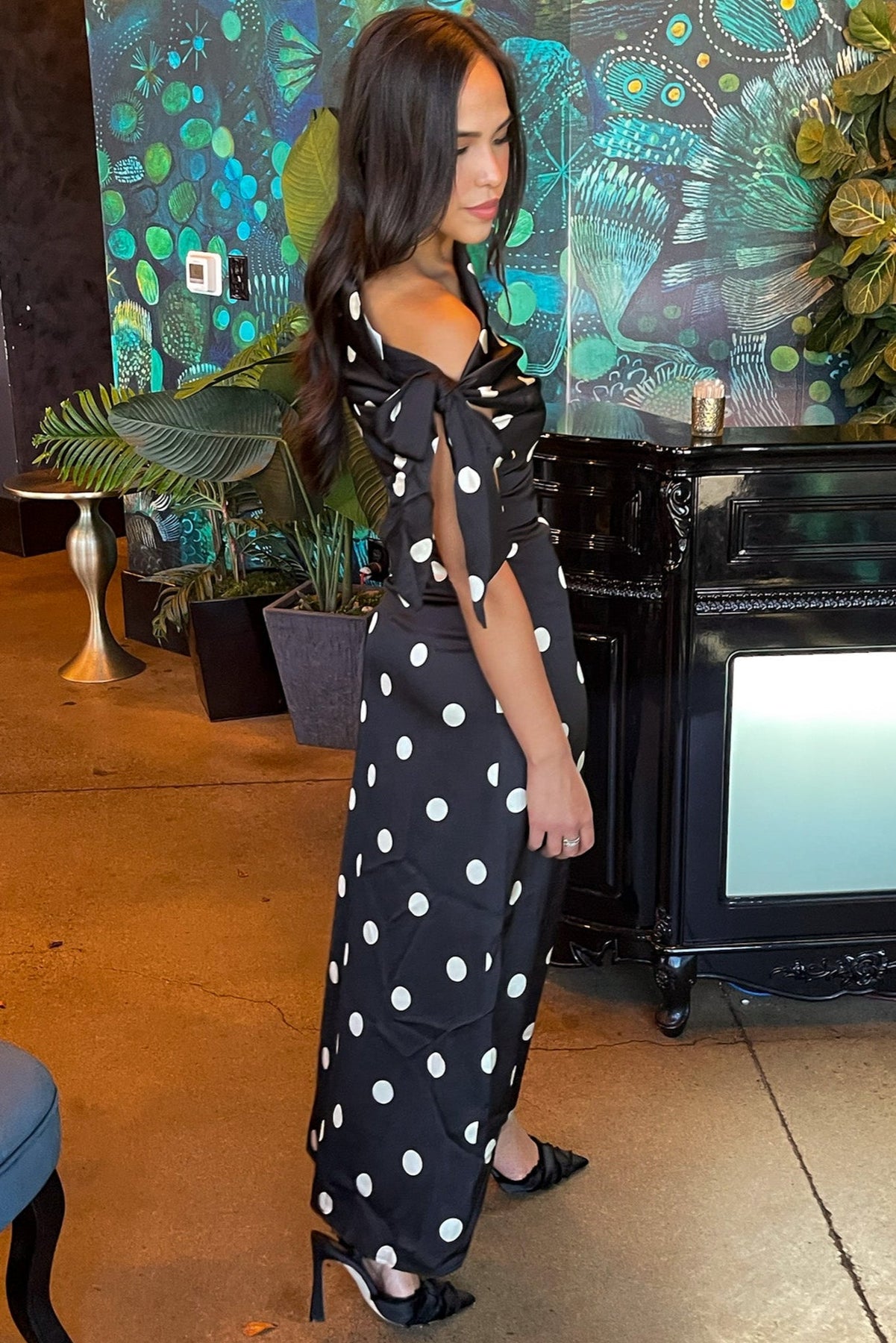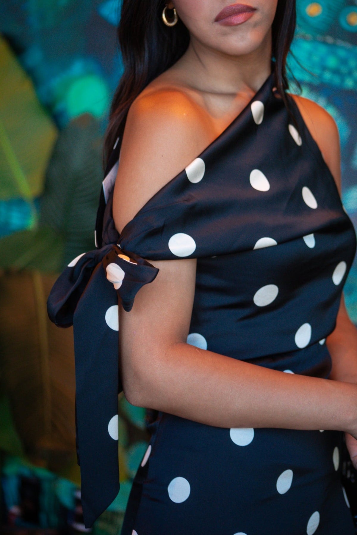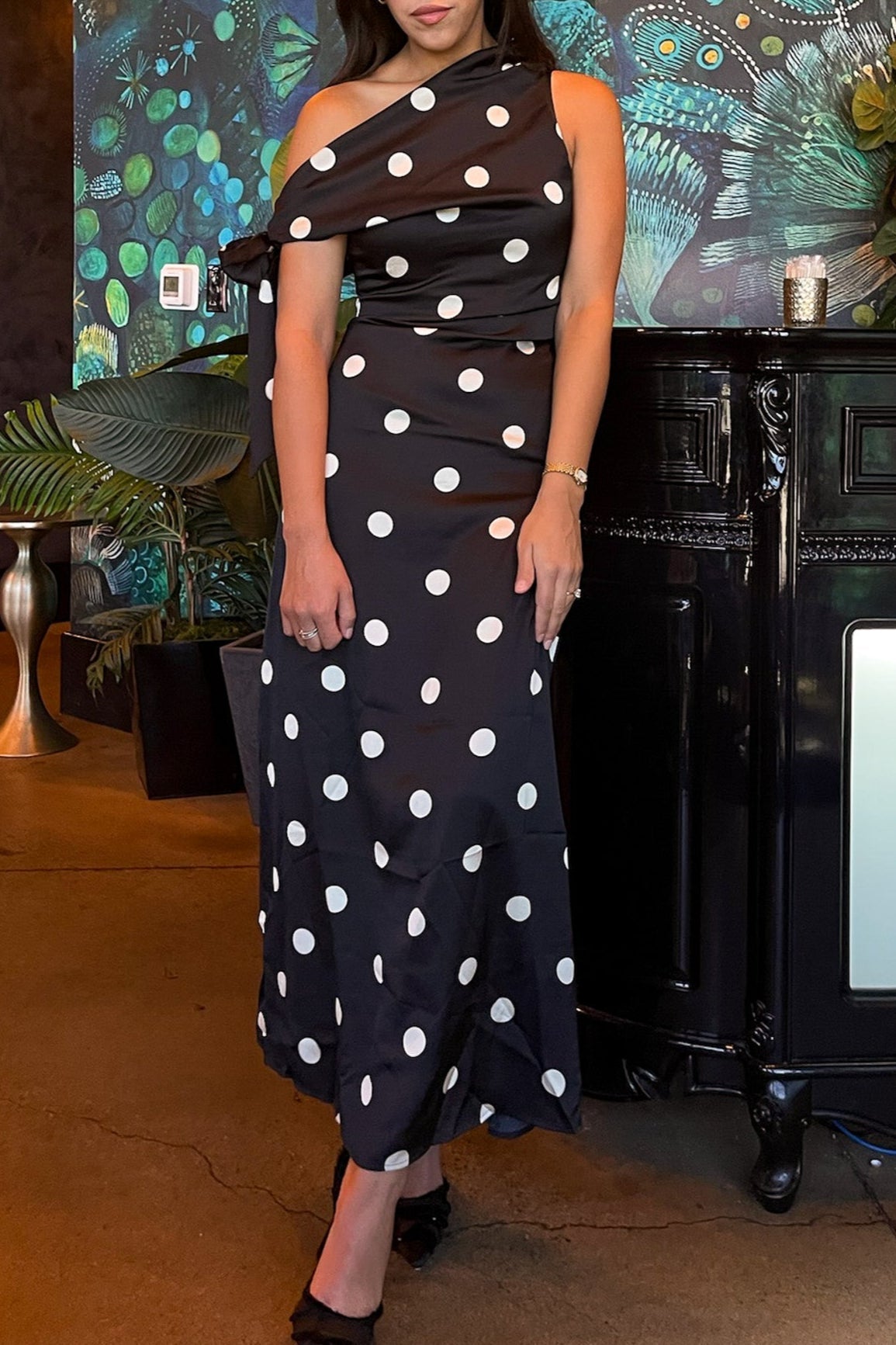 A statement one shoulder dress in bold polka dots, made for cocktails, date nights, and dance floors.