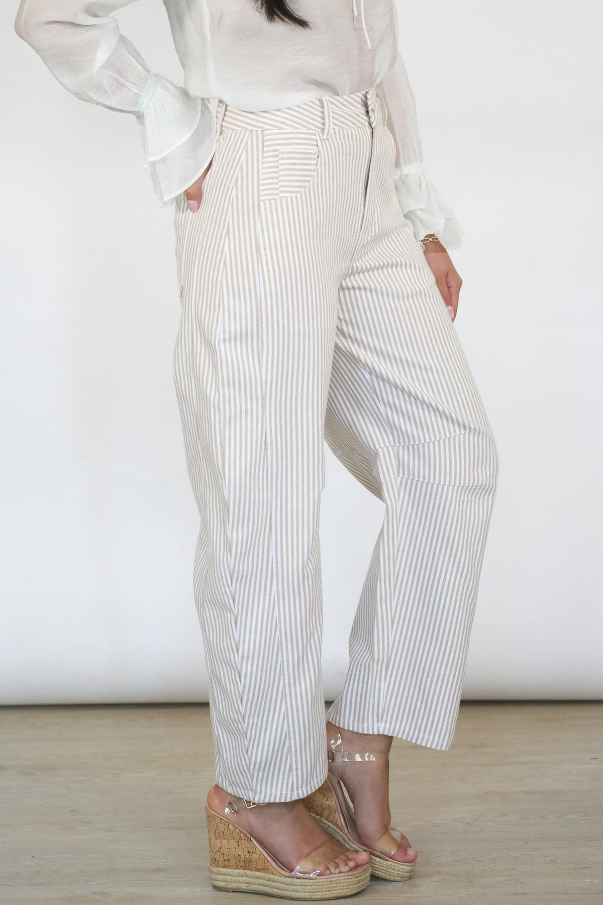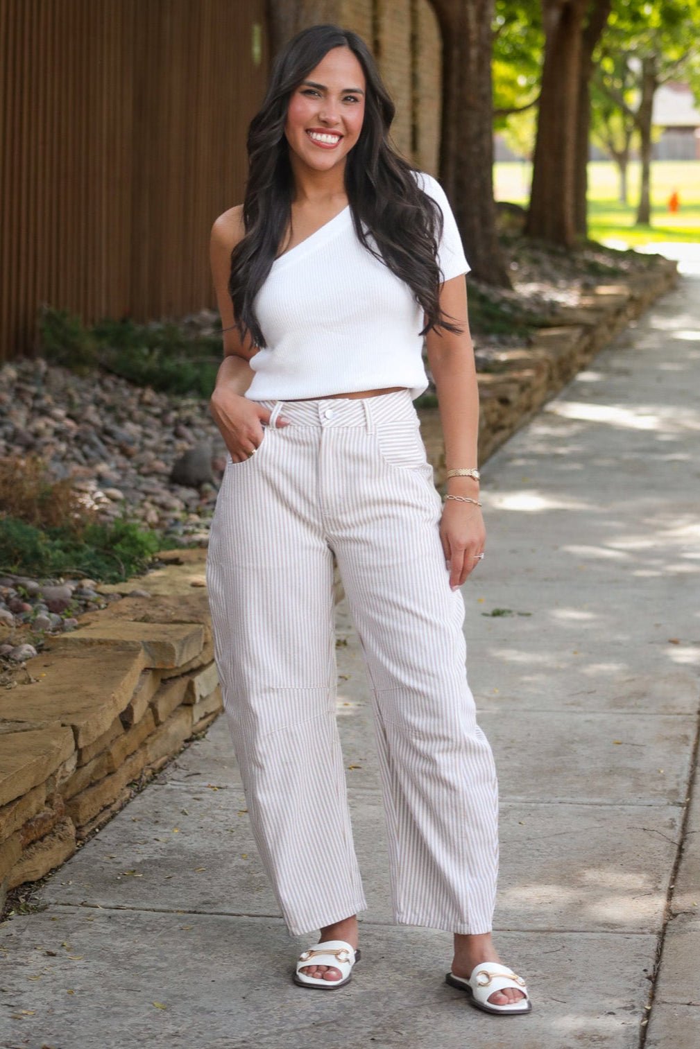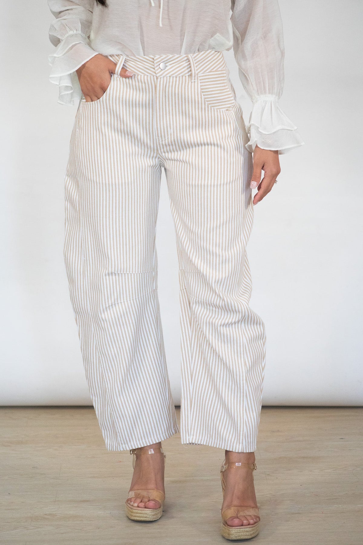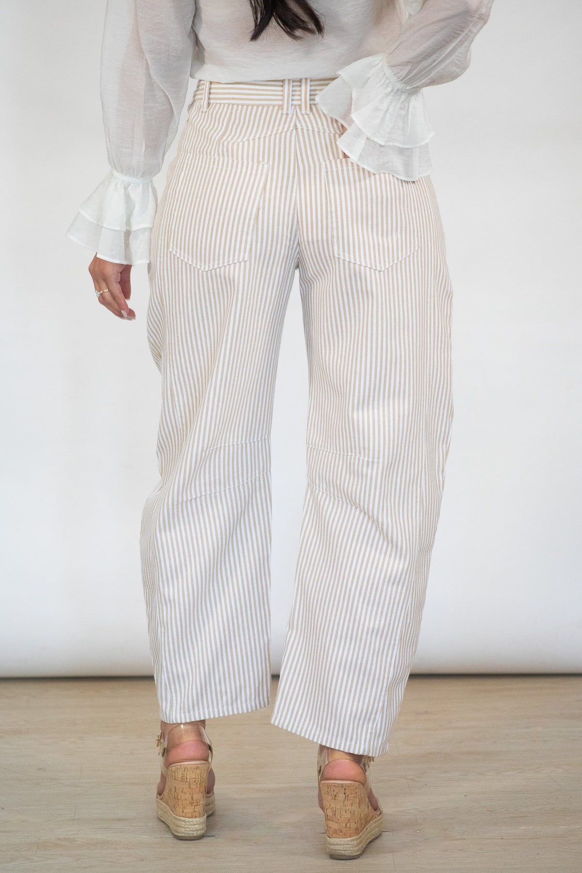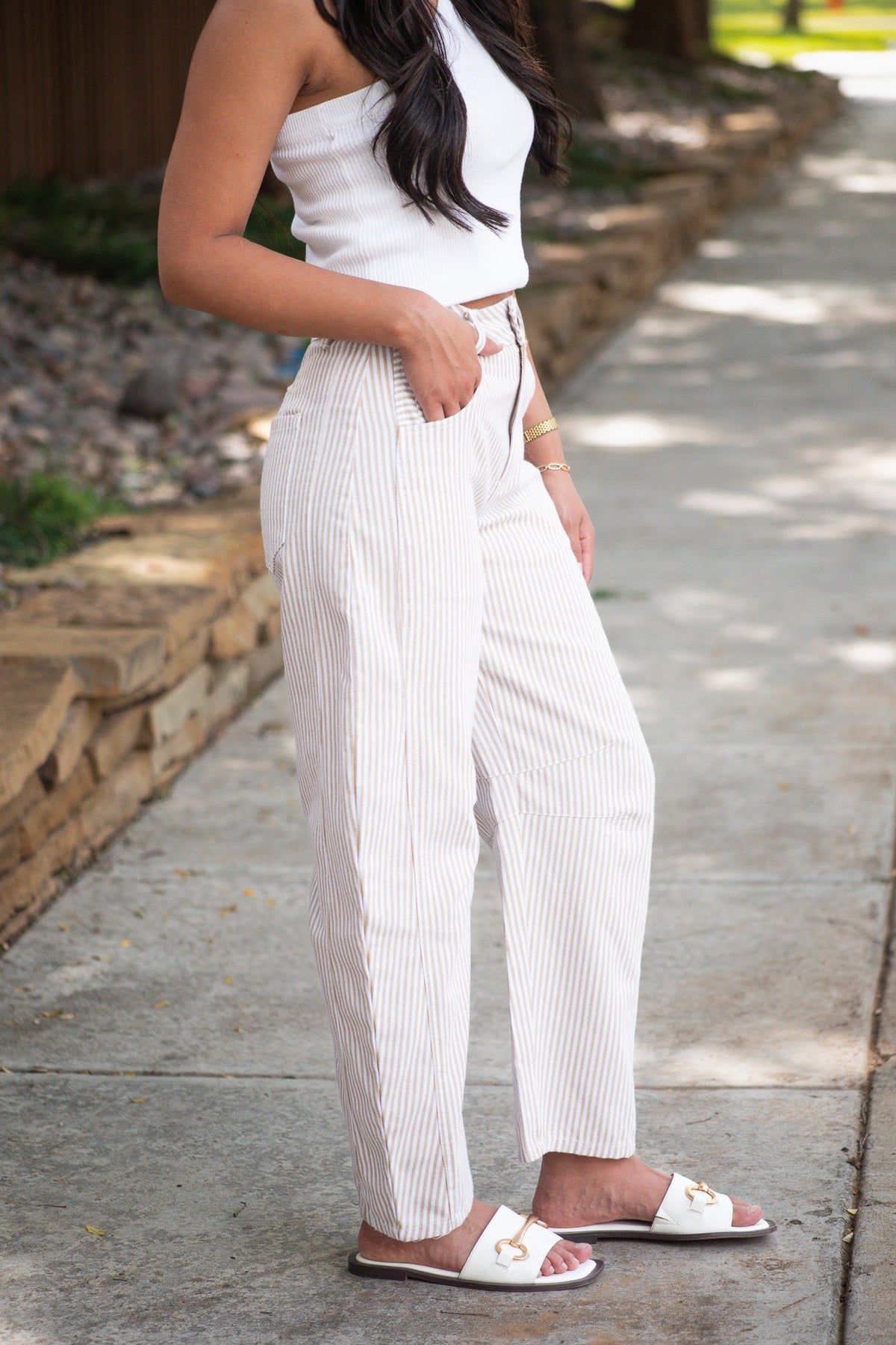 Cool and crisp with a coastal vibe, these mid-rise, barrel pants feature a tan pinstripe and raw hem detail. Lightweight, structured, and made for beach days or brunch plans.