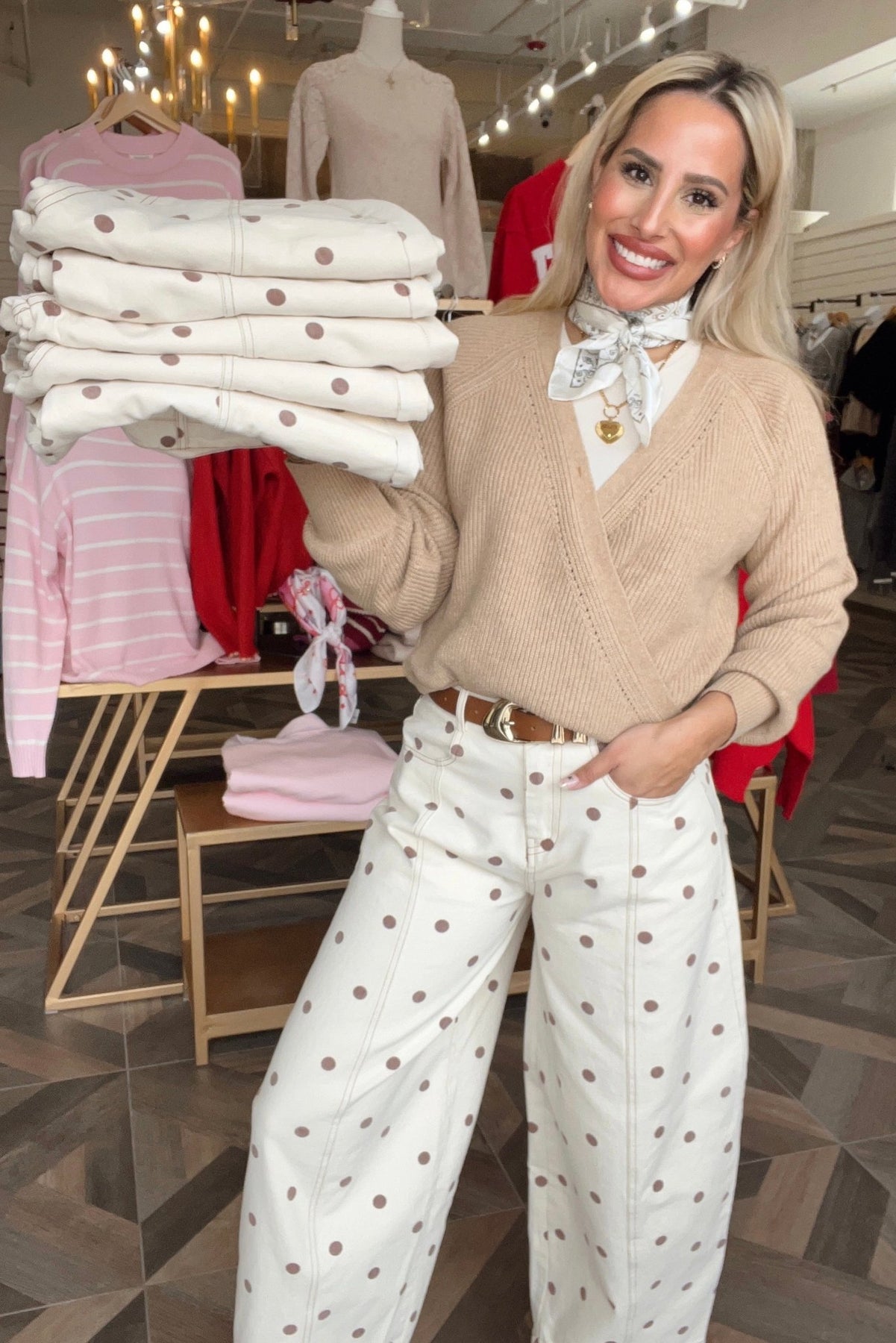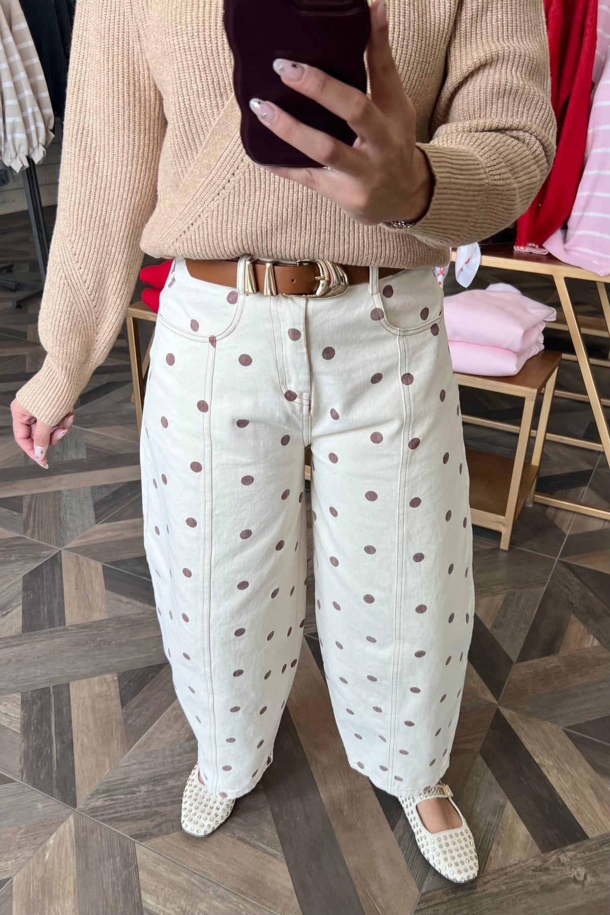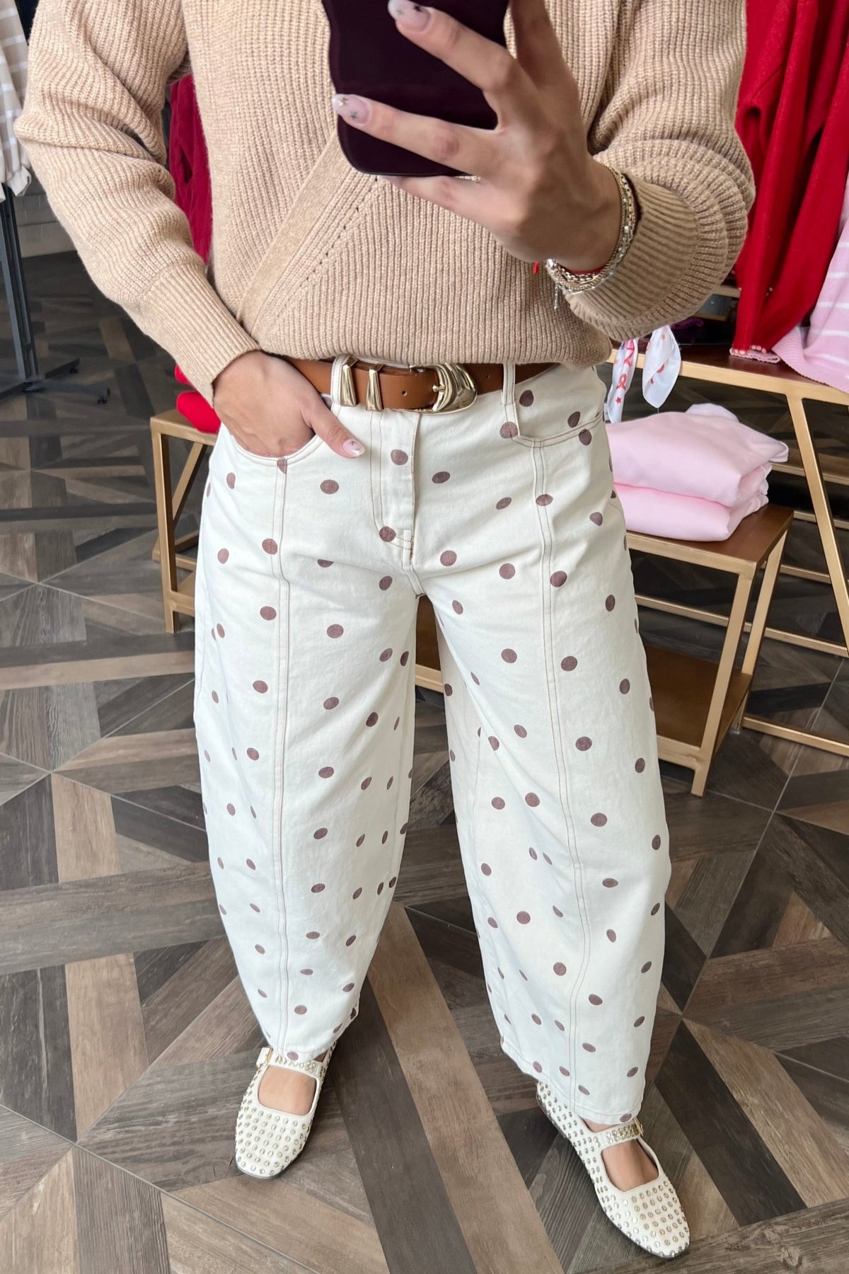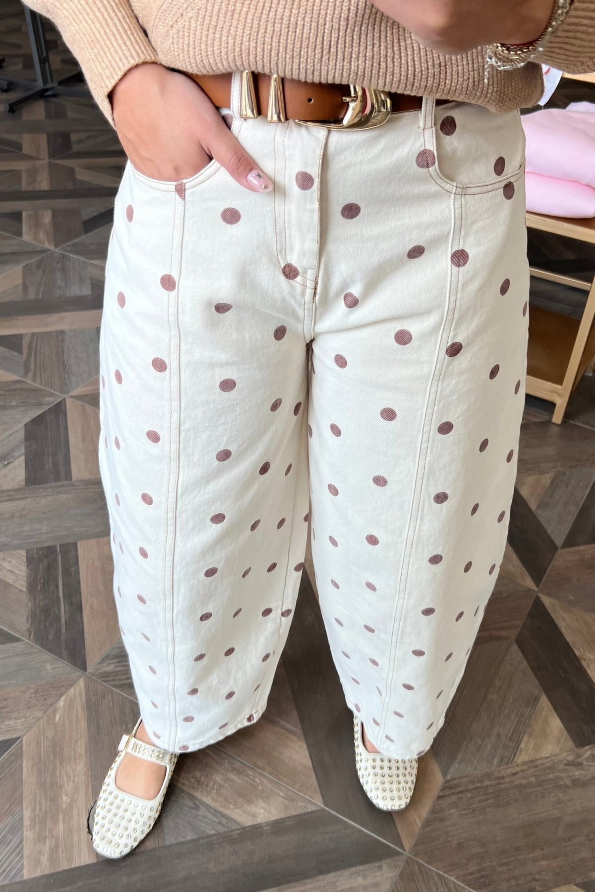 Barrel leg cream denim with brown polka dots, a fun twist on a trendy, easy silhouette.