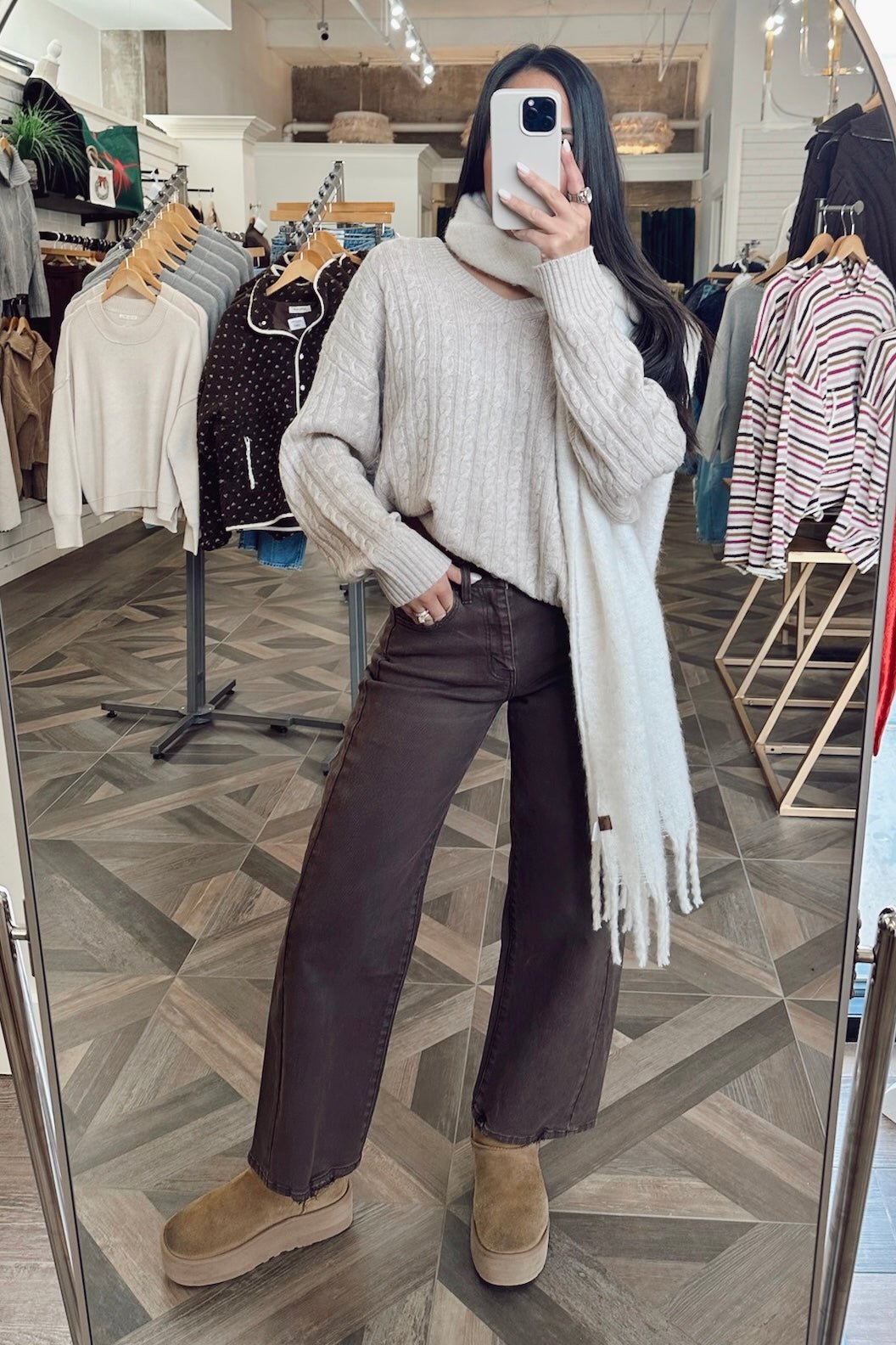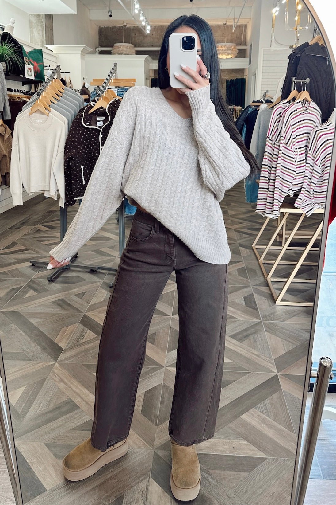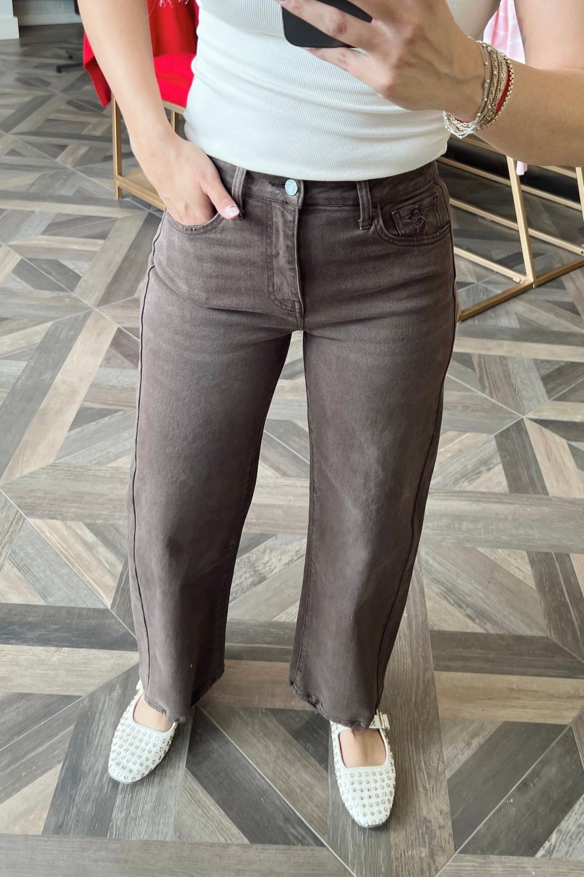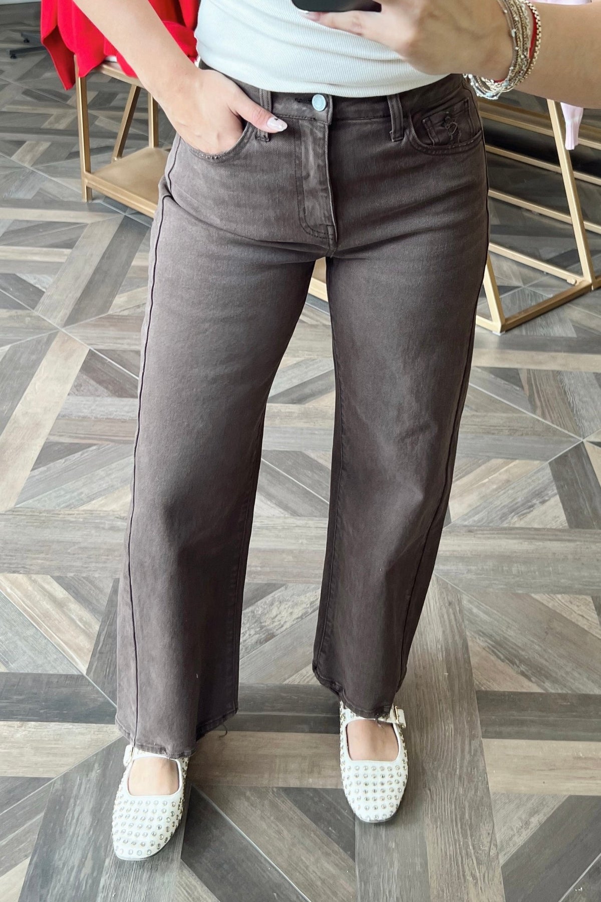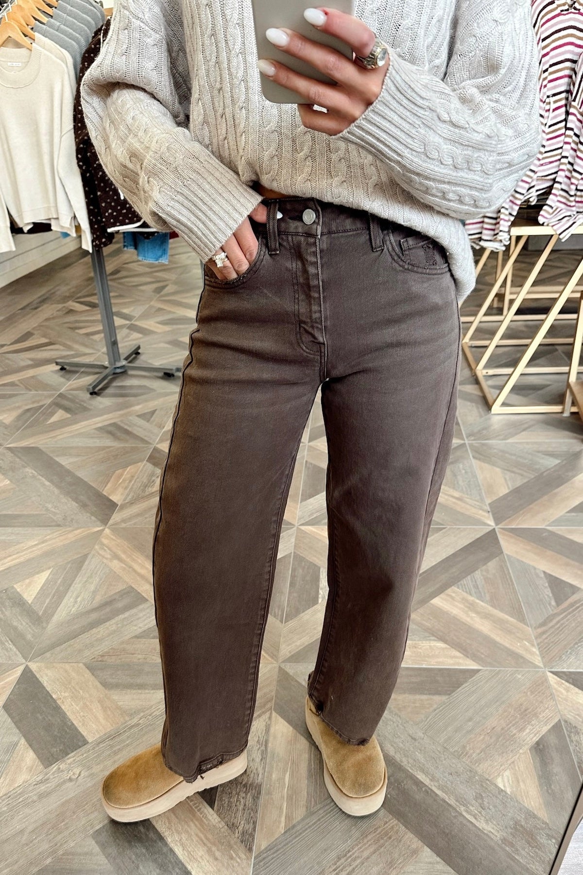 A chocolate brown barrel leg denim with an easy, relaxed shape that dresses up or down without trying.
