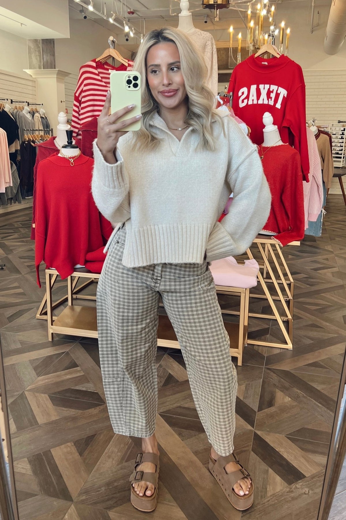 A fresh take on denim with a relaxed barrel leg and soft neutral plaid. These sit comfortably at the waist with a structured-but-easy fit through the leg, making them just as good with a cozy knit as they are with a fitted tee. Easy to dress up or down, and the kind of pair you’ll reach for when you want something different without trying too hard.