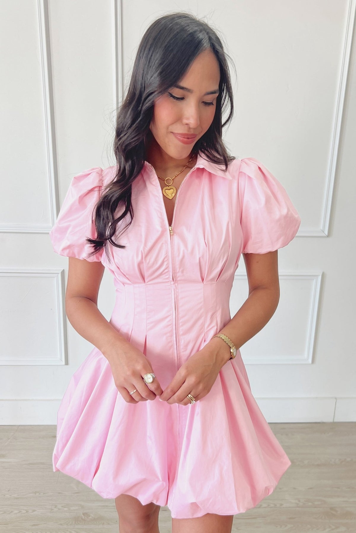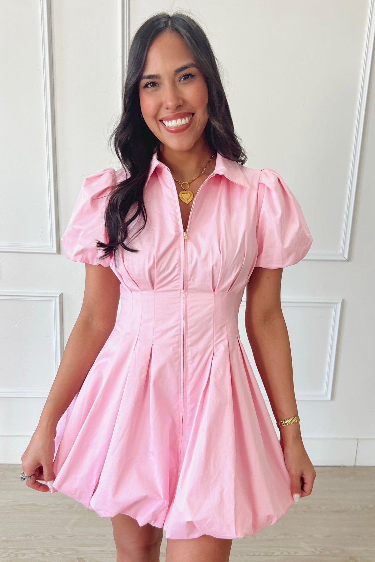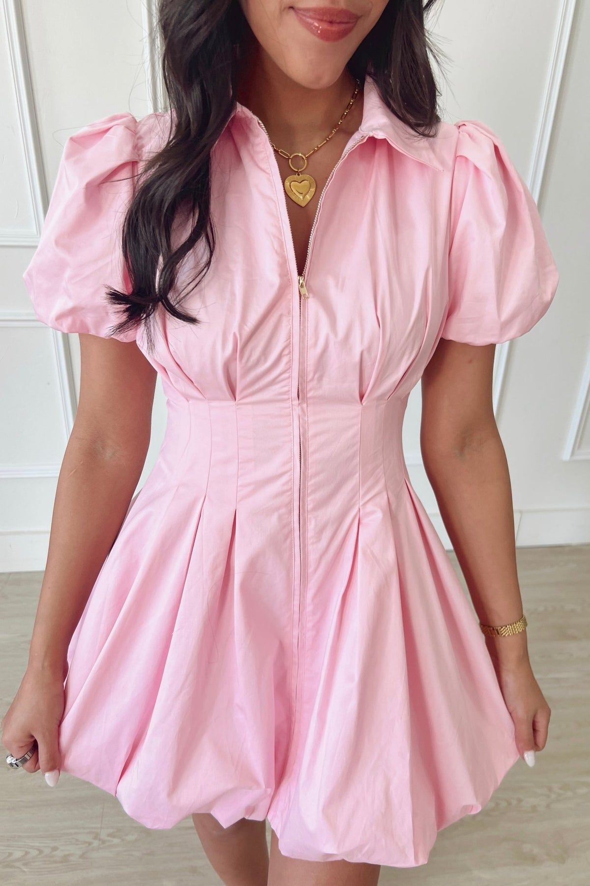 Tailored through the waist with a playful bubble hem, this dress makes a statement while still feeling easy to wear. Puff sleeves and a zip front add just the right amount of structure.