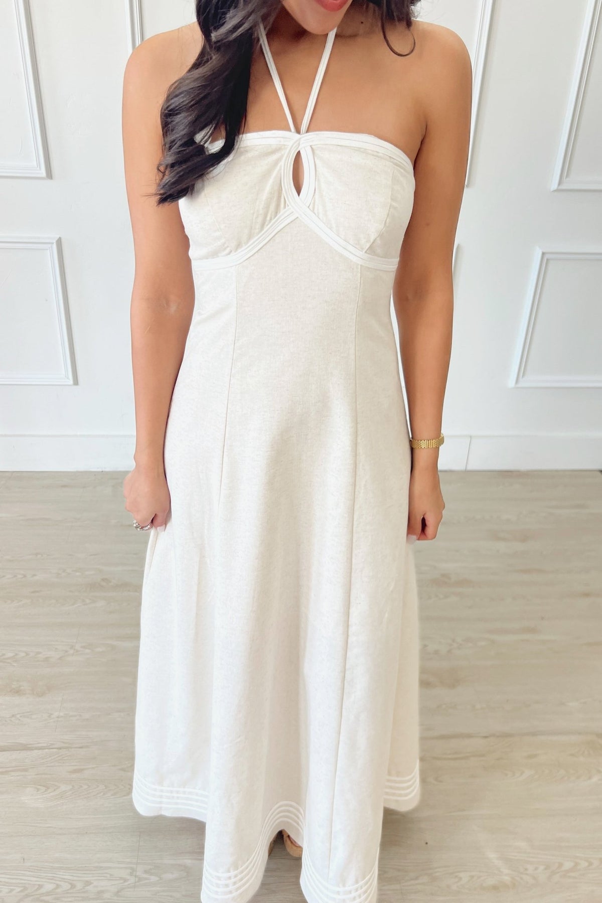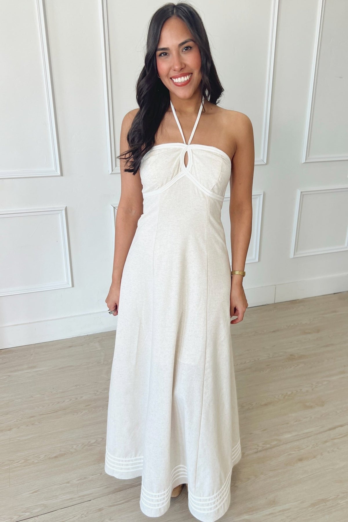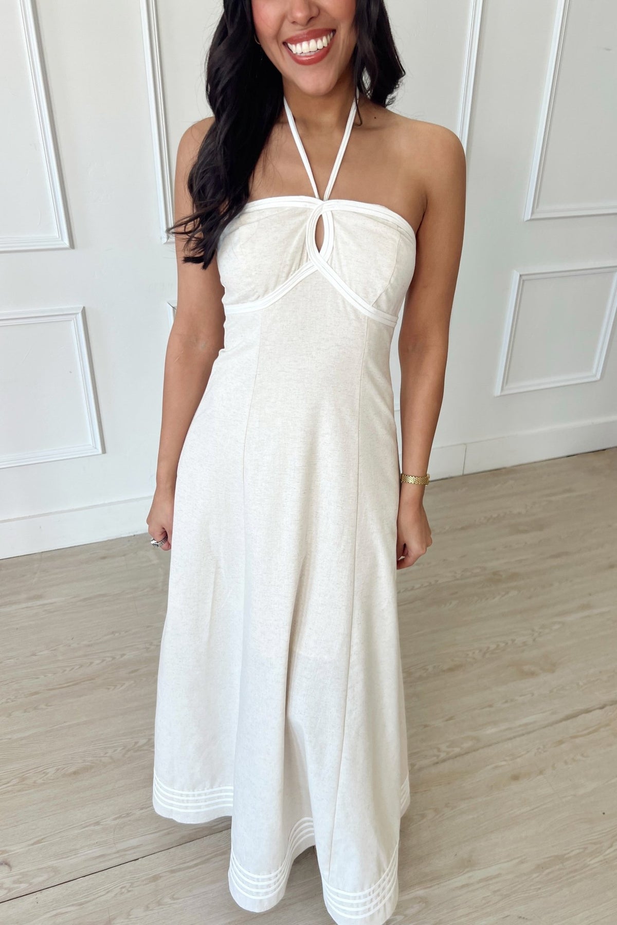 Clean lines and a soft halter neckline give this dress an understated elegance. The open back, linen material, and flowing skirt make it perfect for warm weather events.