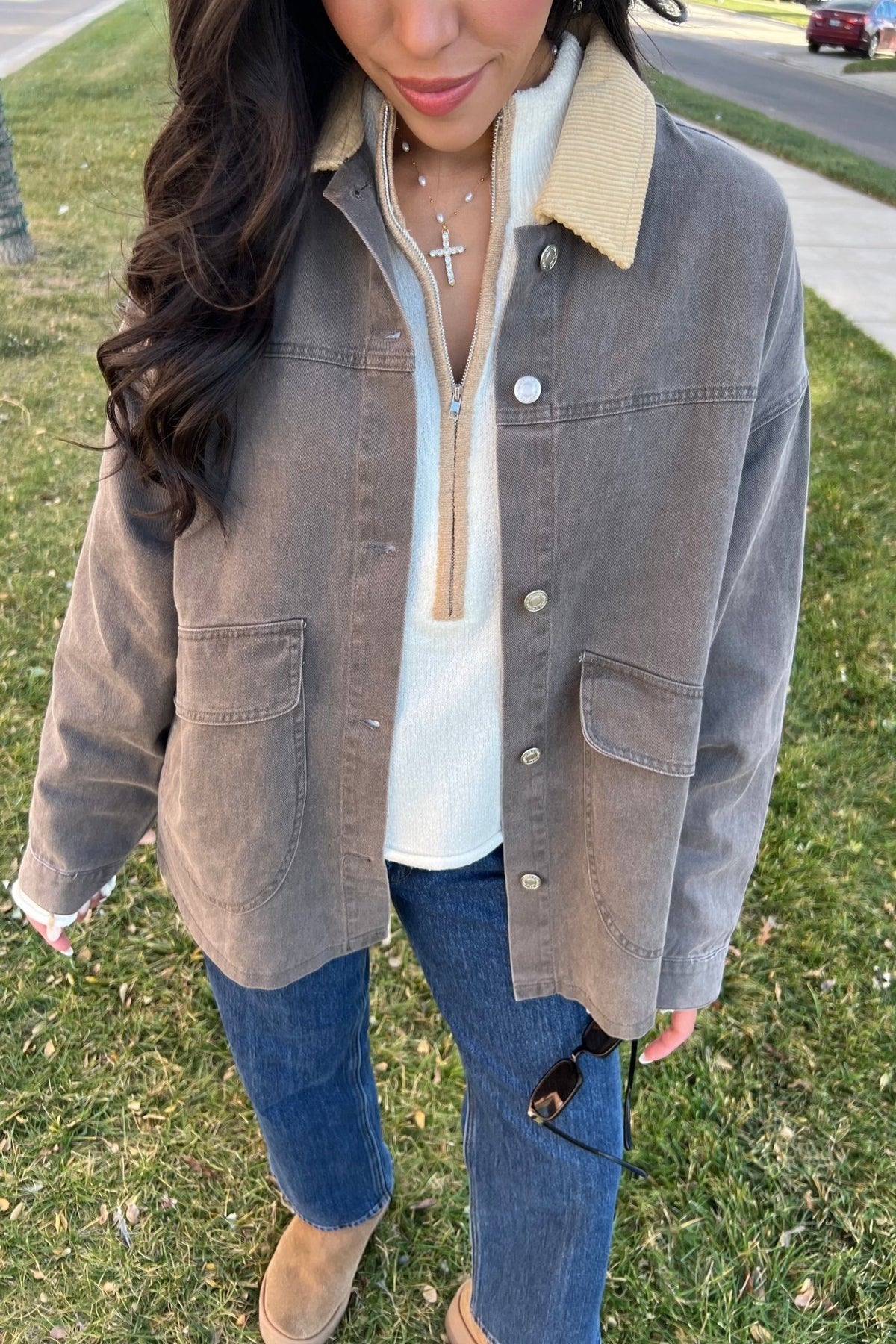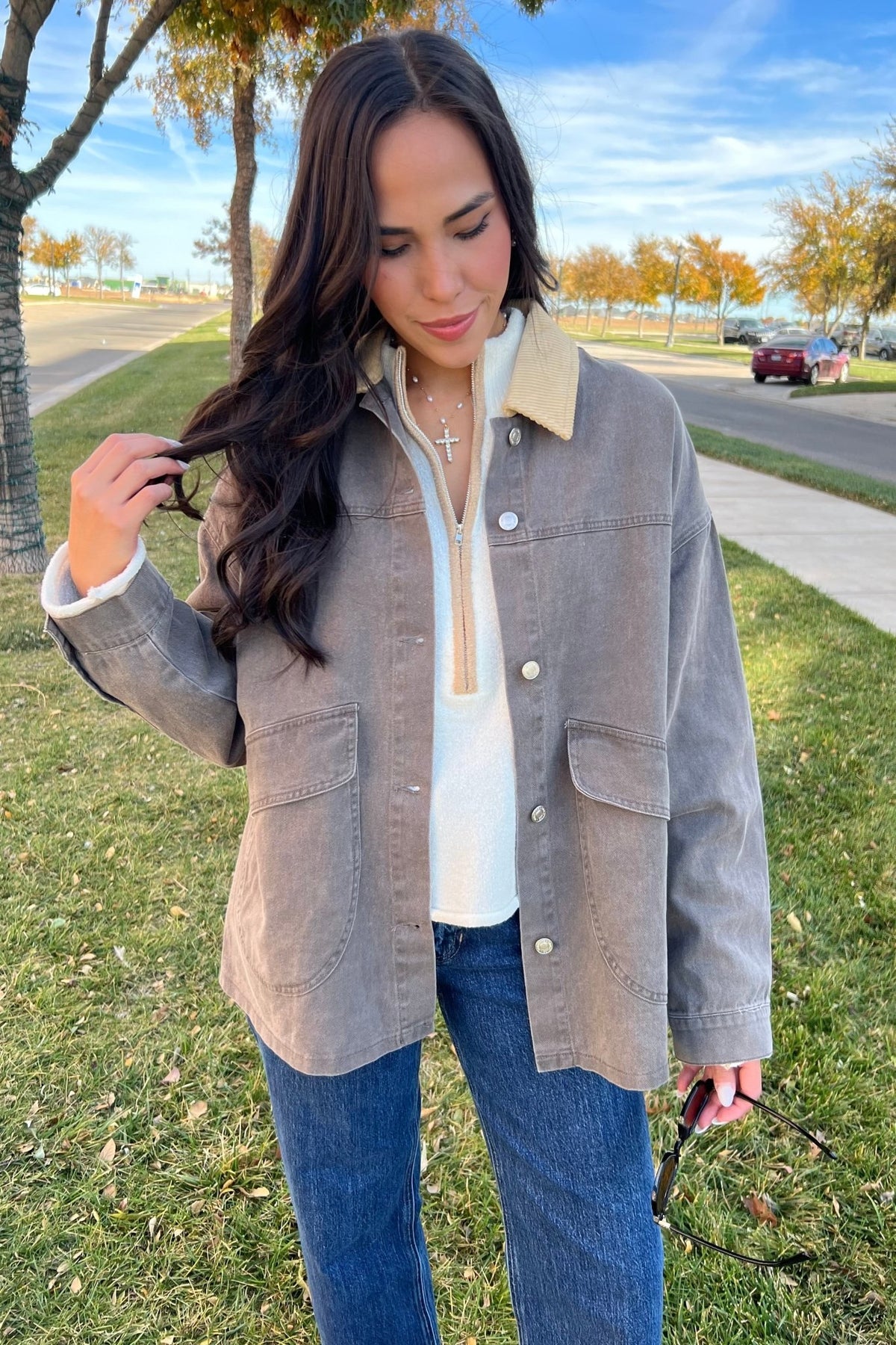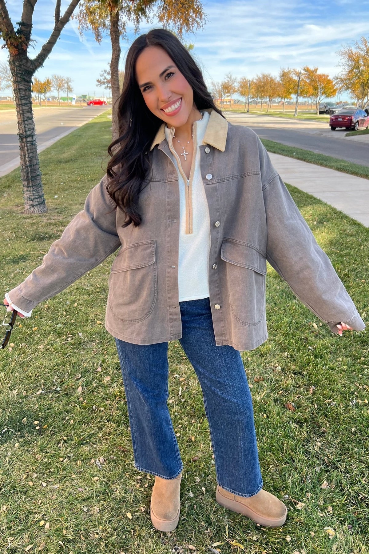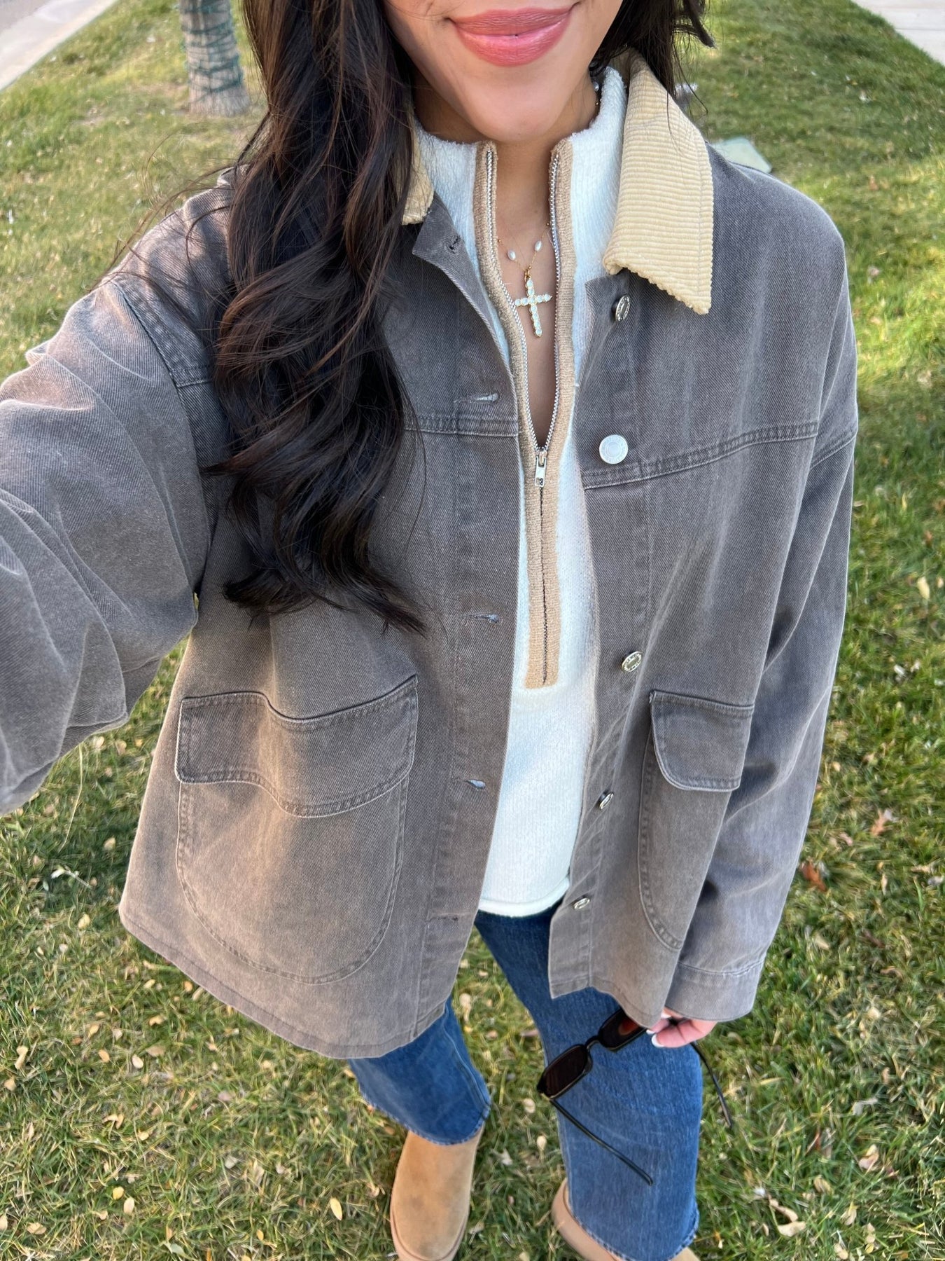 An oversized utility jacket in washed cotton with a contrast collar and deep pockets, giving it a relaxed, lived in feel for everyday wear.