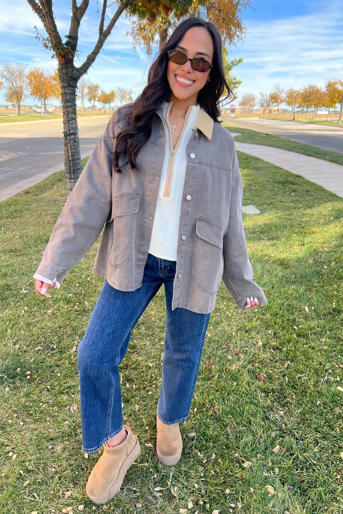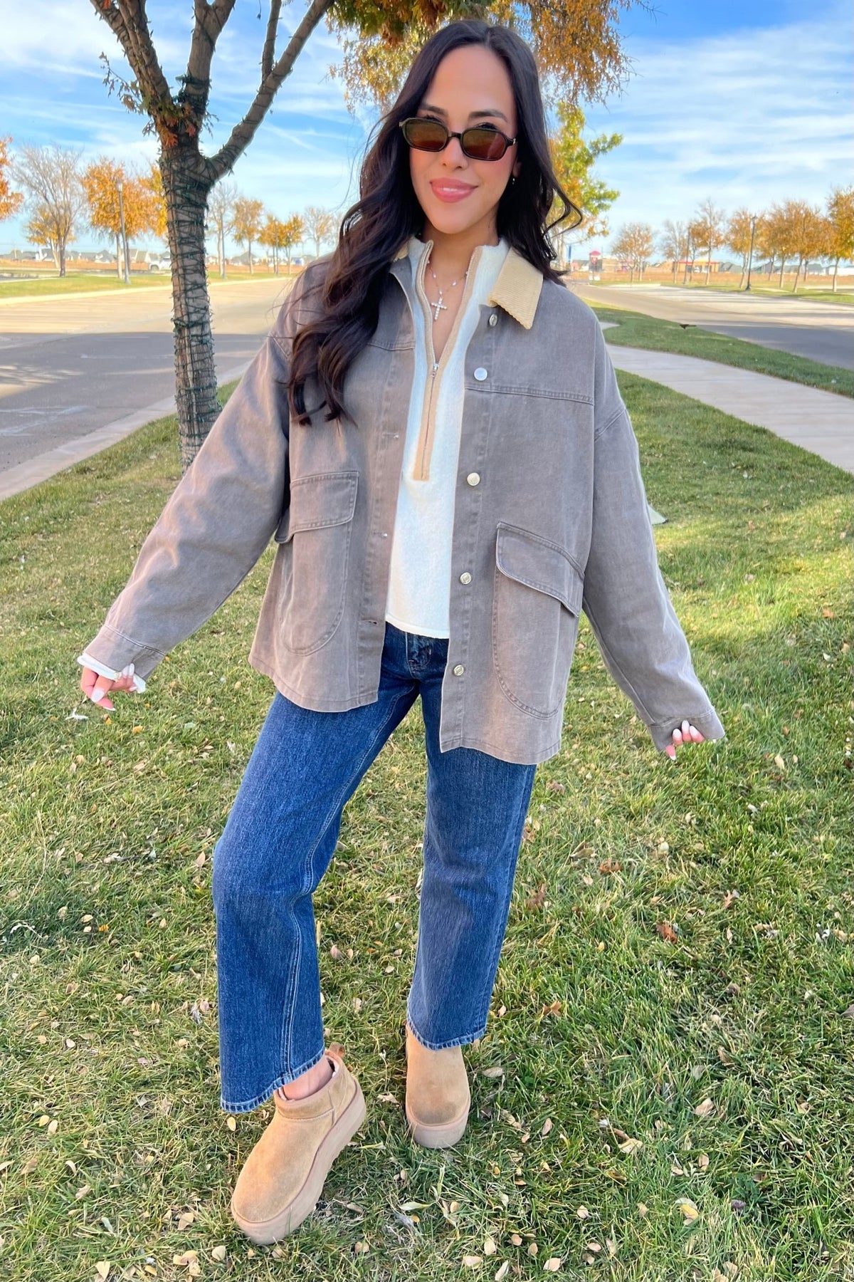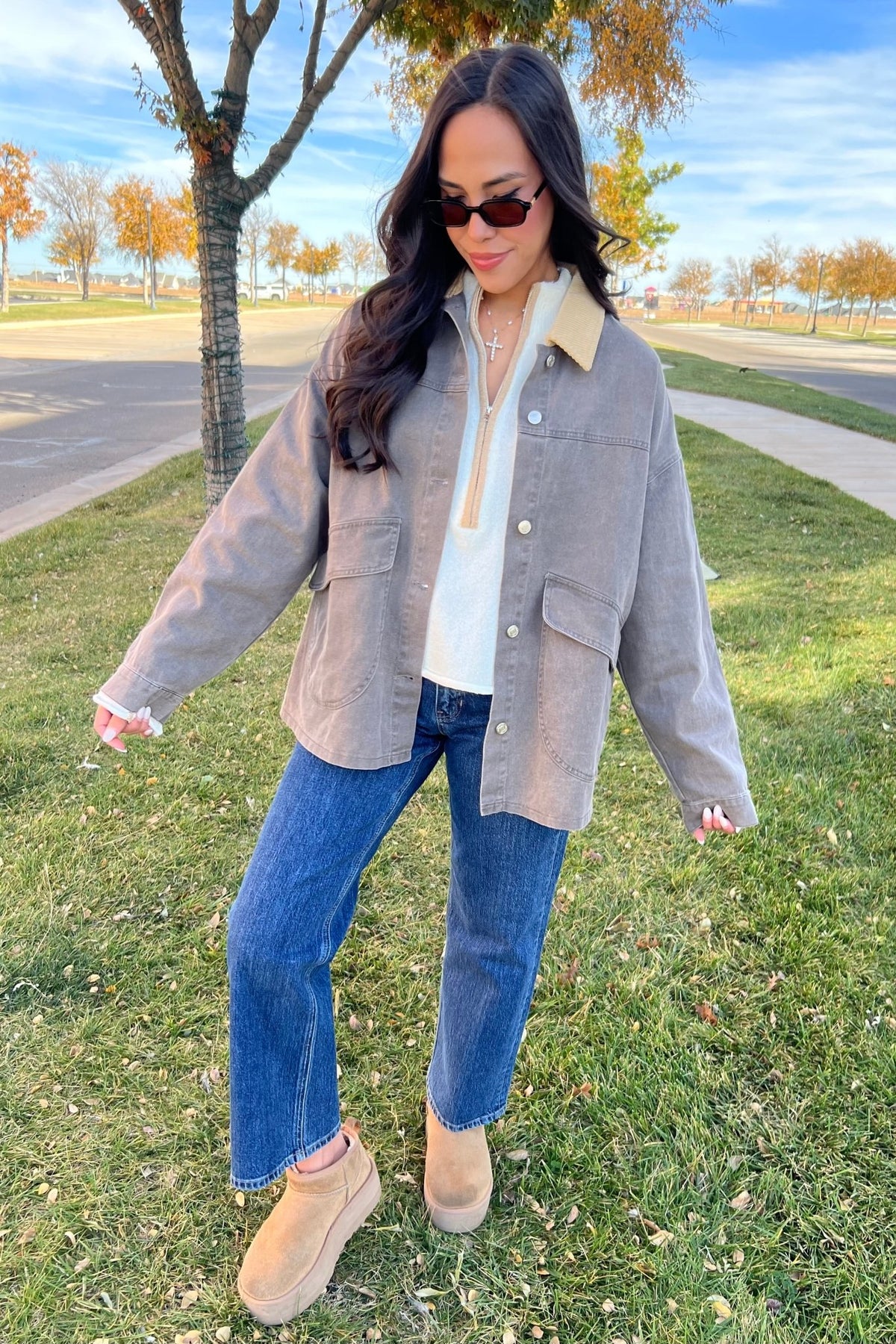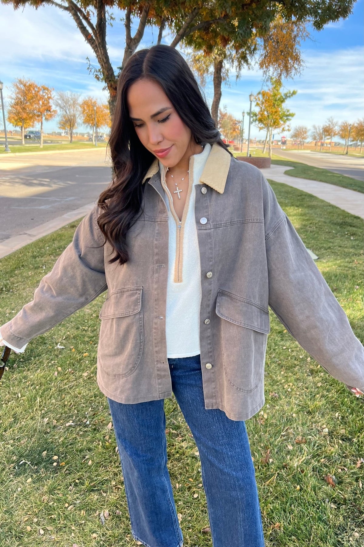 An oversized utility jacket in washed cotton with a contrast collar and deep pockets, giving it a relaxed, lived in feel for everyday wear.