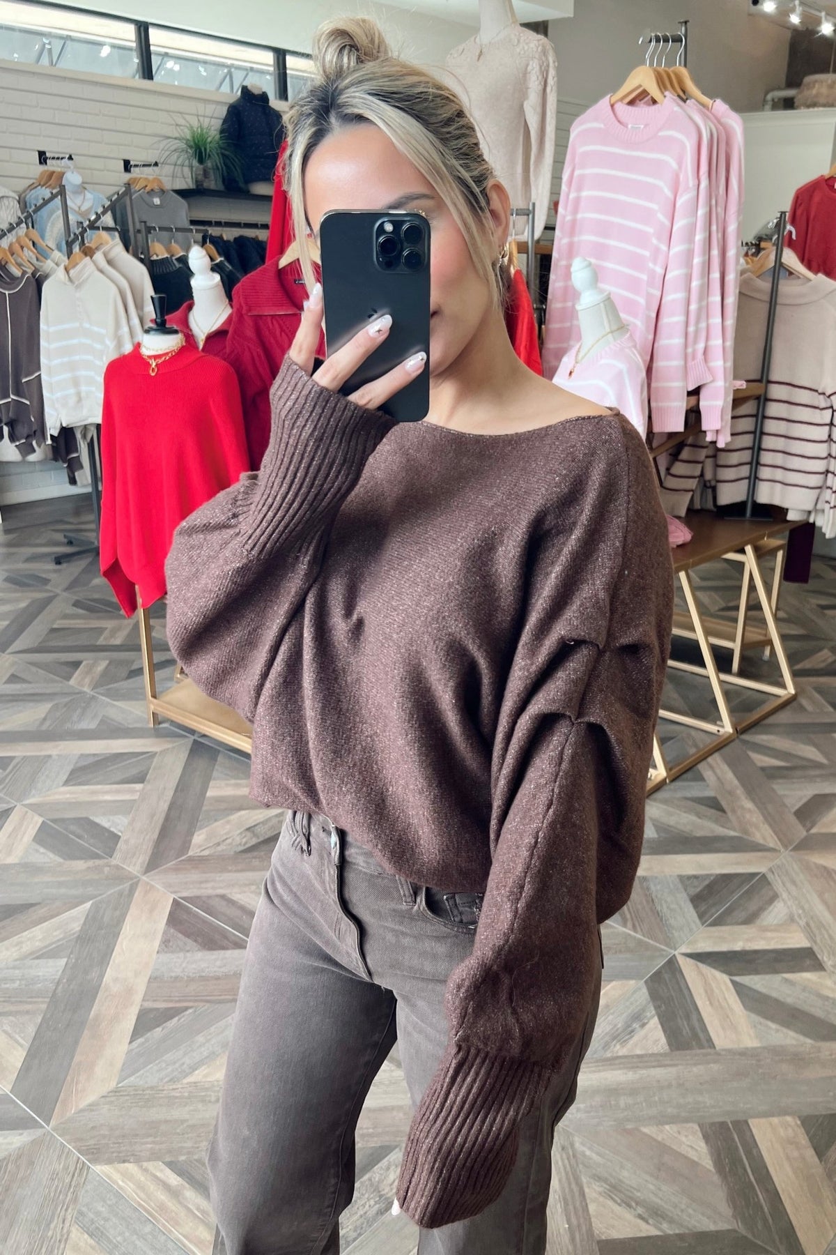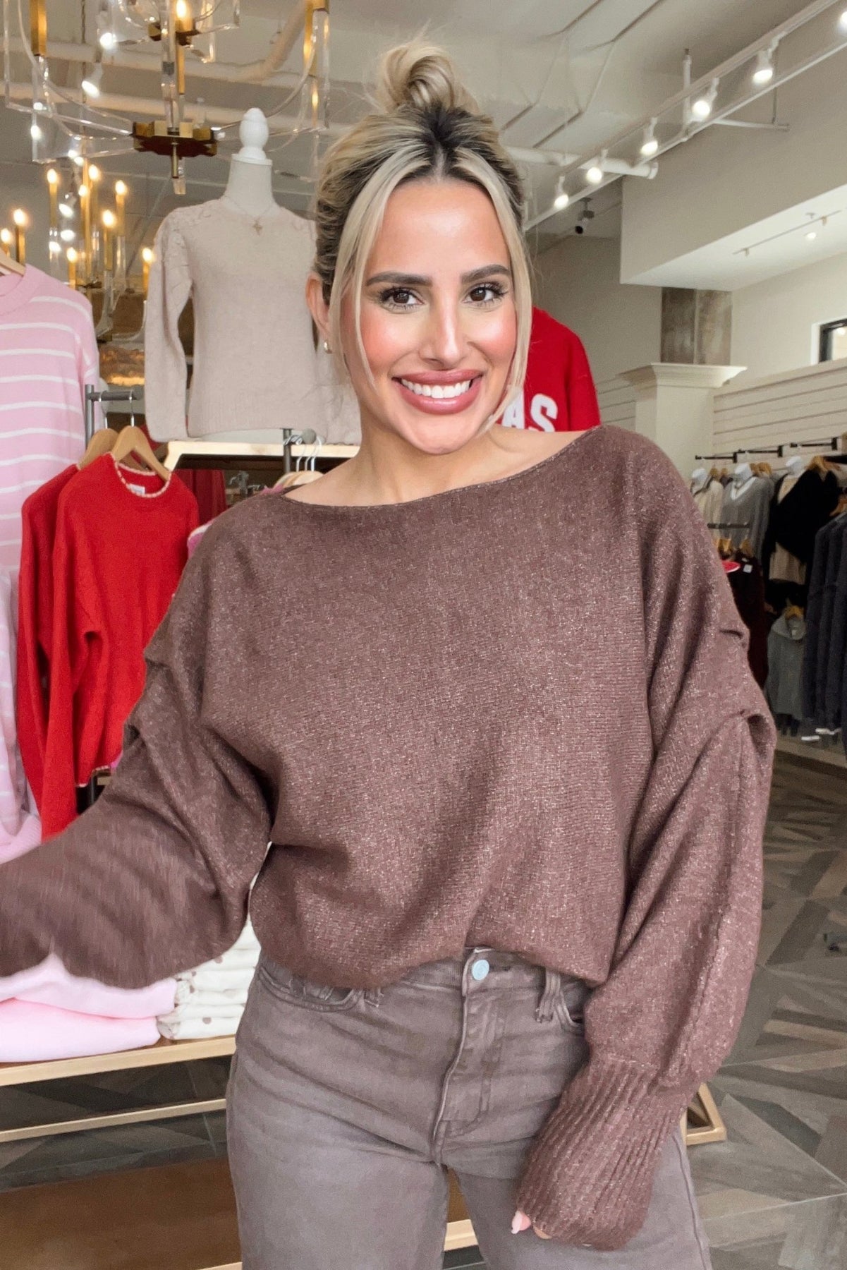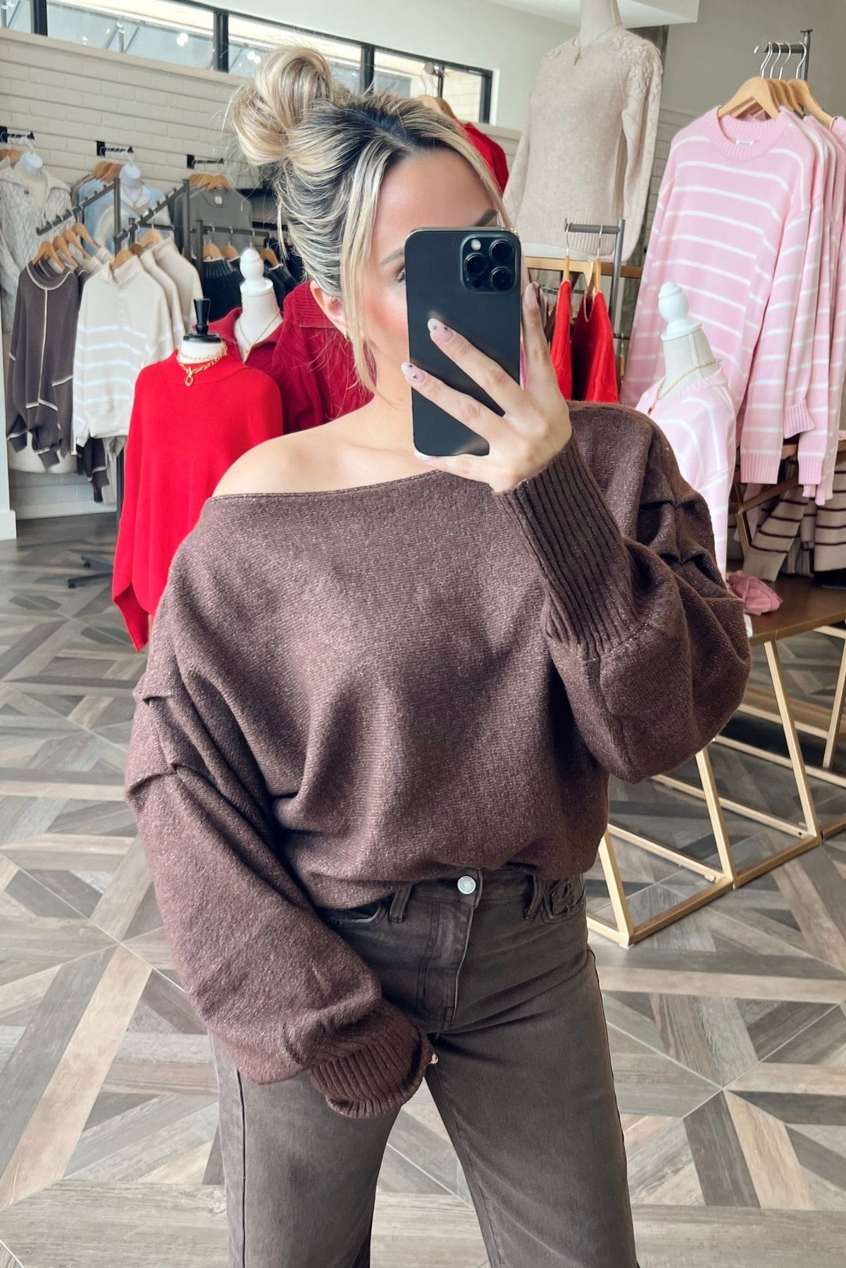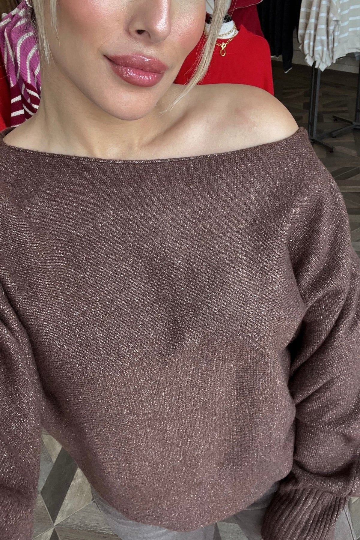An off shoulder cocoa knit with a slouchy, effortless drape you’ll reach for again and again.