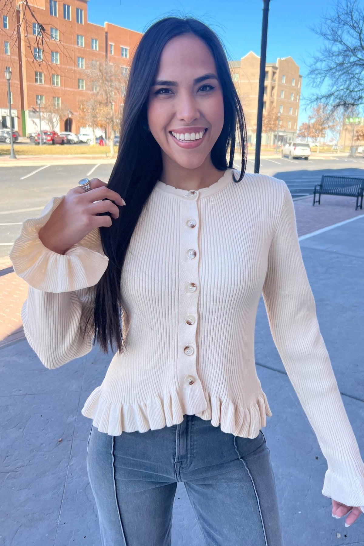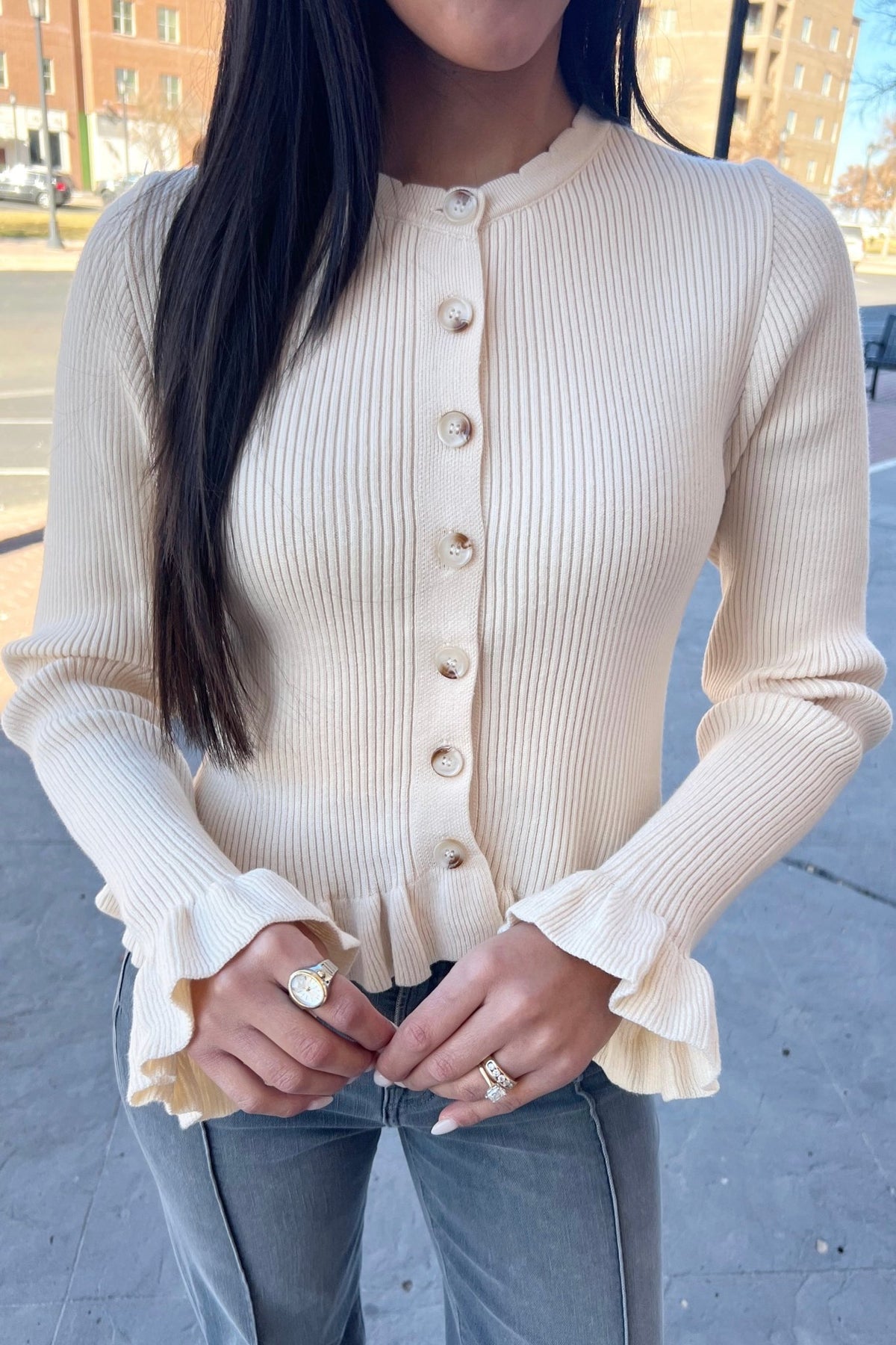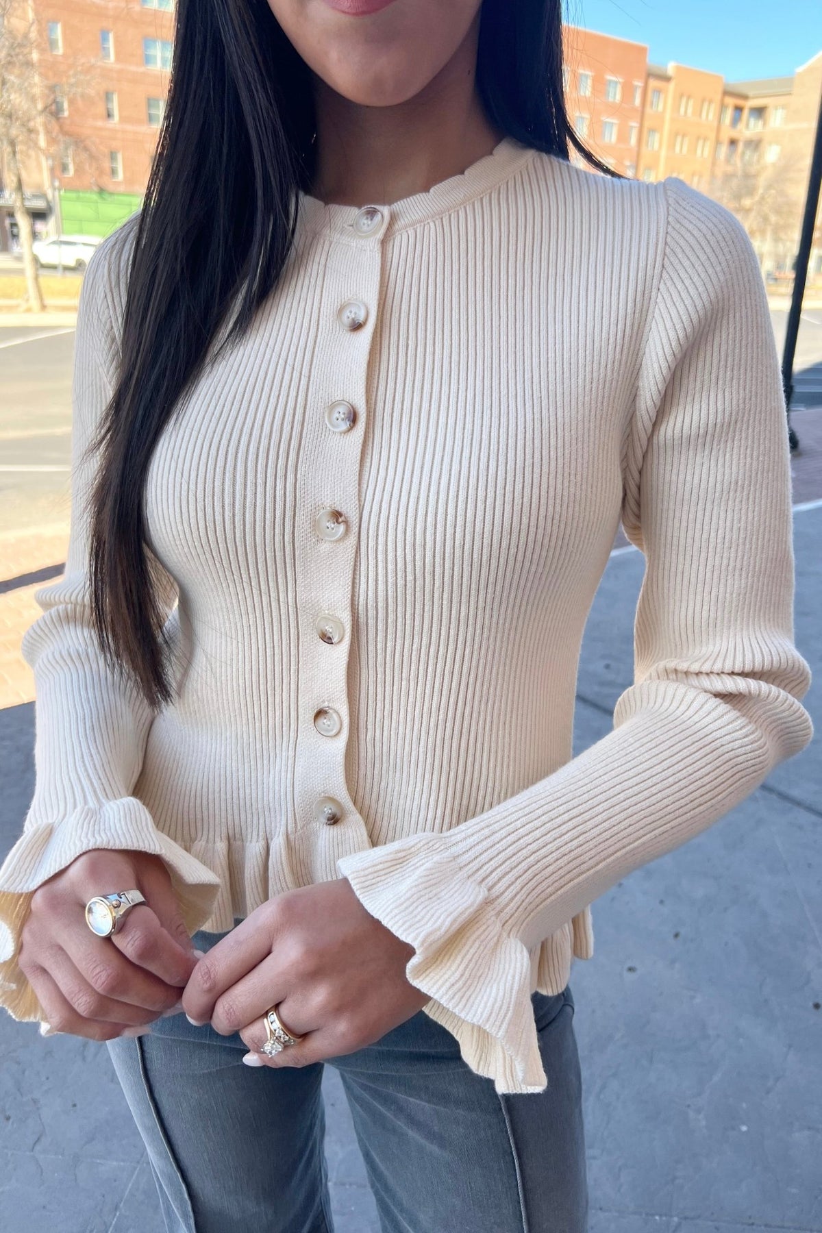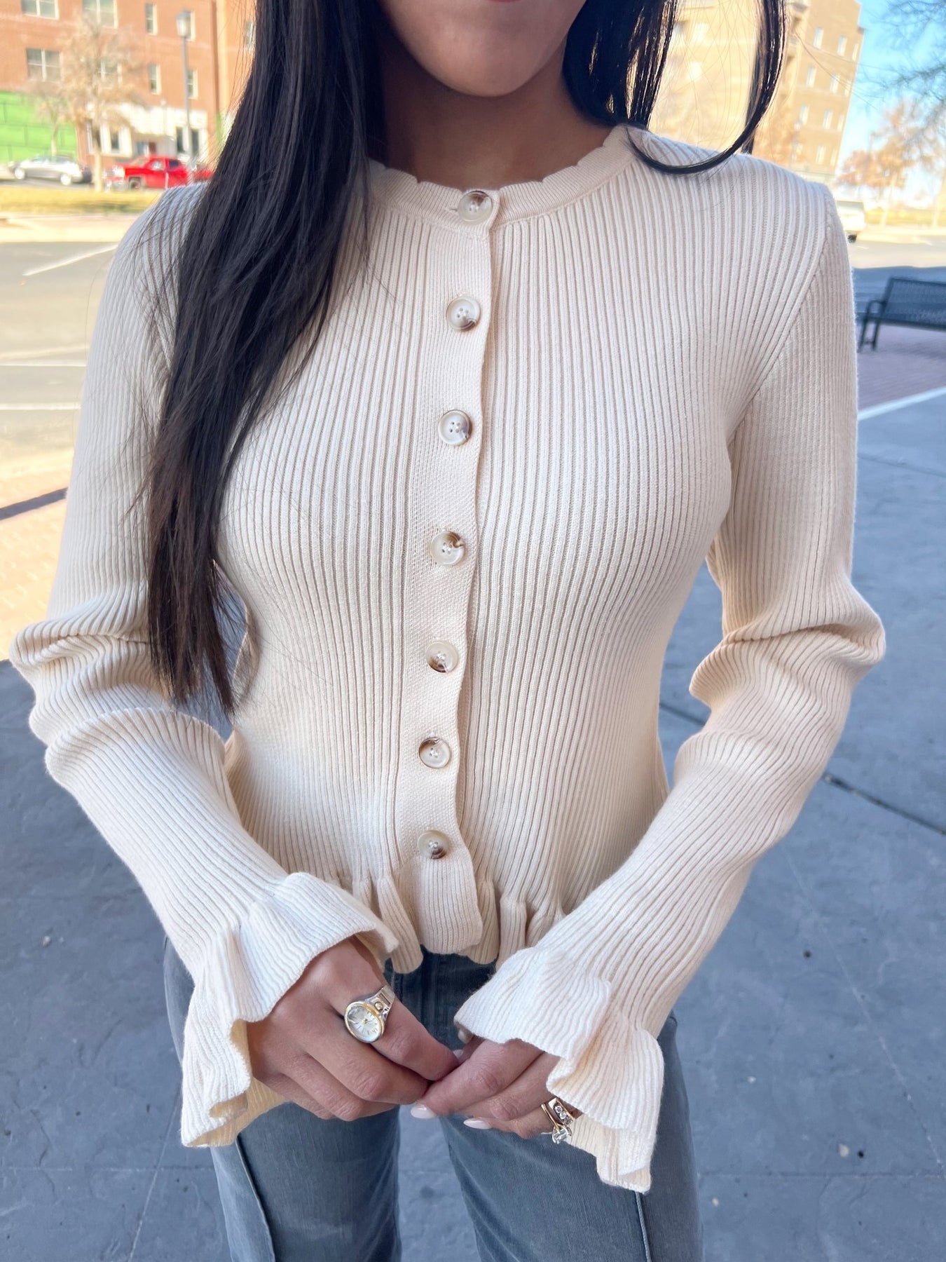 This soft ivory cardigan brings all the cozy vibes with its ribbed texture, pearl style buttons, and subtle ruffle trim on the sleeves and hem. Stretchy, feminine, and perfect for layering over denim or dressing up with skirts, your new go-to for cute, polished days.