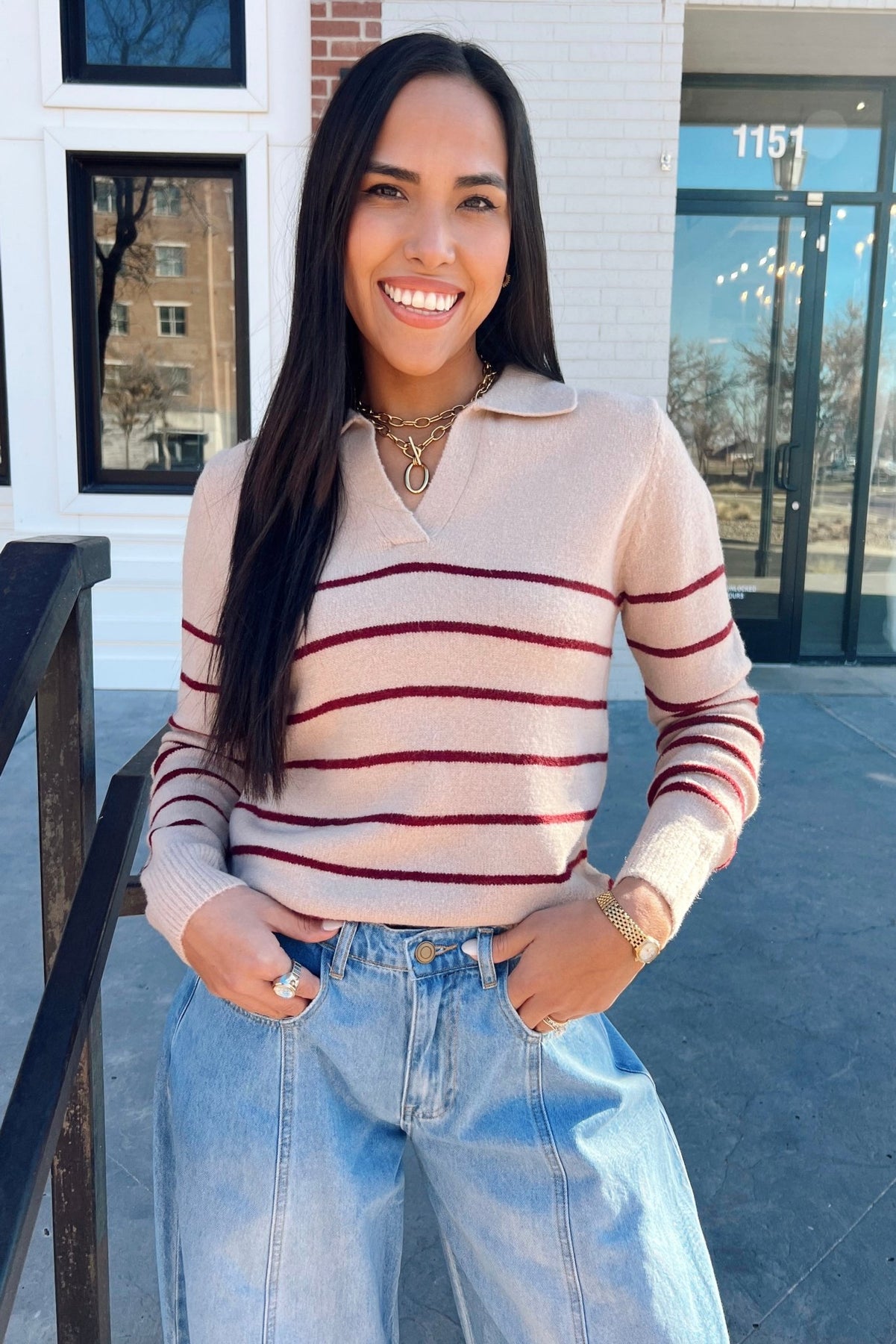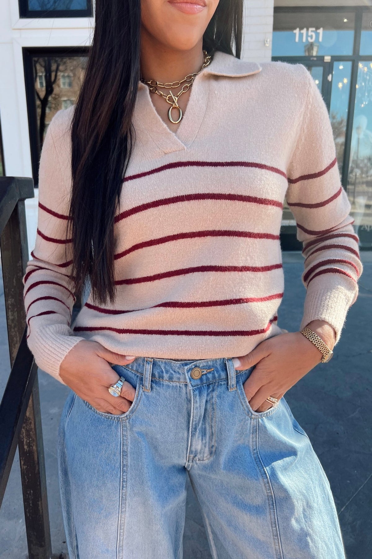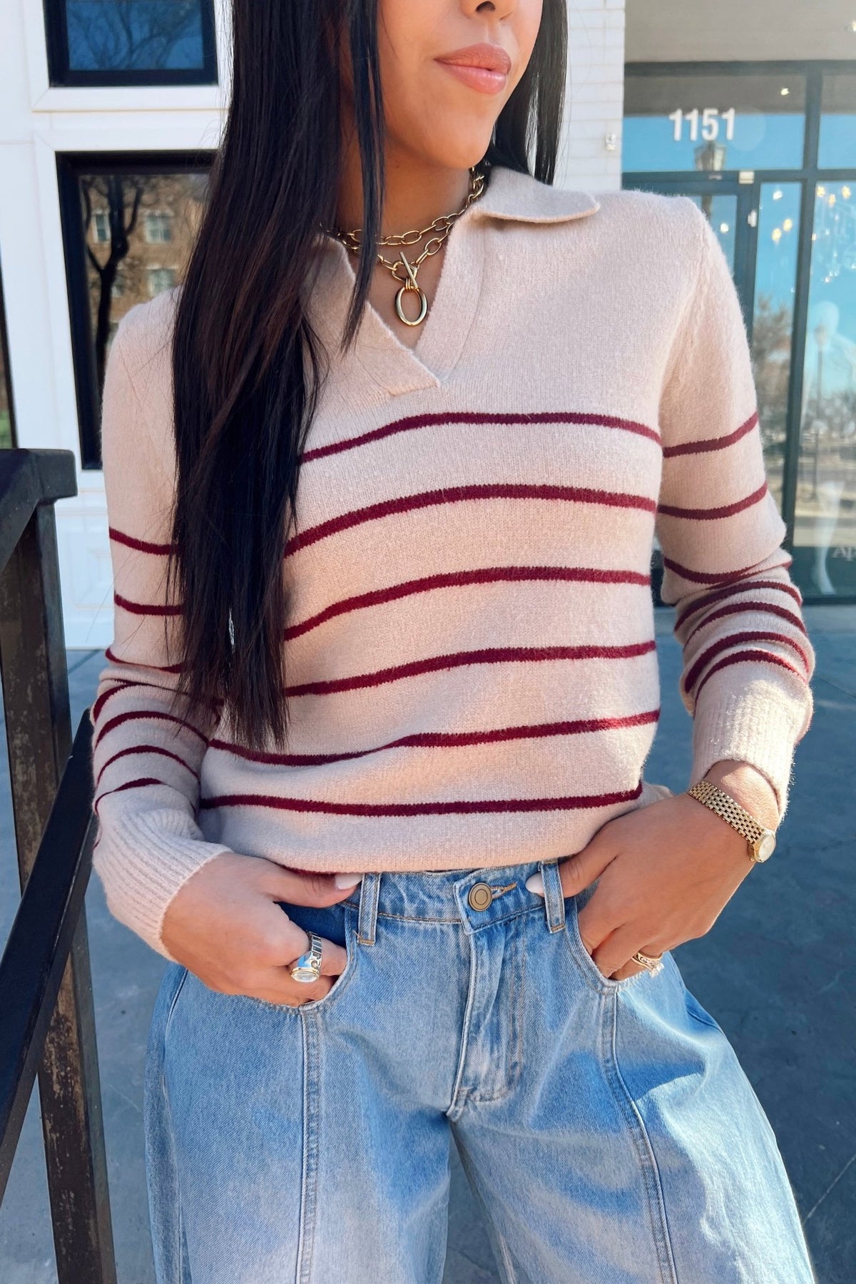 A timeless collared sweater with clean stripes and a super soft feel. The beige base keeps it neutral while the cranberry lines add just the right hint of color. Works with jeans, trousers, or holiday skirts: easy, pretty, and polished.