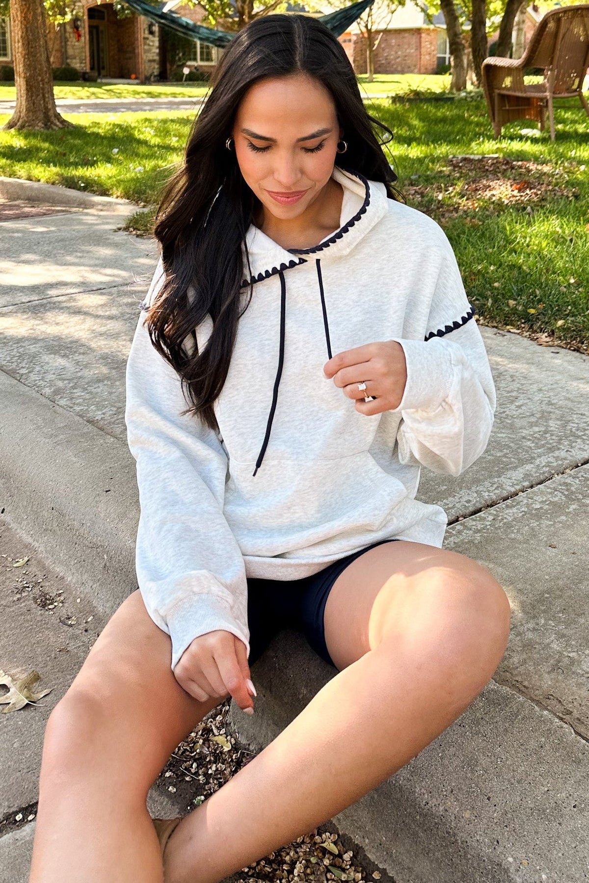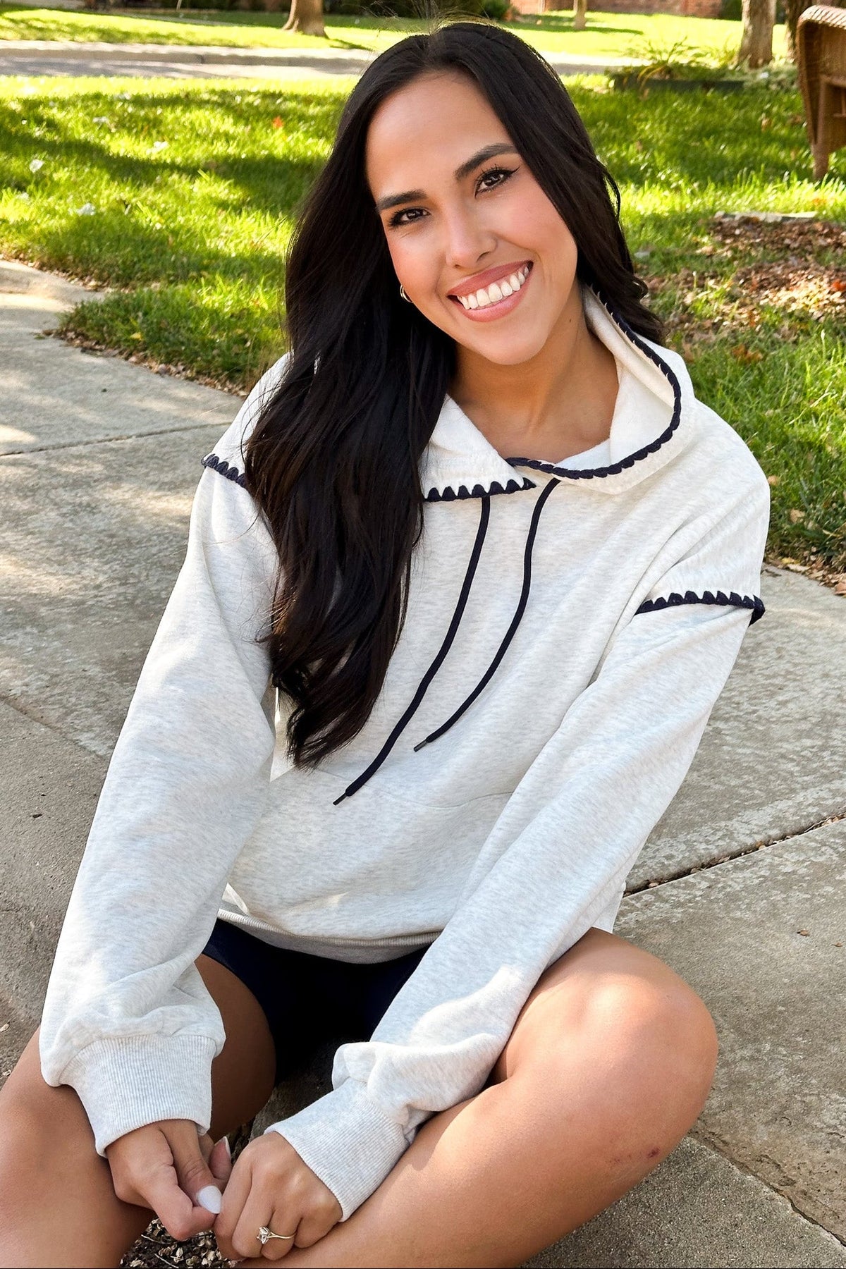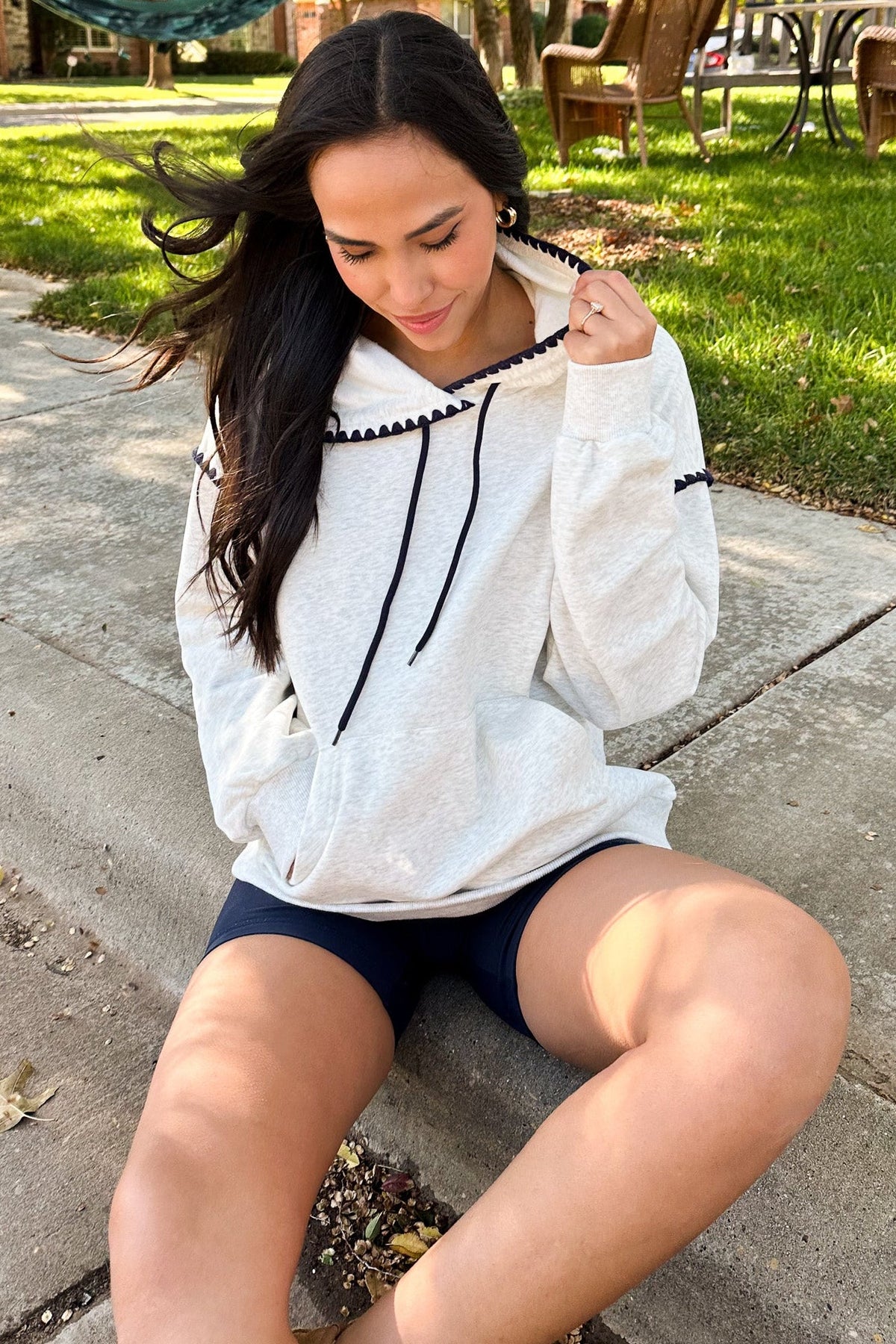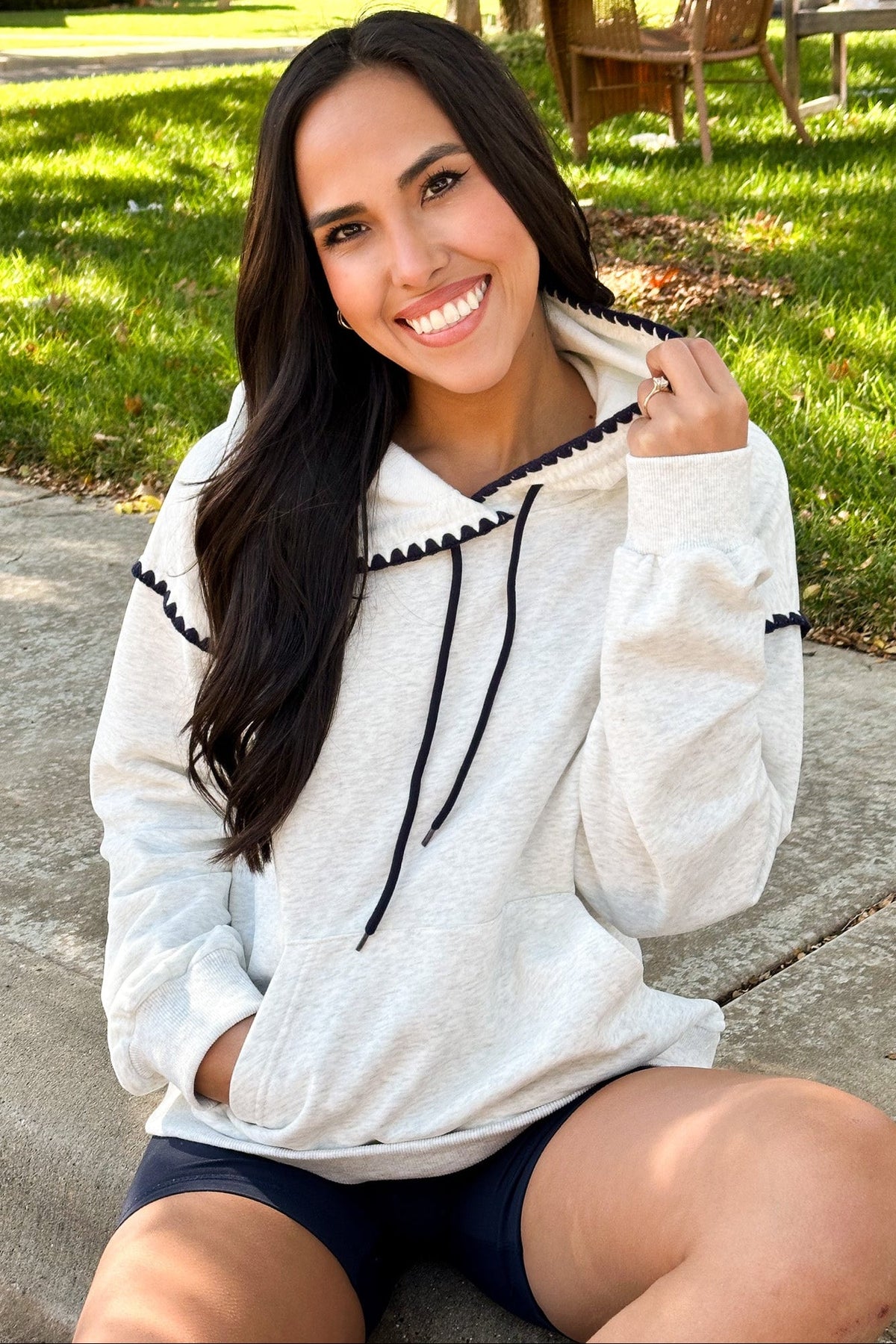 Laid back never looked so cute. This heather grey hoodie with navy trim details is cozy, soft, and made for those “just one more coffee” kind of days.