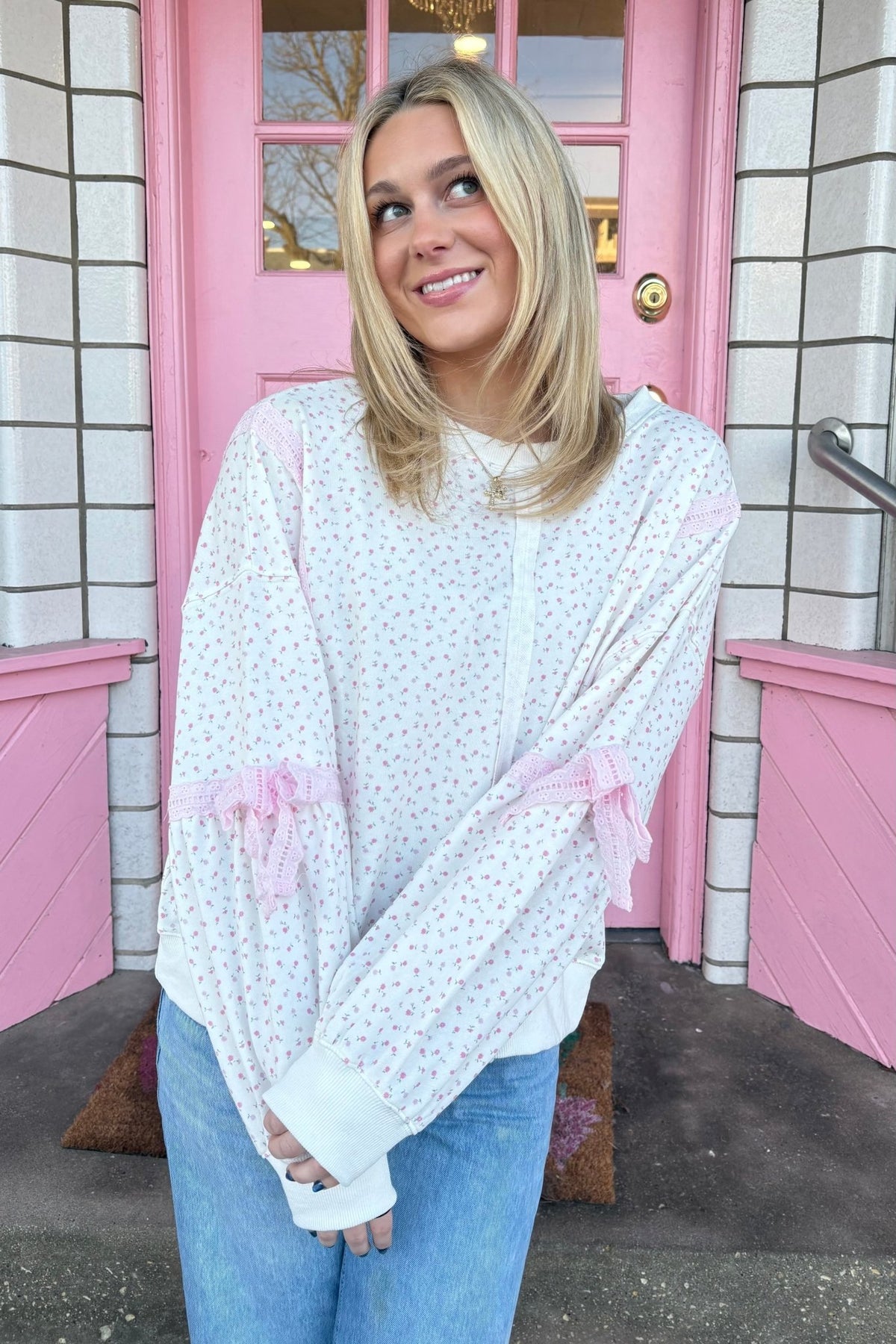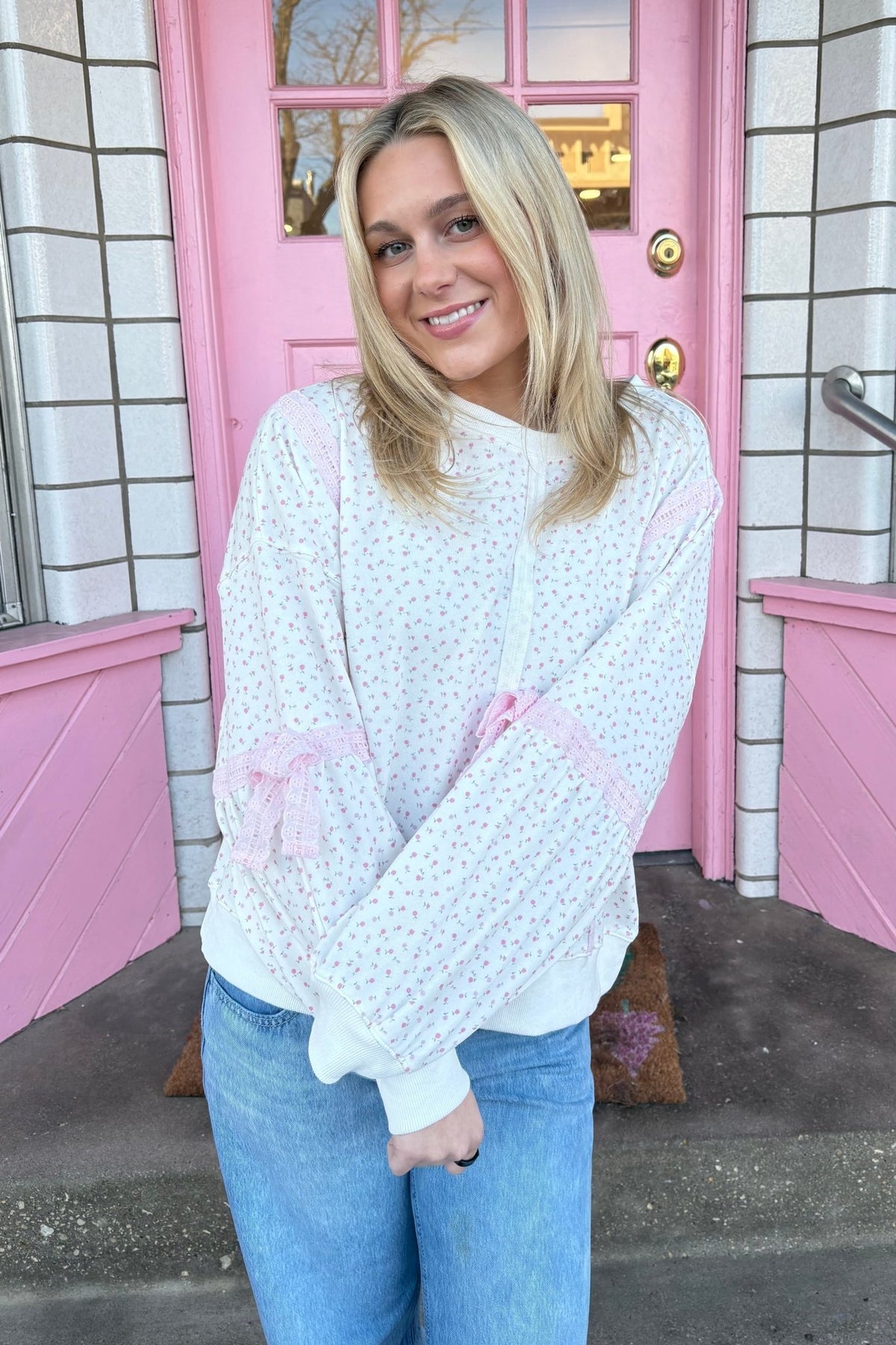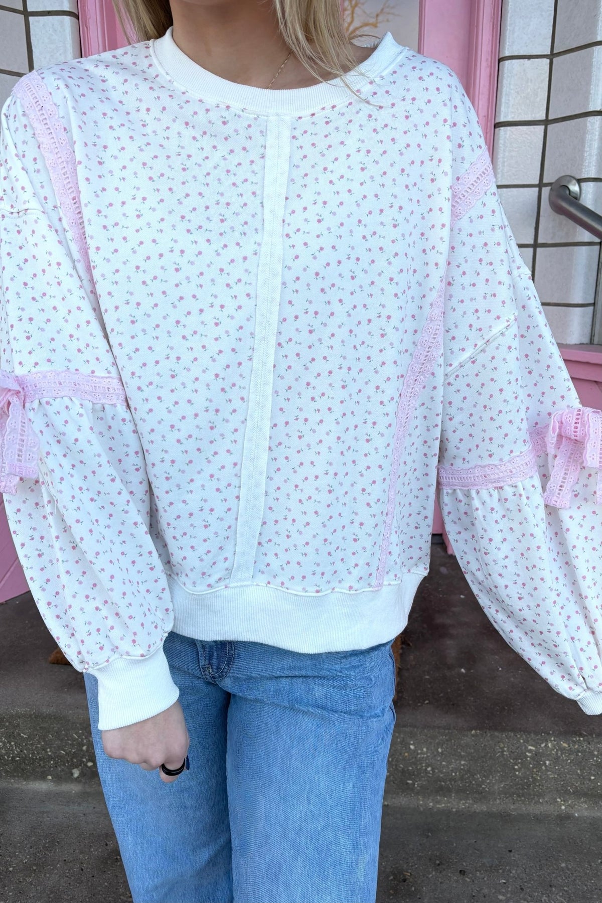 A floral speckled sweatshirt finished with lace trim and tie details. She's feminine without being fussy.