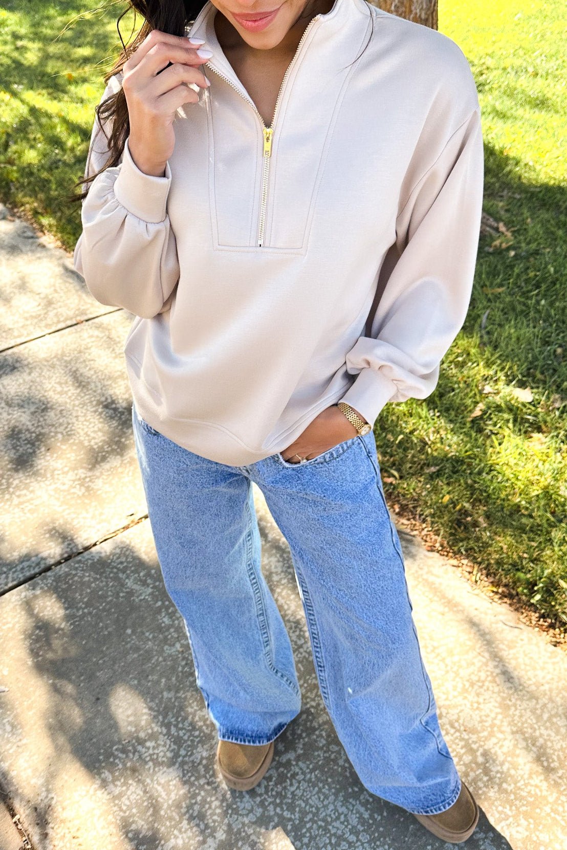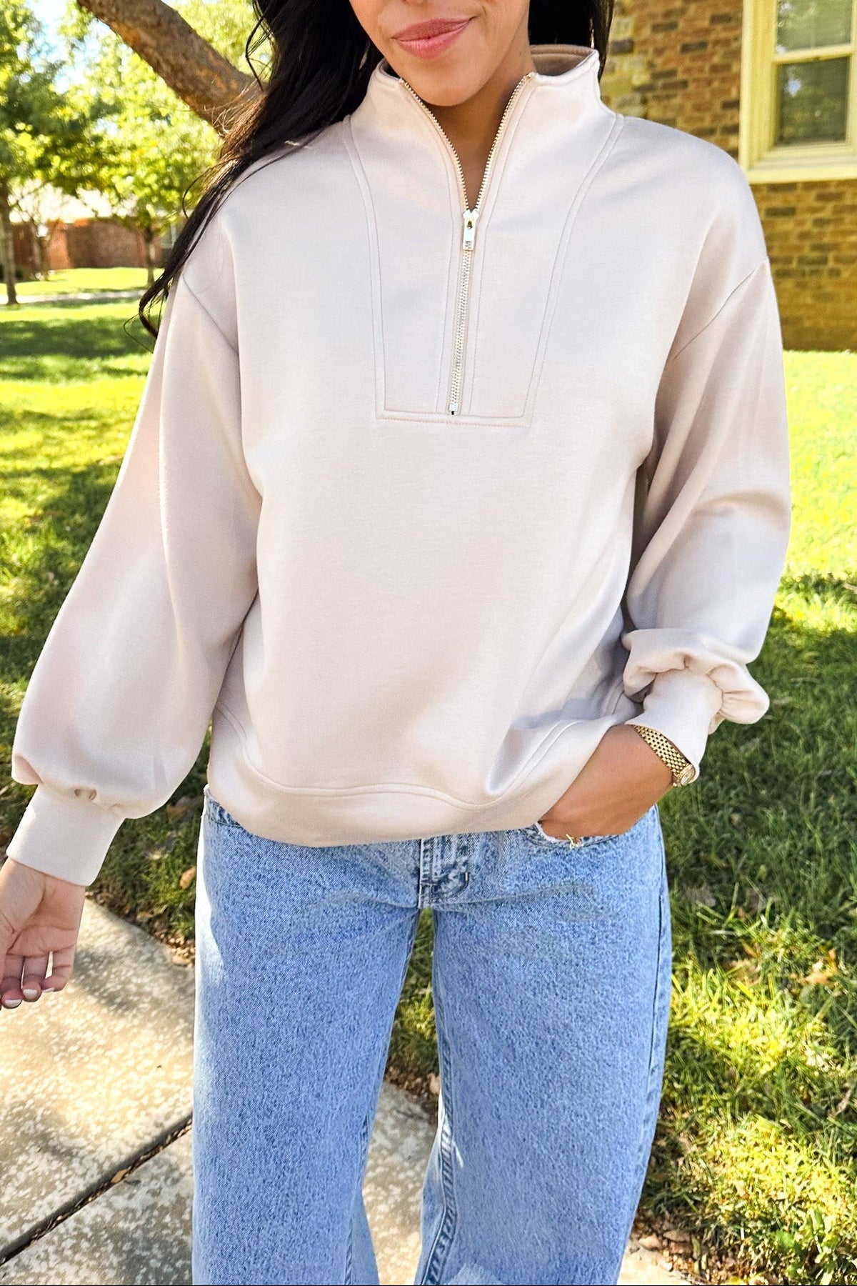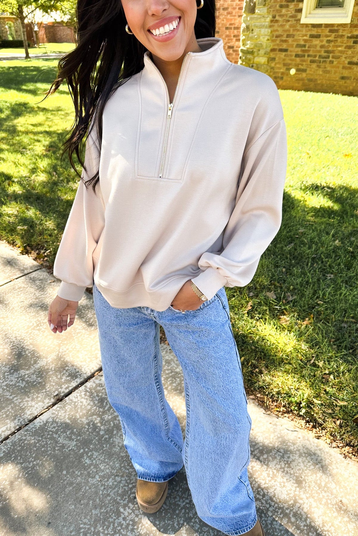 That effortless blend of comfort and polish. This taupe colored pullover with a gold half zipper has a relaxed fit and luxe feel that looks just as good with denim as it does with leggings.