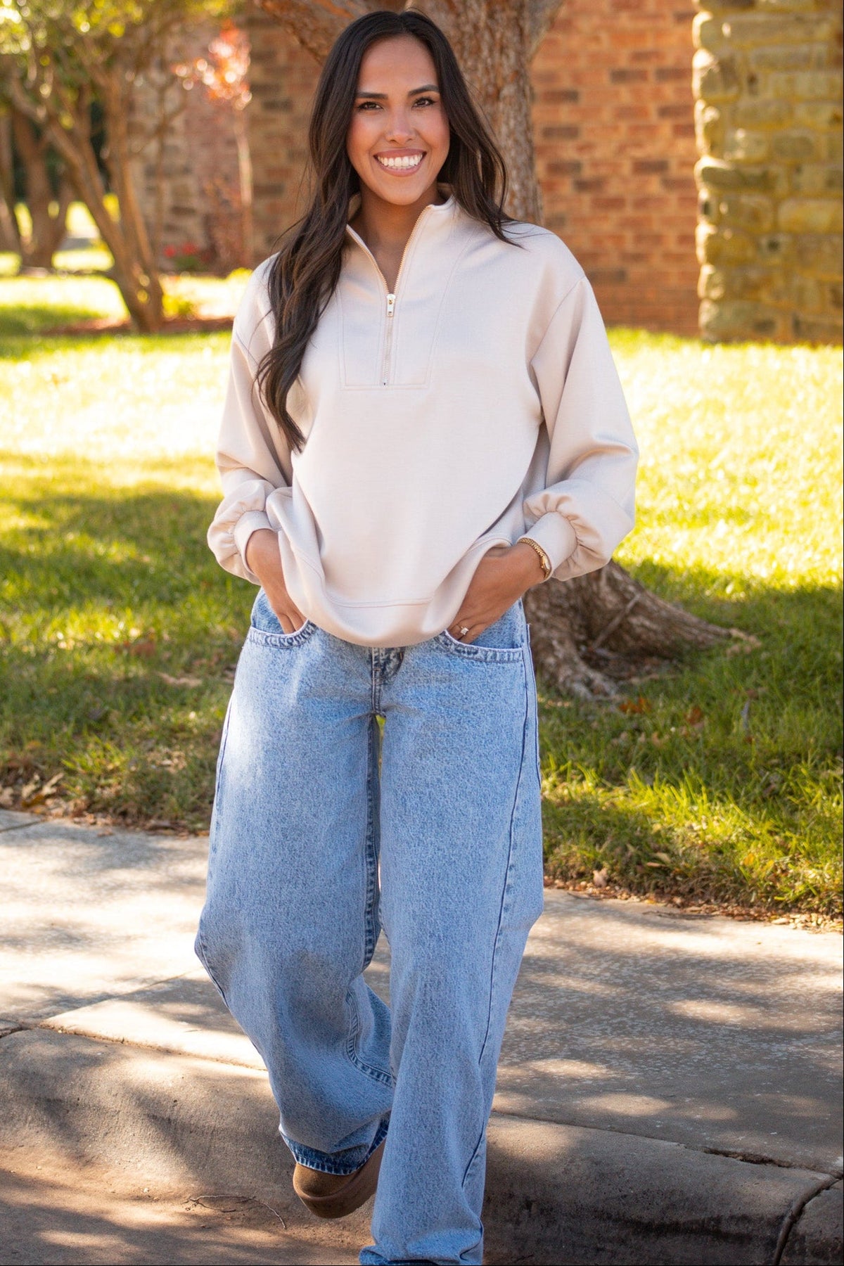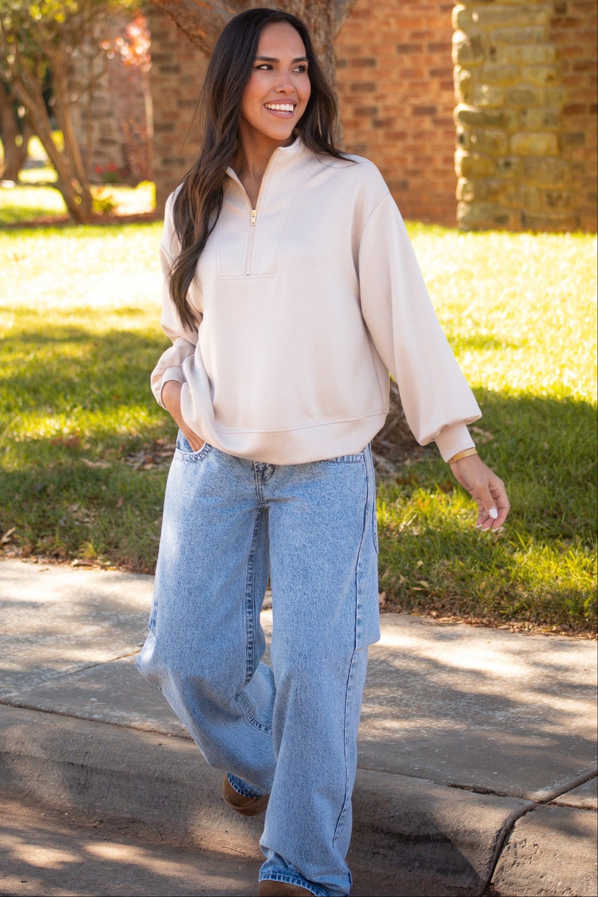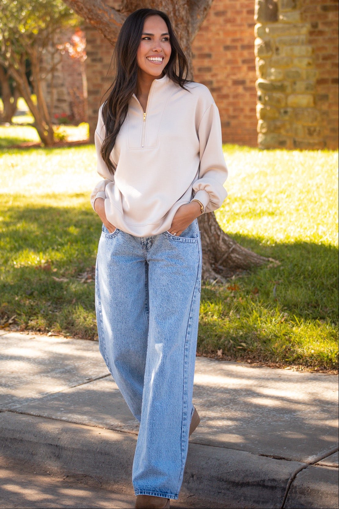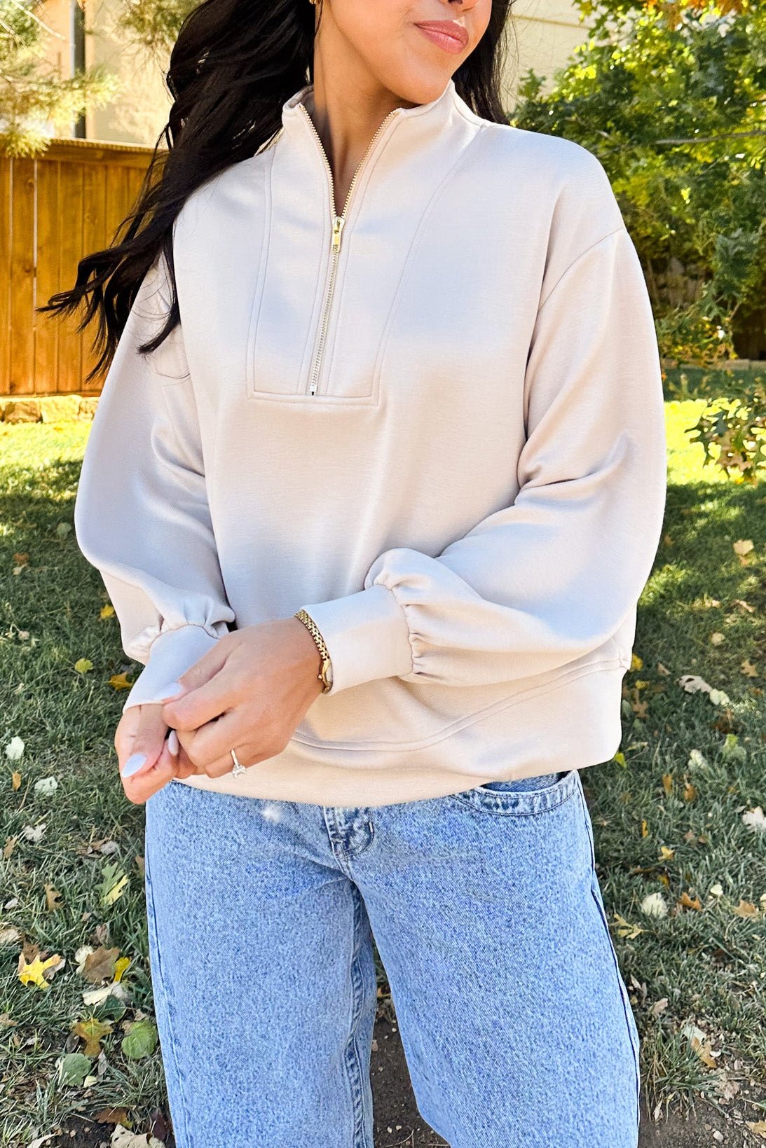 That effortless blend of comfort and polish. This taupe colored pullover with a gold half zipper has a relaxed fit and luxe feel that looks just as good with denim as it does with leggings.