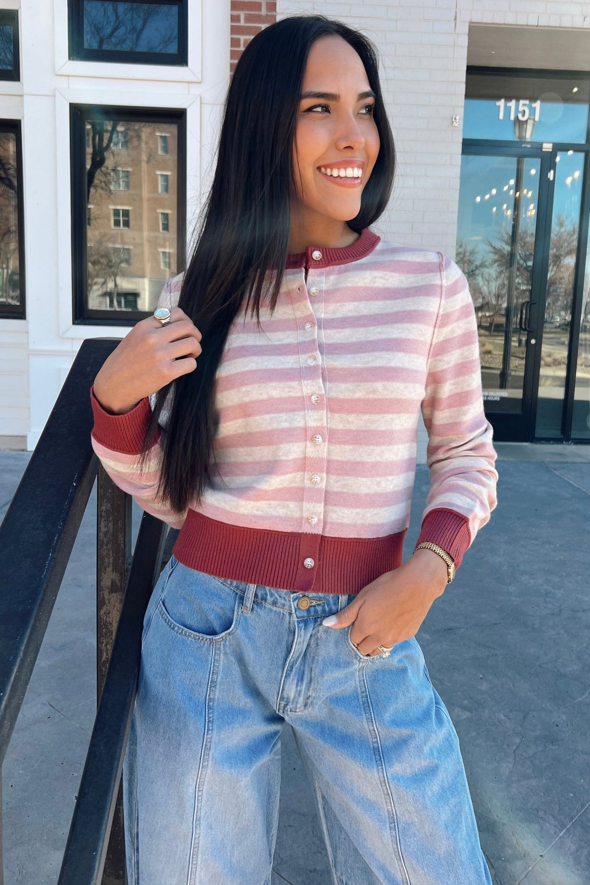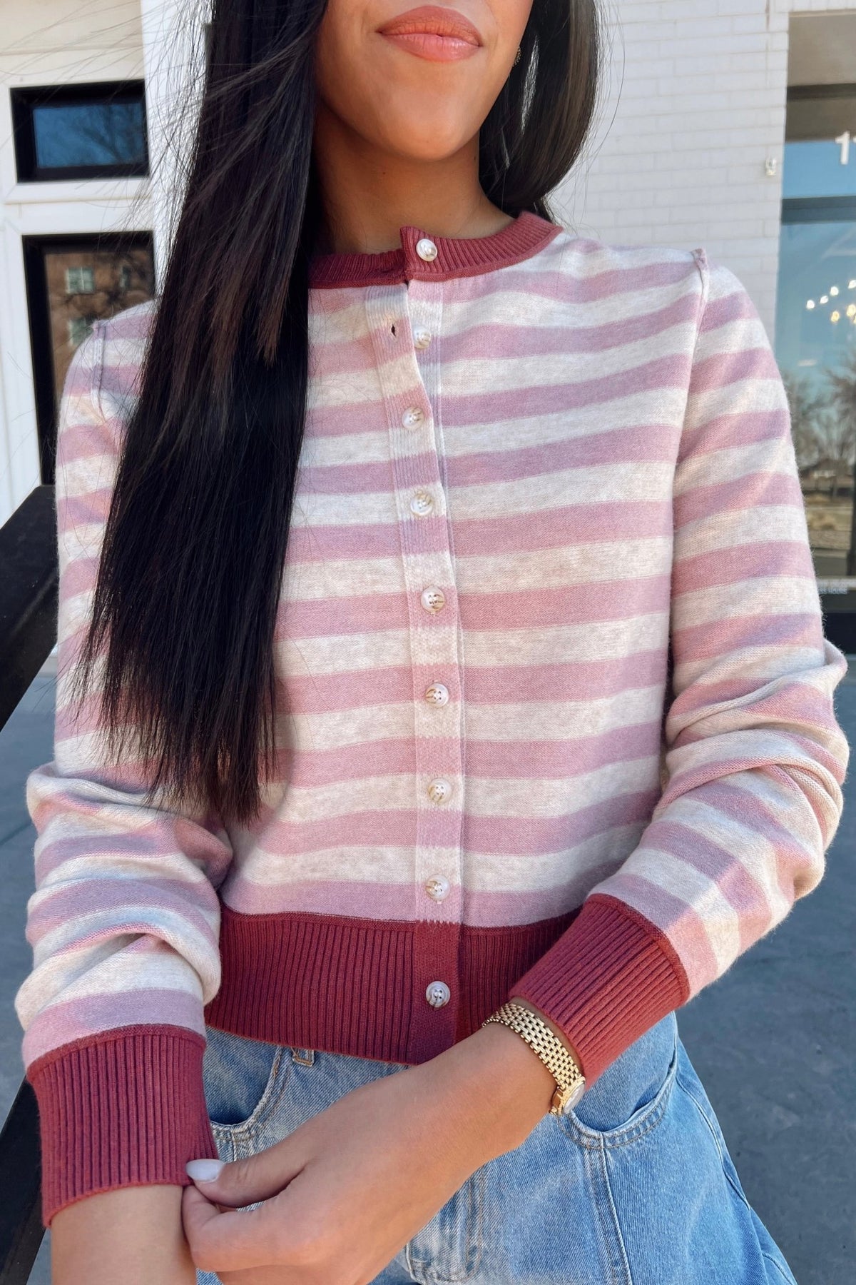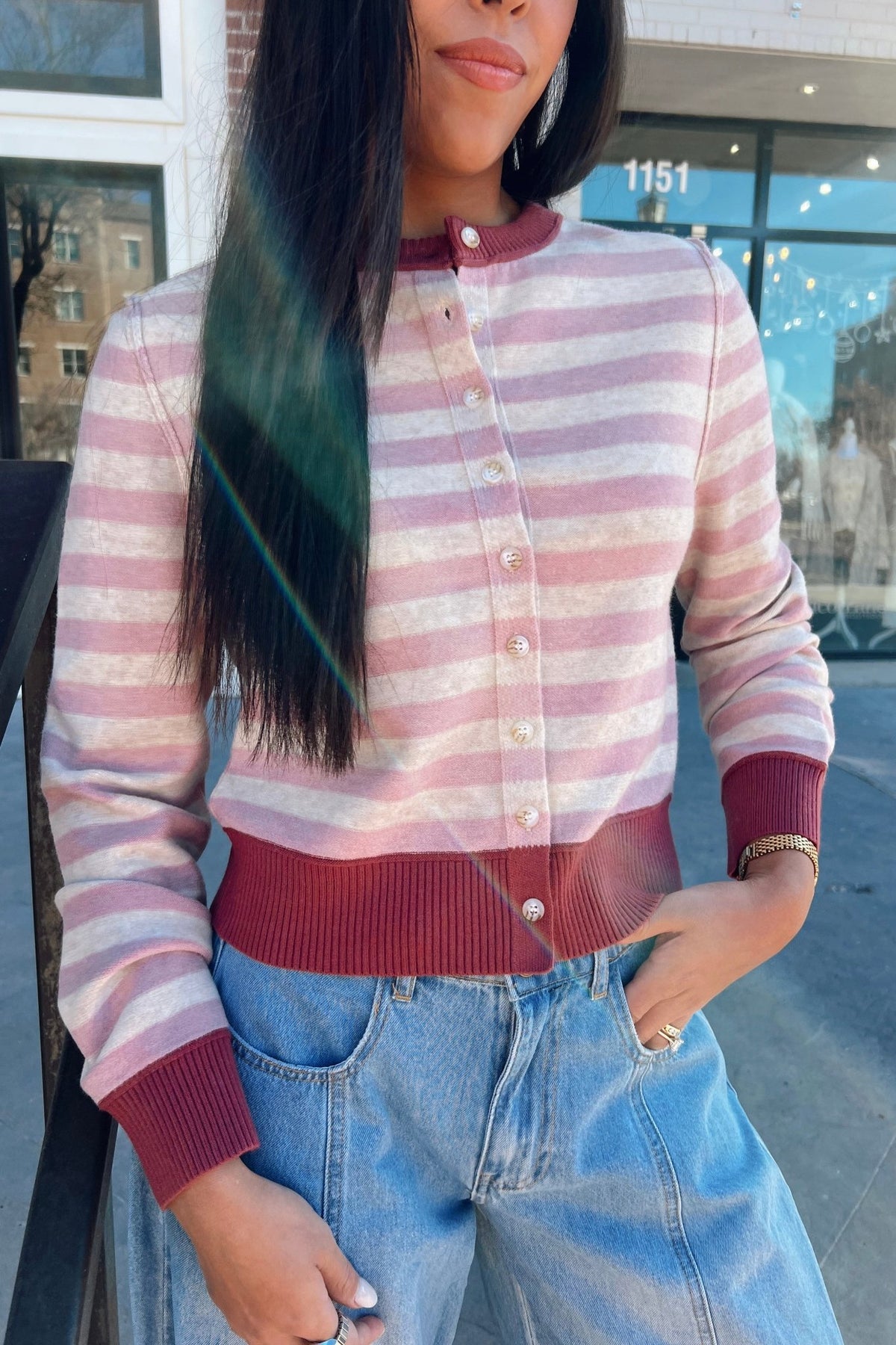Soft stripes, sweet buttons, and a relaxed fit, this cardigan is the definition of easy comfort. The rose and cranberry tones add a warm touch, and the ribbed trim keeps it structured enough for polished outfits. Wear it open or closed for two totally different looks.