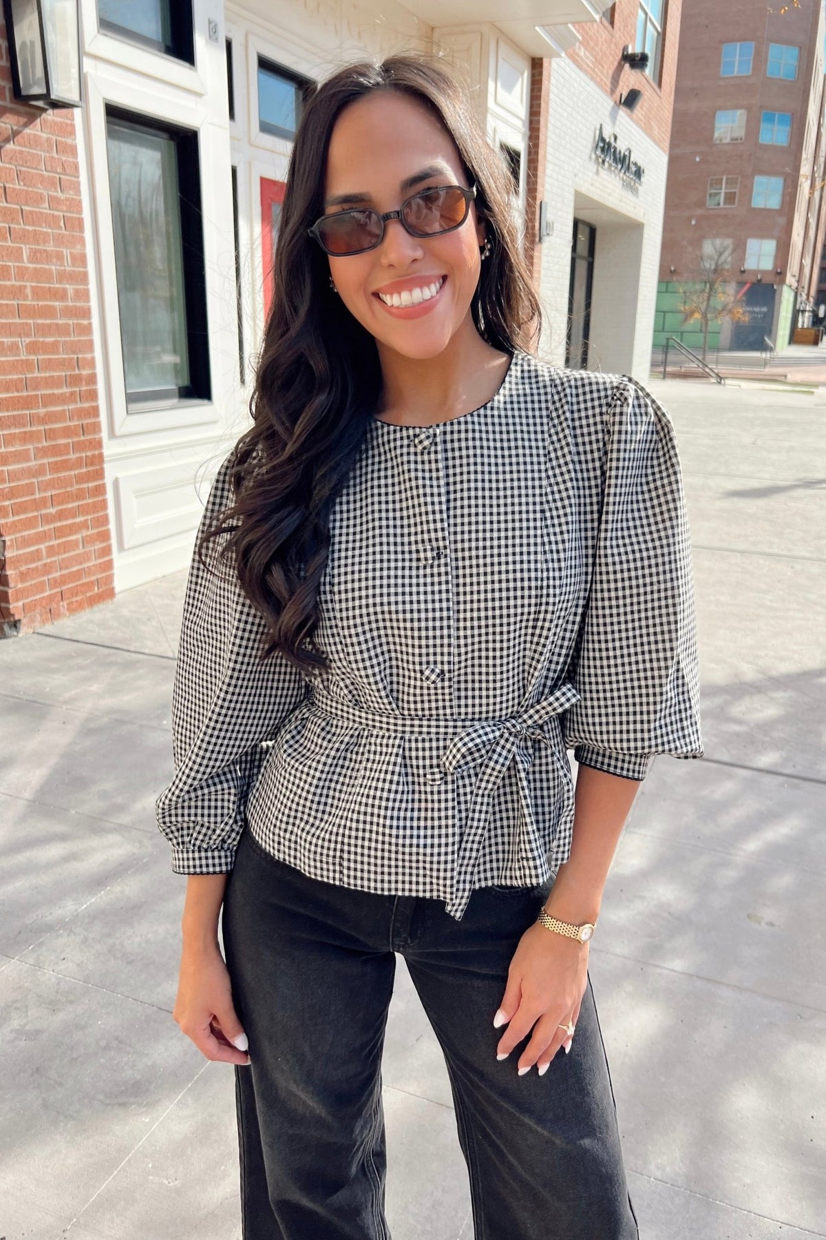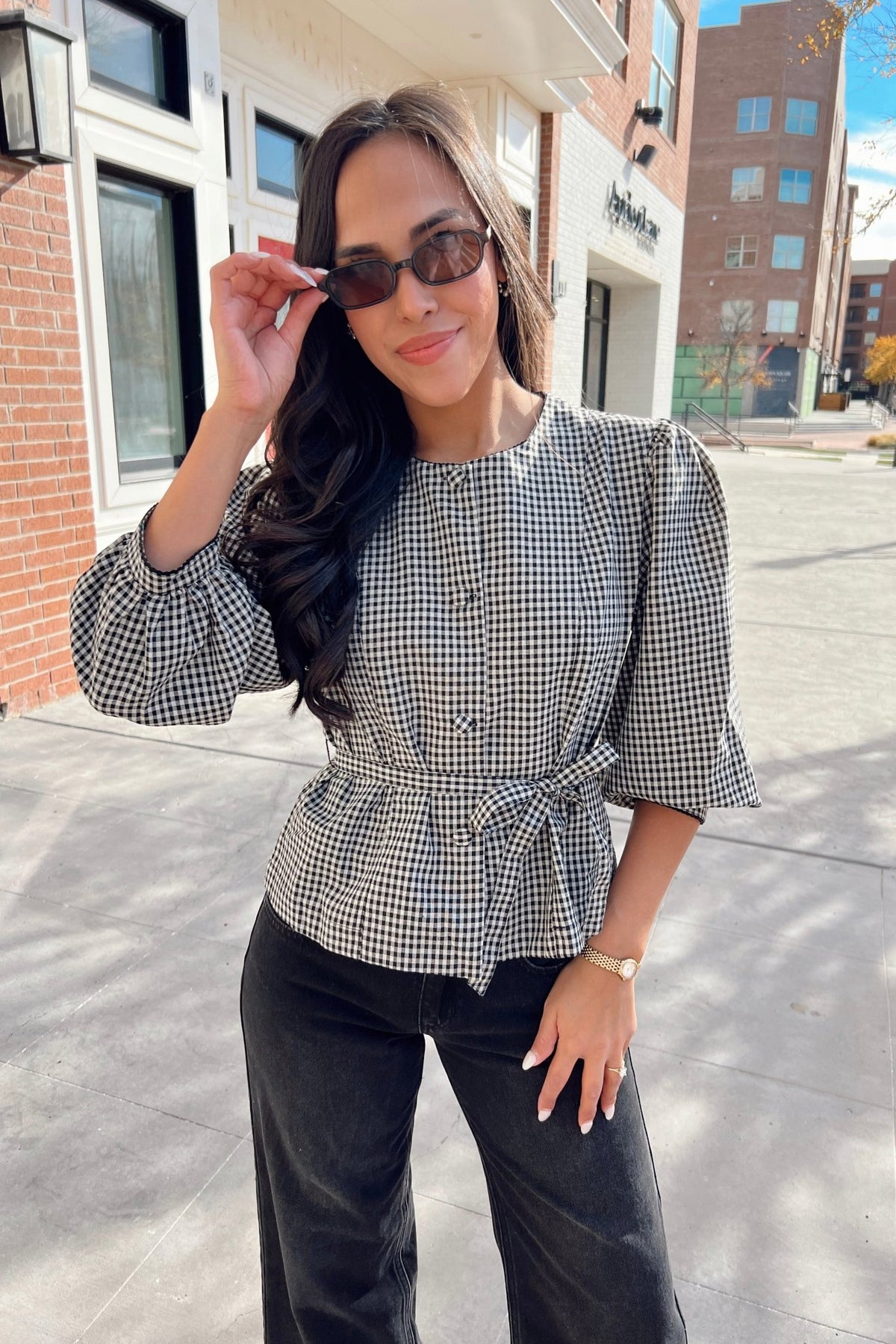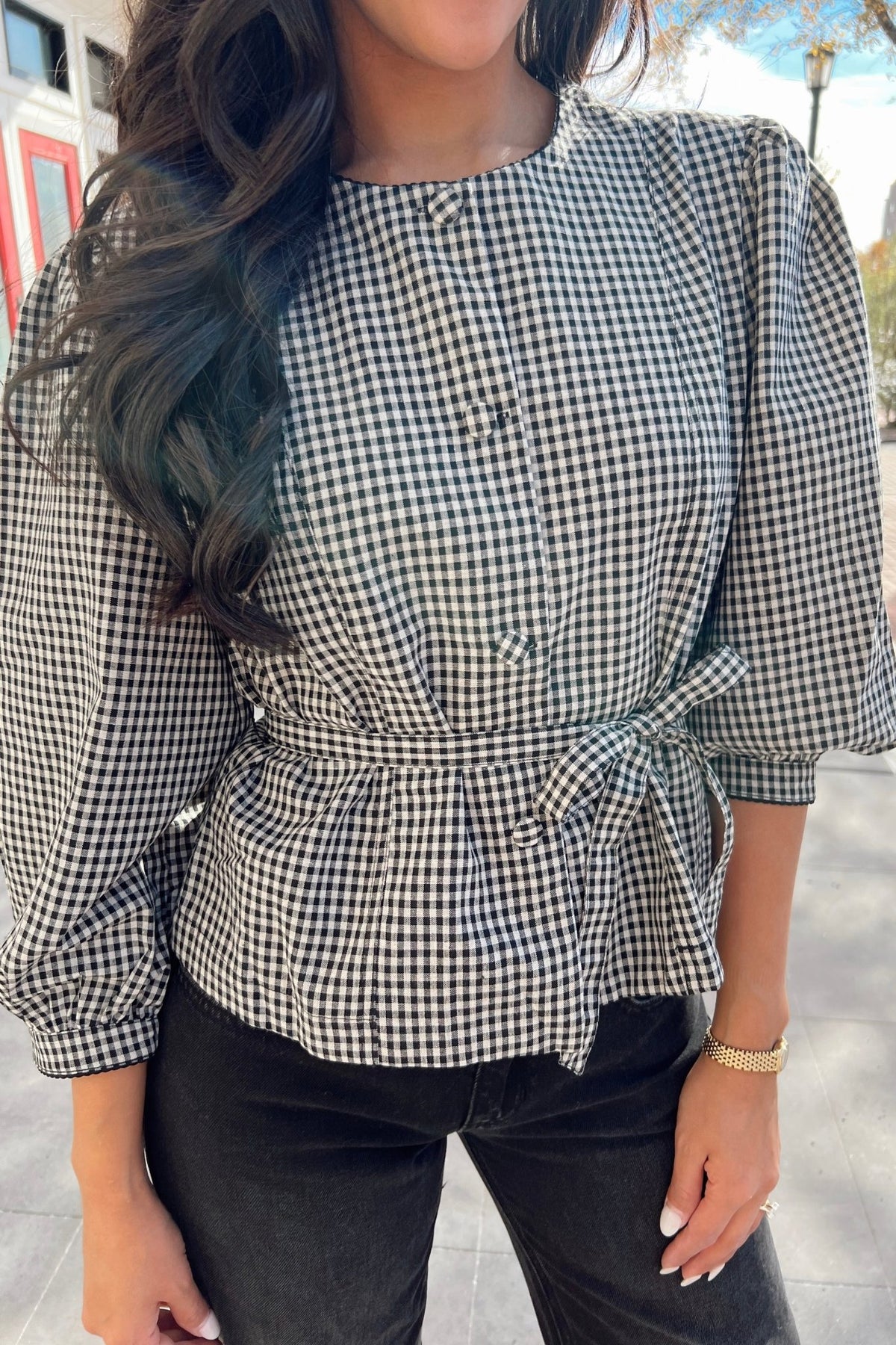 A timeless gingham blouse with a soft linen-cotton blend, puff sleeves, and a flattering tie-waist detail. Feminine, easy, and perfect for fall gatherings.