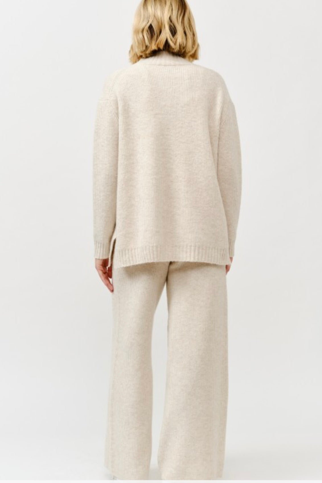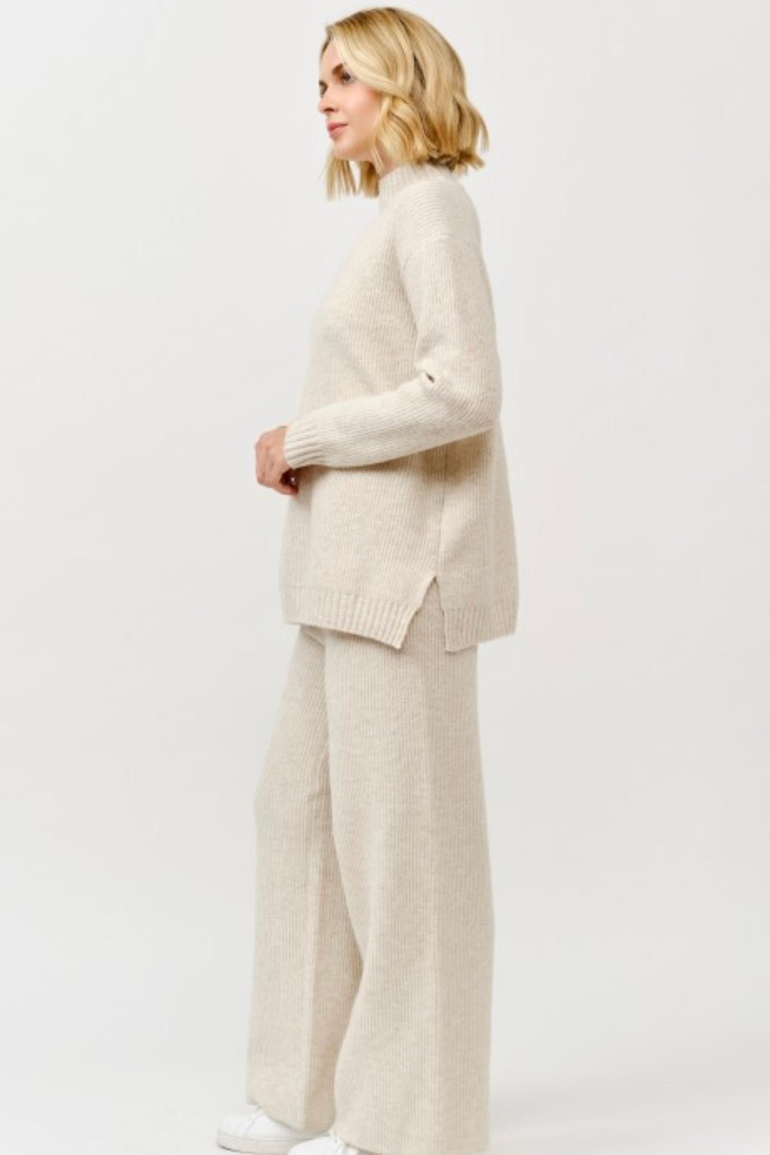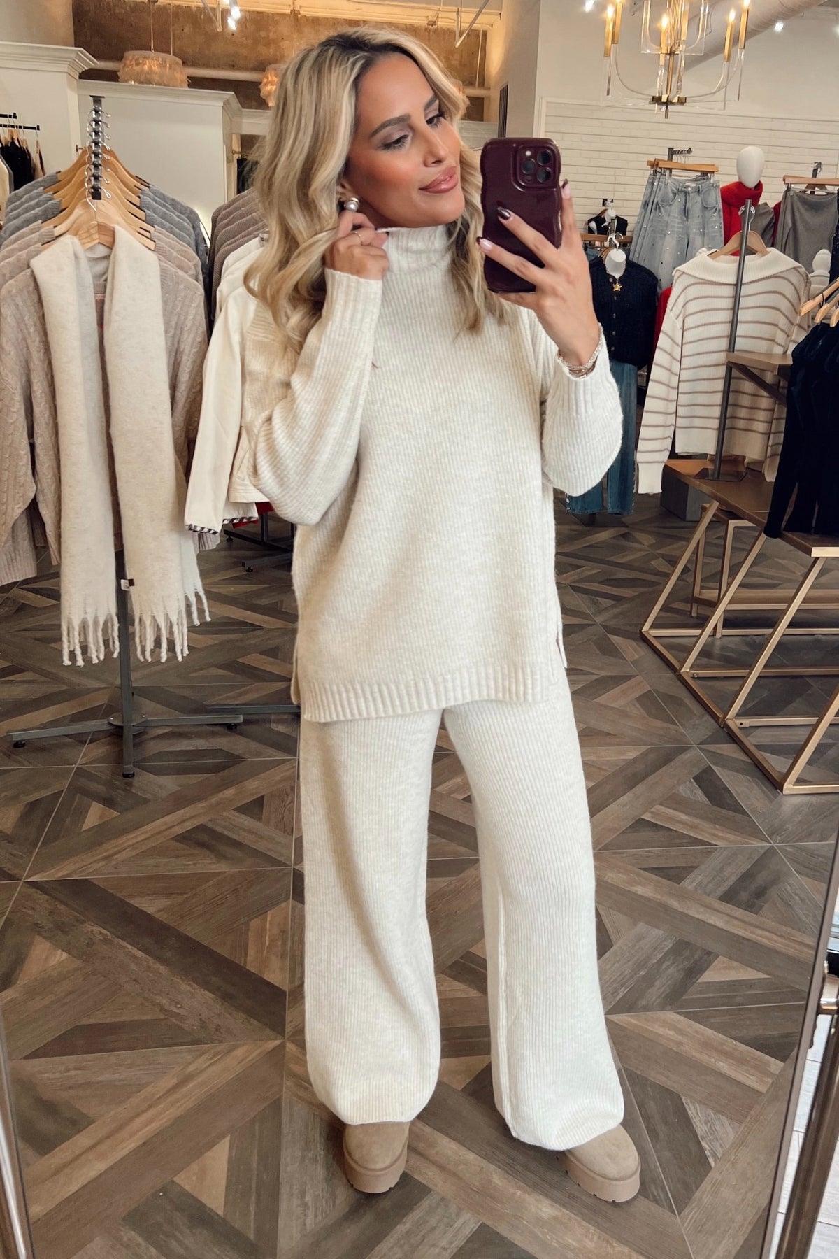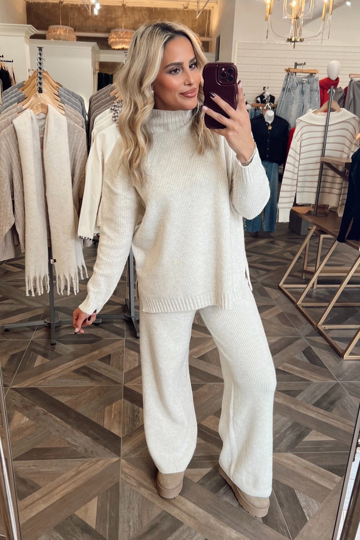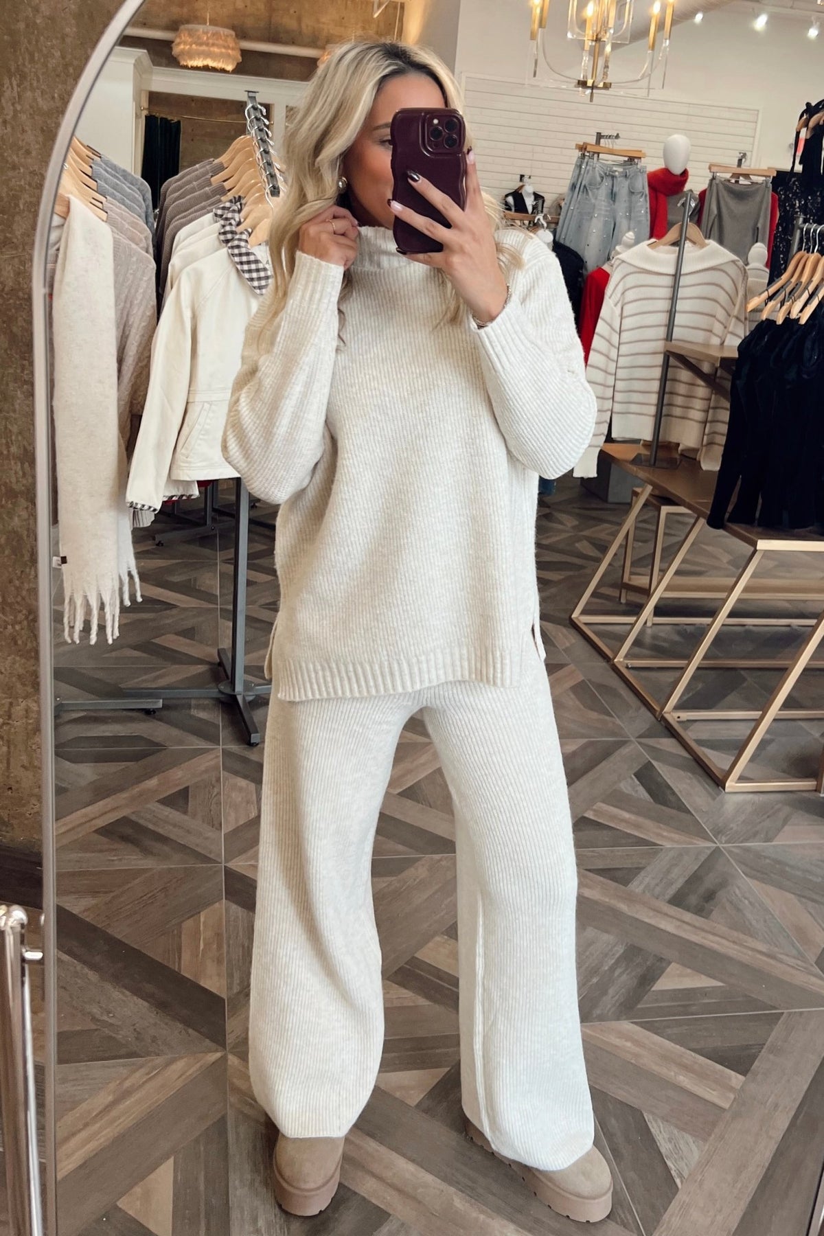 A soft ribbed knit set in a cool grey tone, designed with a relaxed mock neck top and wide leg pants. The fabric drapes comfortably while keeping its shape, giving this set a polished, elevated lounge feel perfect for colder days.