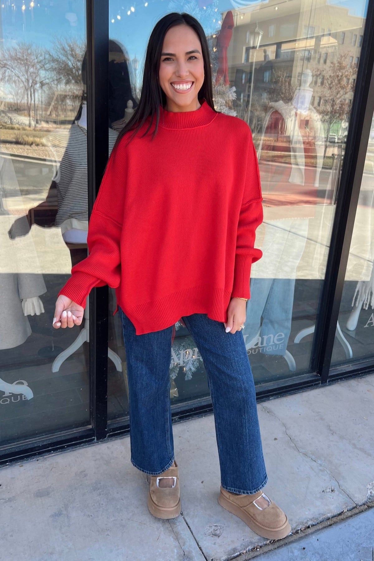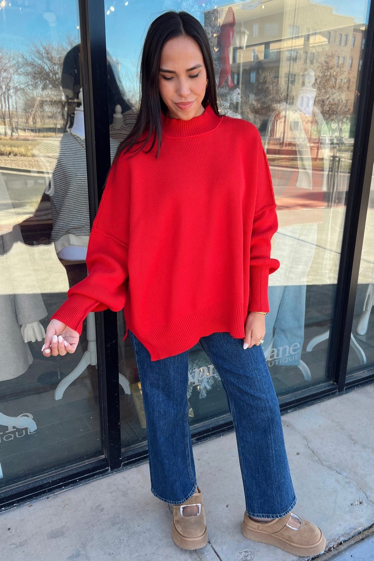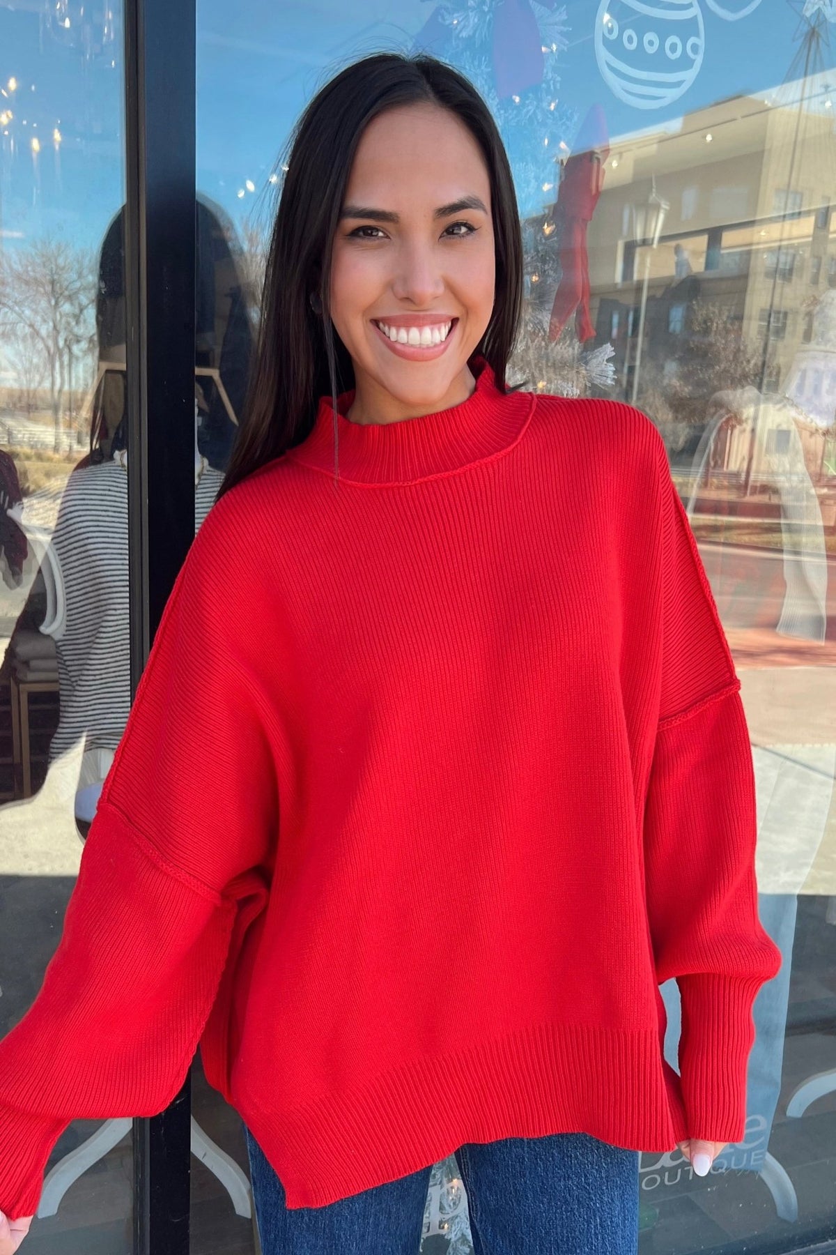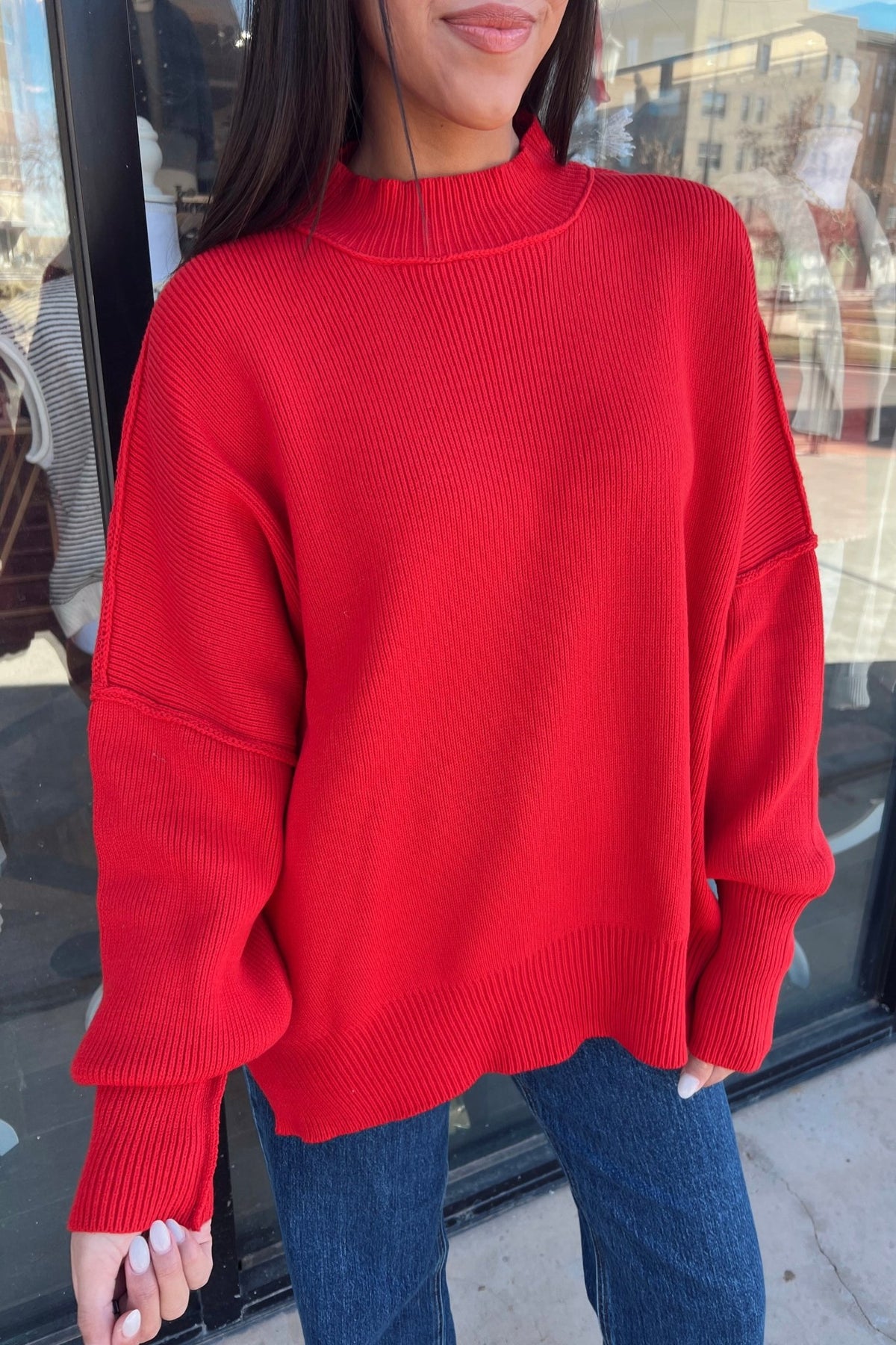 A bold red statement (because a pop of red never hurt anybody). The Mary is cozy, relaxed, and slightly oversized with ribbed texture and dropped shoulders. The kind of sweater that instantly brightens your outfit—and your mood.