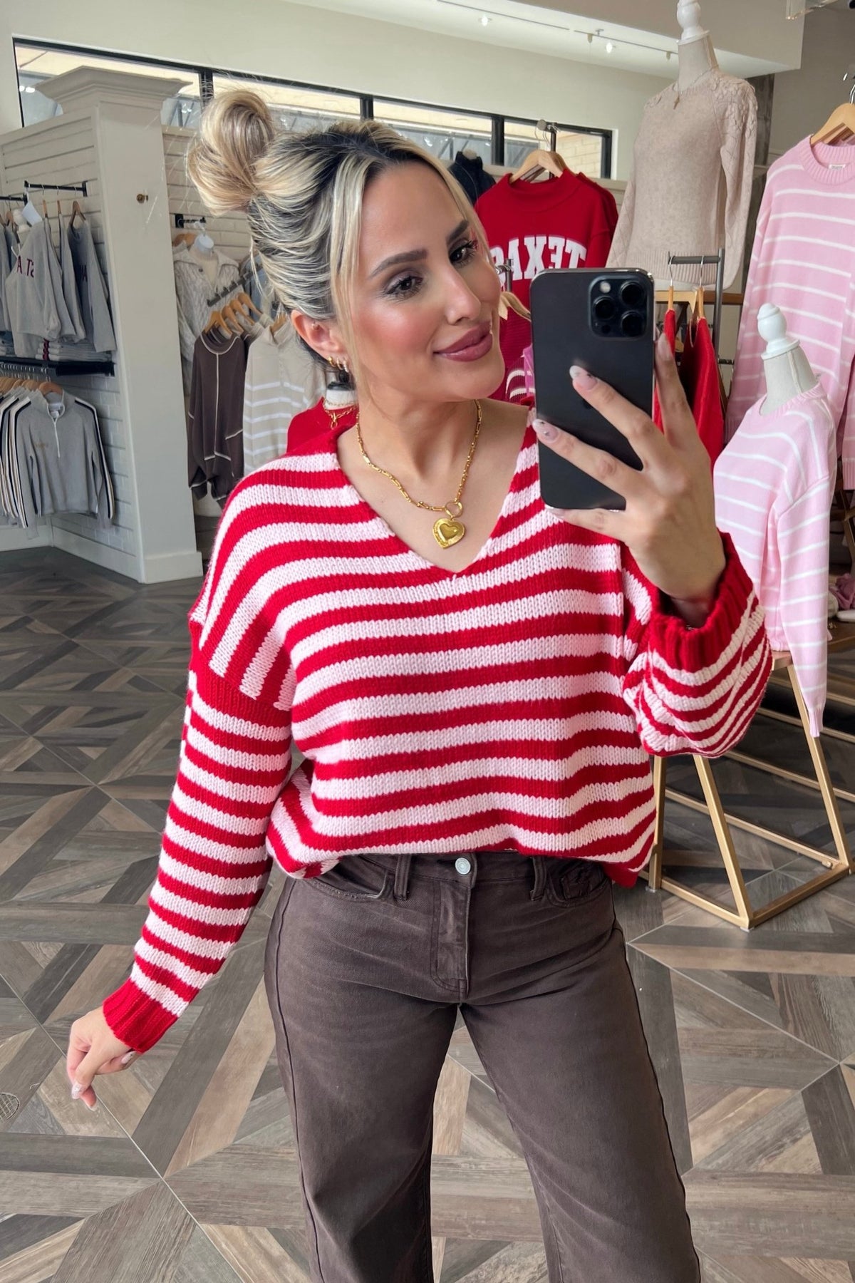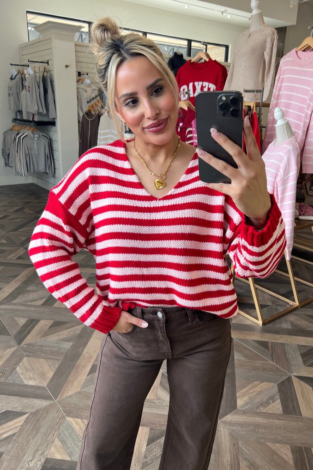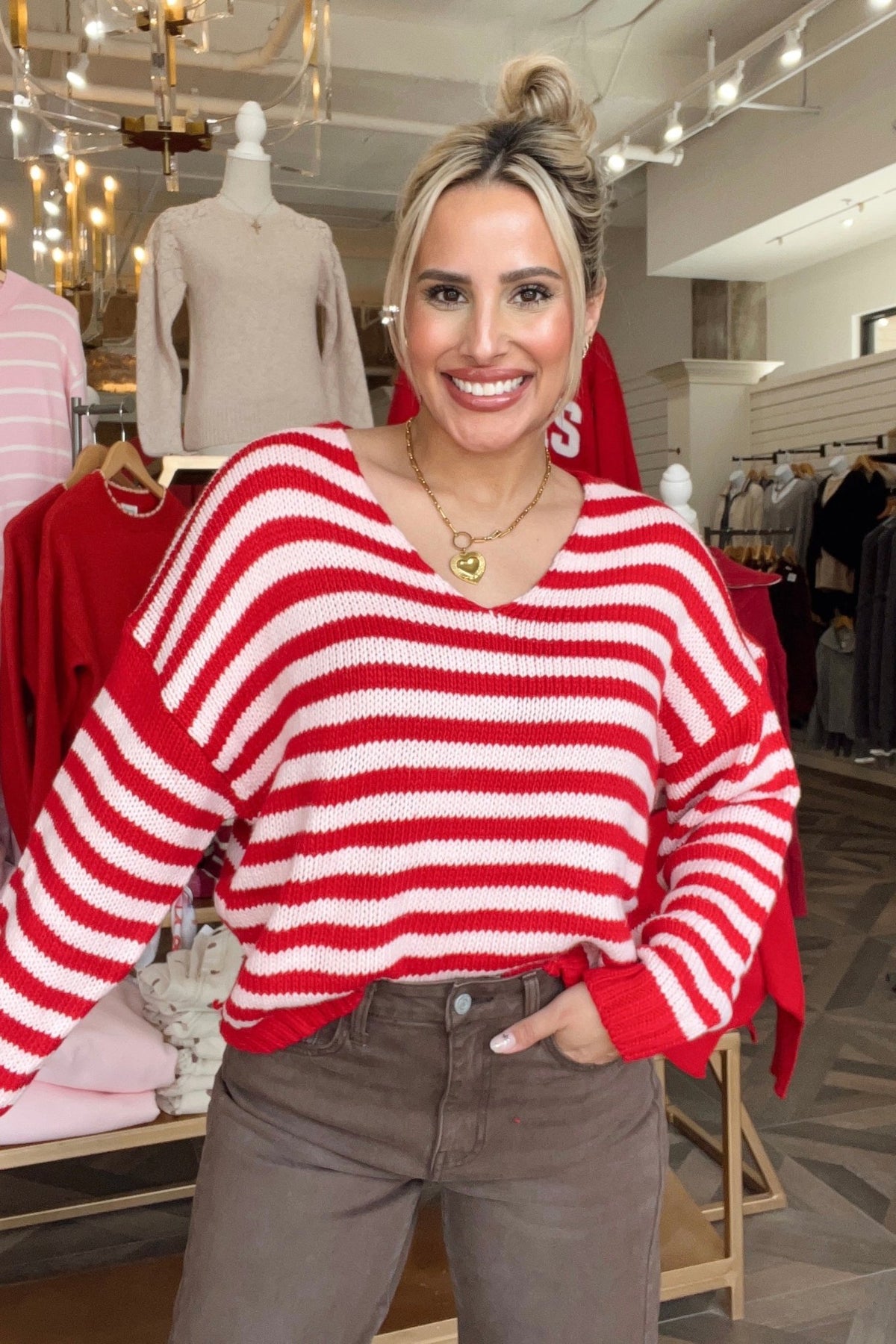 Pink and red stripes in a comfy, easy fit that adds a playful pop to your cold weather wardrobe.