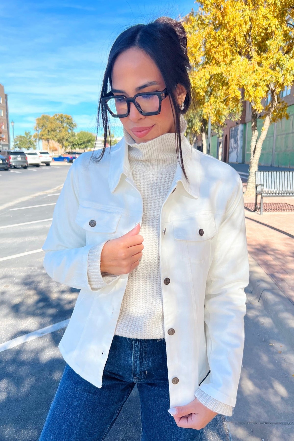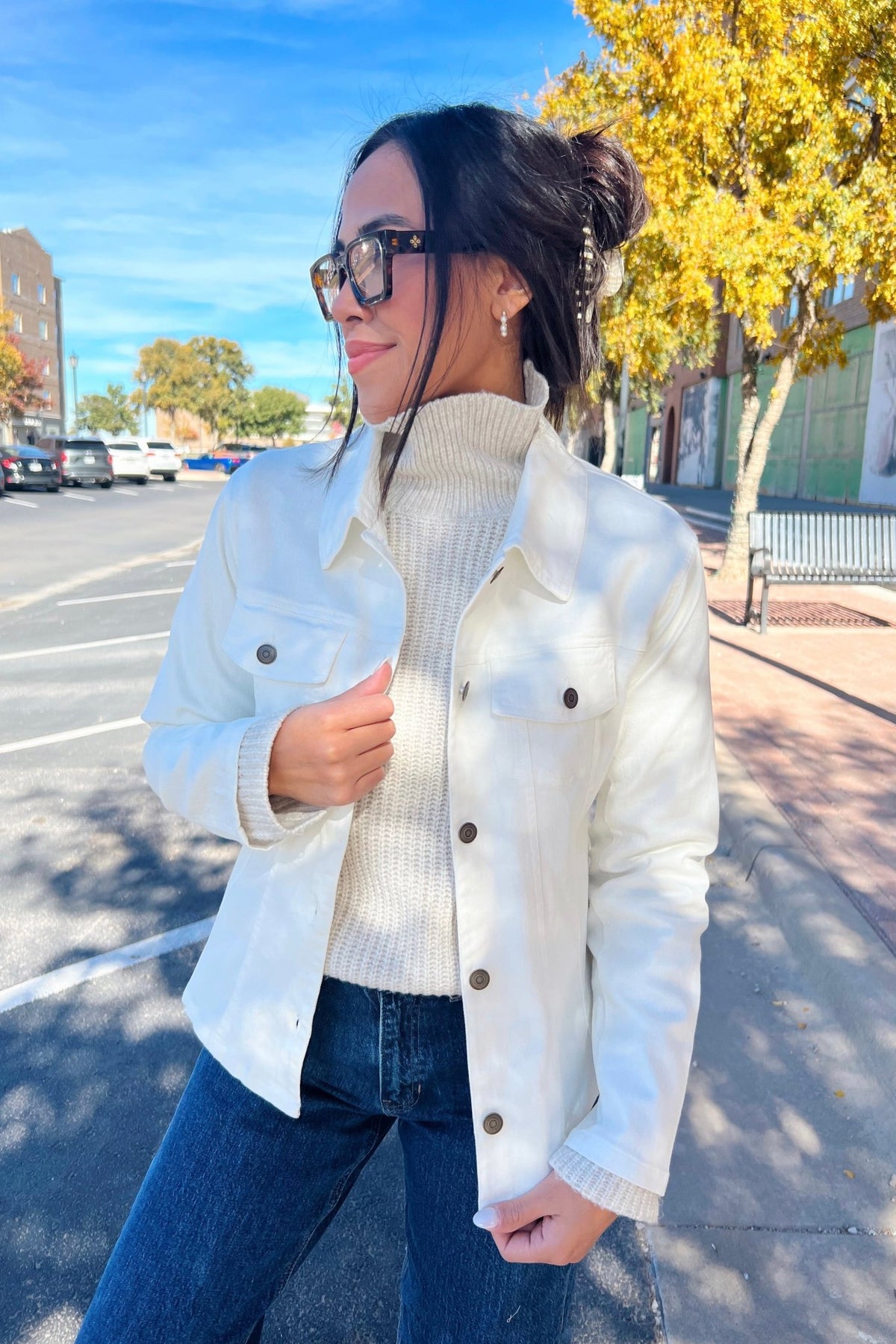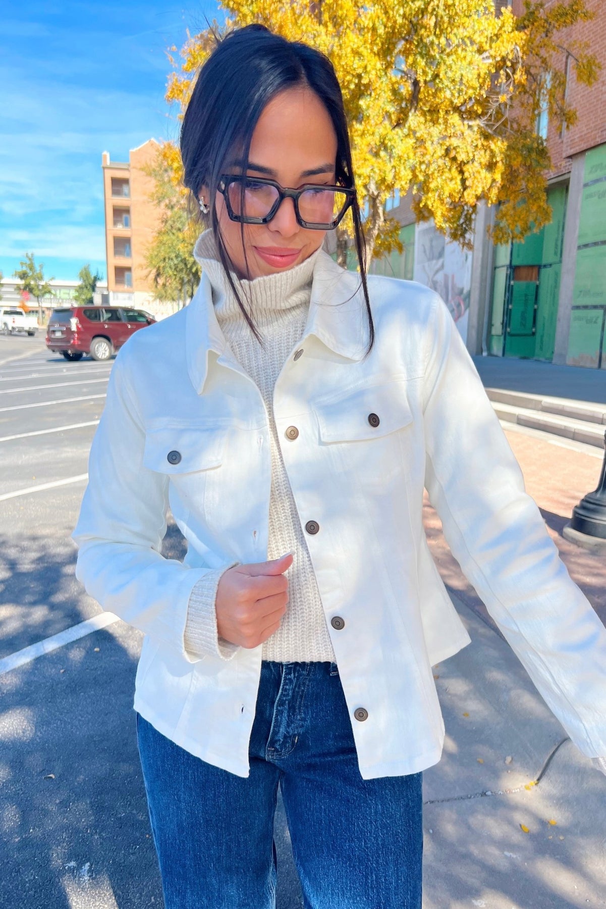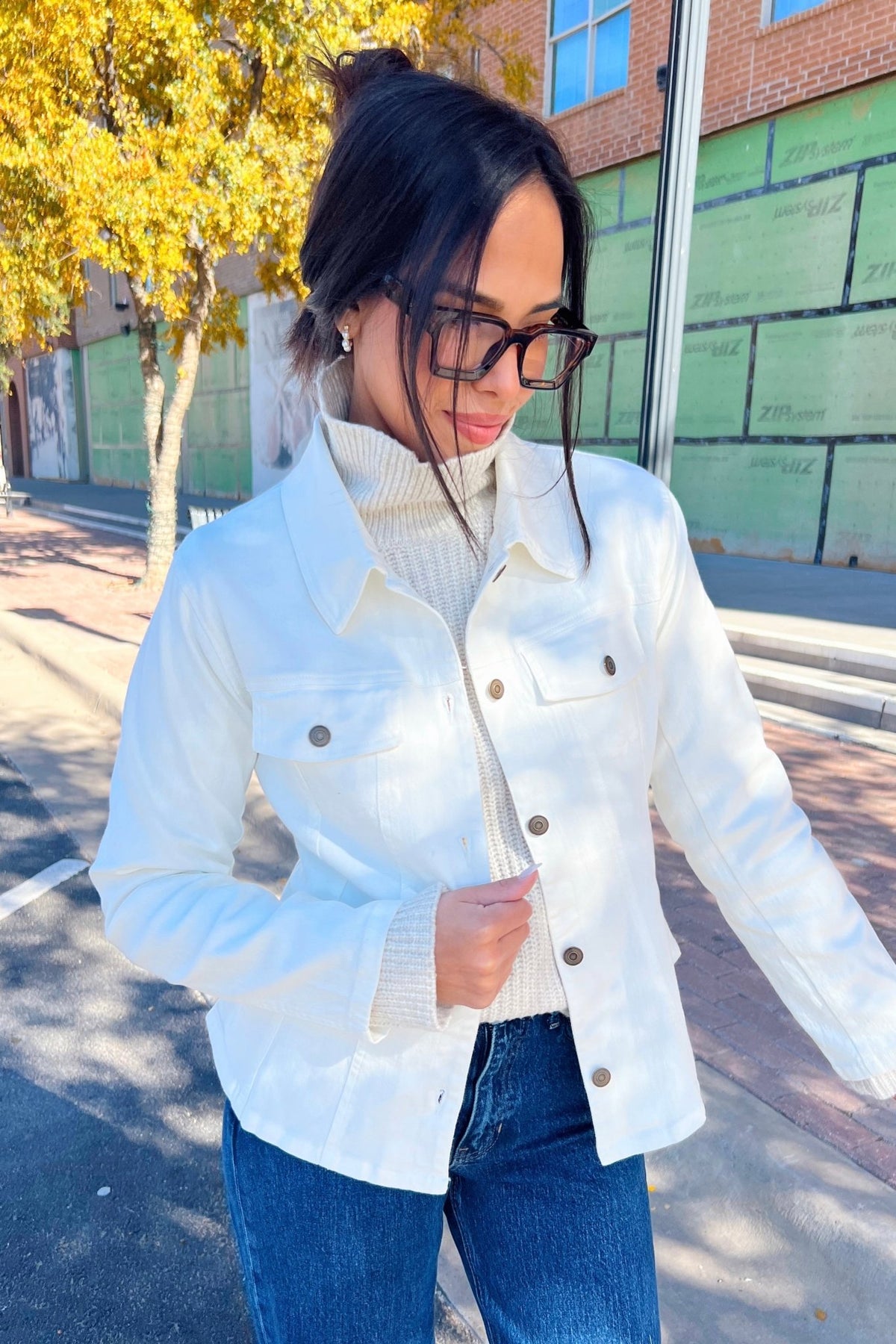 The jacket that goes with everything. Our Frost Denim Jacket gives any outfit a clean, fresh finish with its soft off white wash and brass button details. Layer it over sweaters, dresses, or graphic tees, it’s a year round favorite.