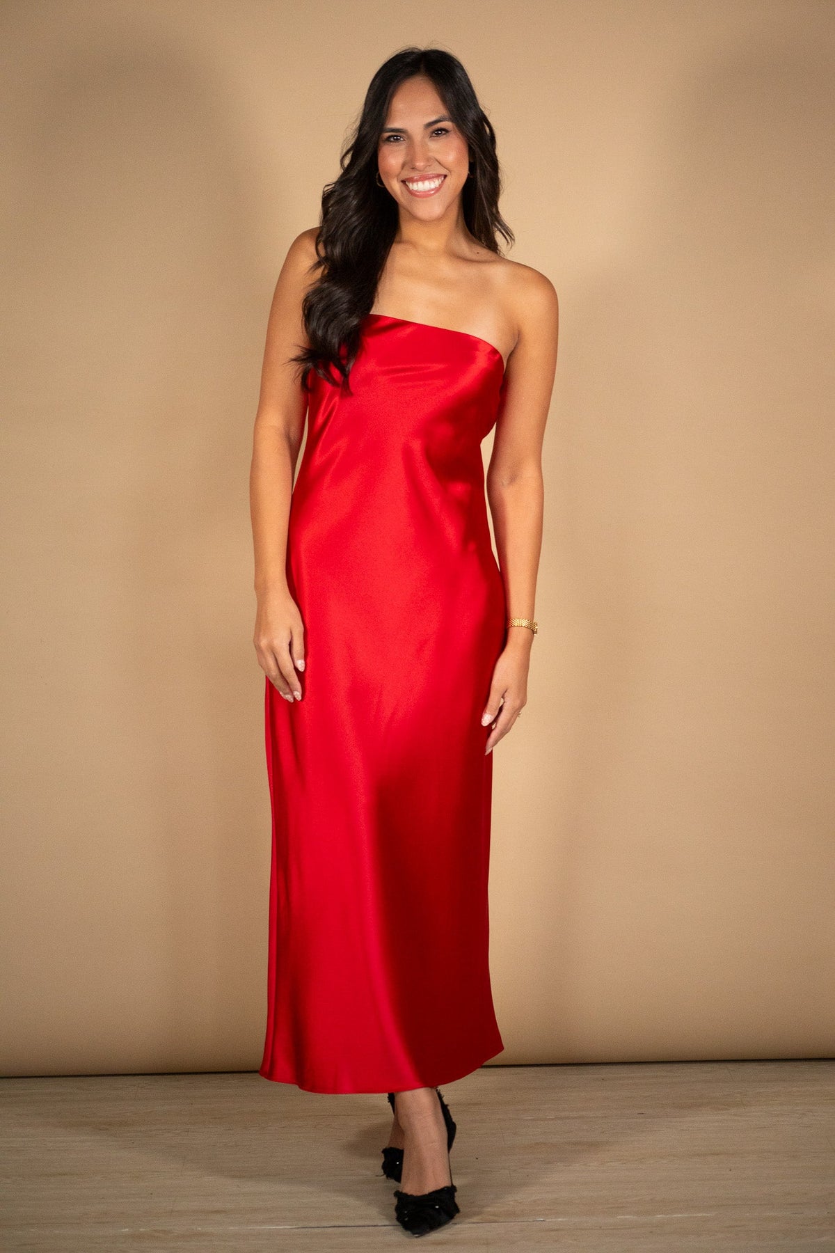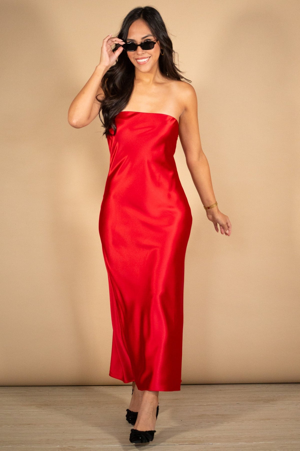 A pop of red never hurt anybody. This satin strapless midi is sleek, bold, and ready for any night you want to turn heads.