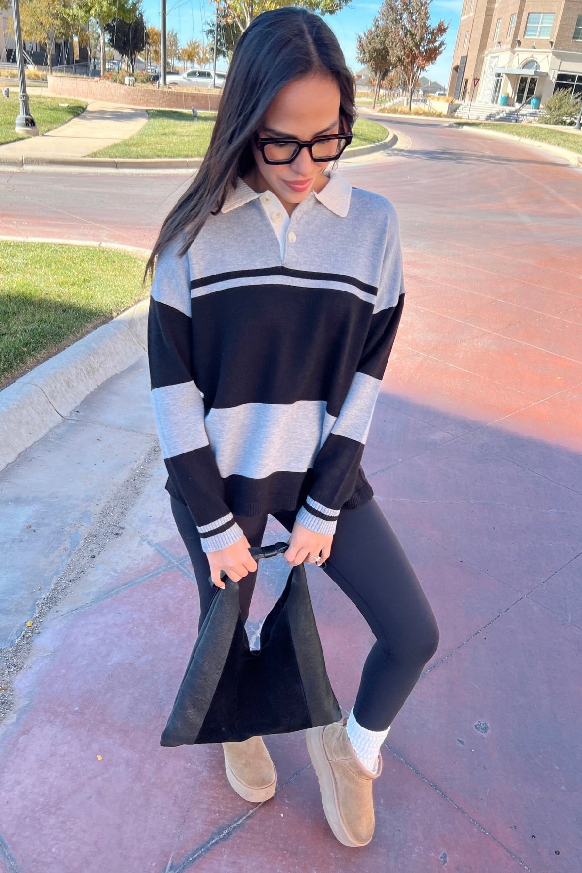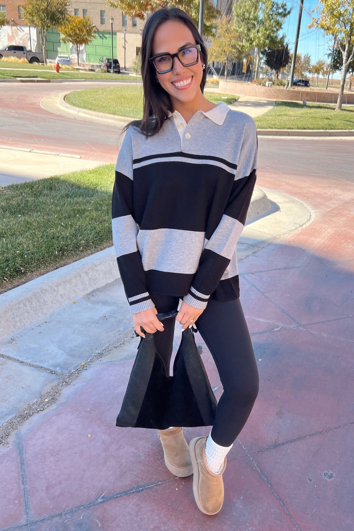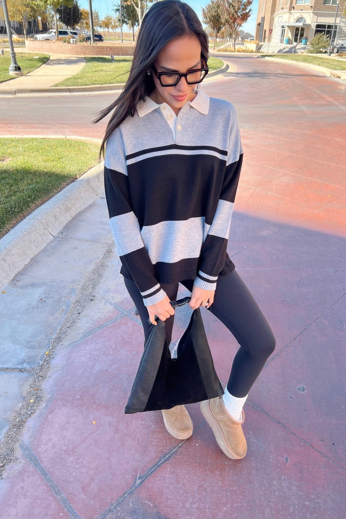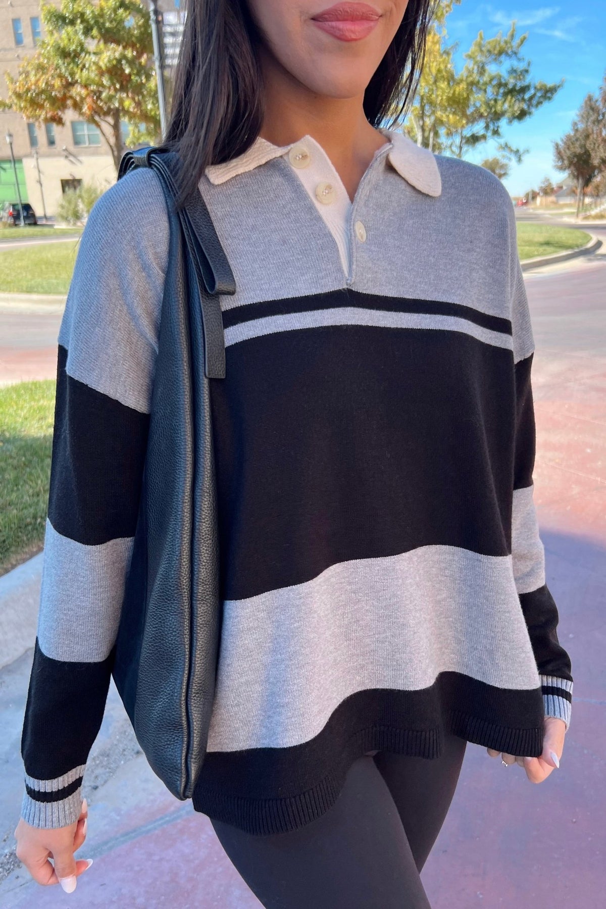 Classic with a twist. The Madison Rugby Pullover mixes neutral black and grey stripes with a soft collared neckline and button placket for a look that’s both sporty and sophisticated. Perfect for coffee runs, classrooms, or casual Fridays.