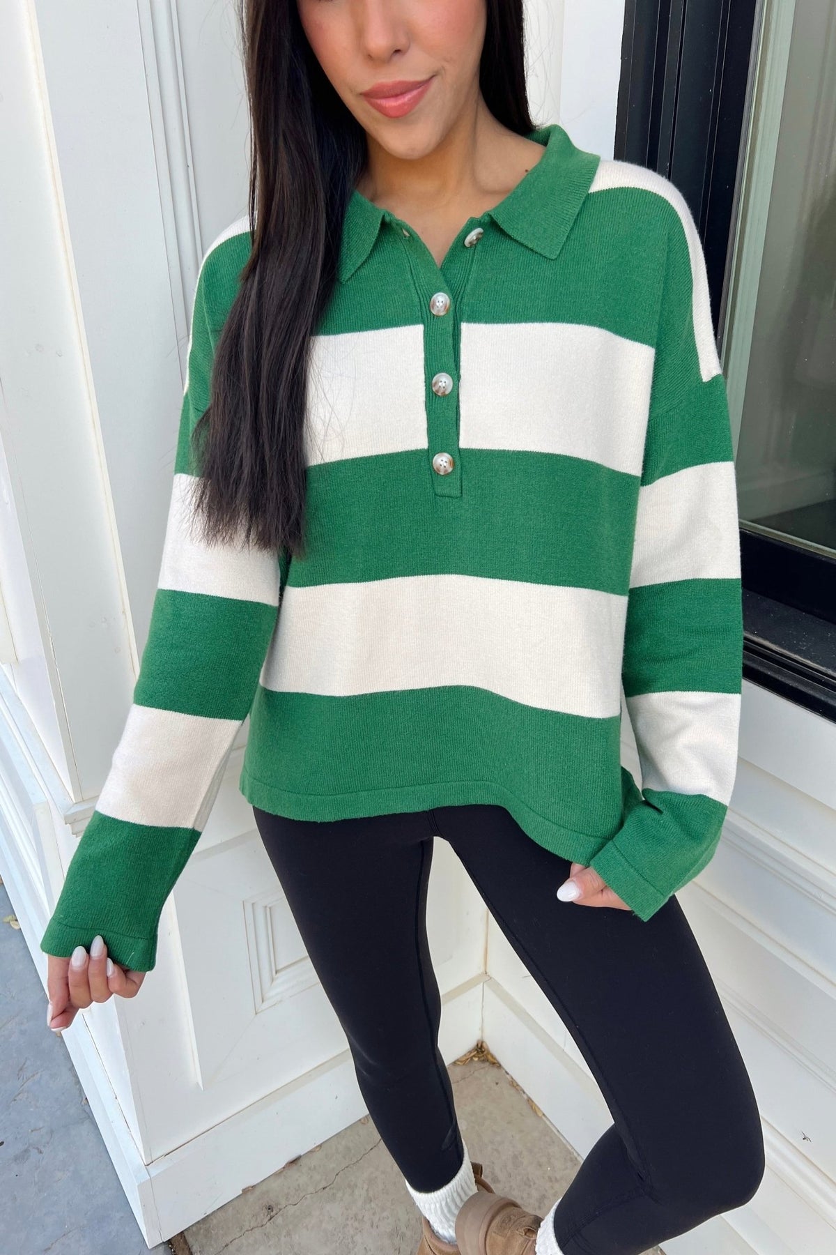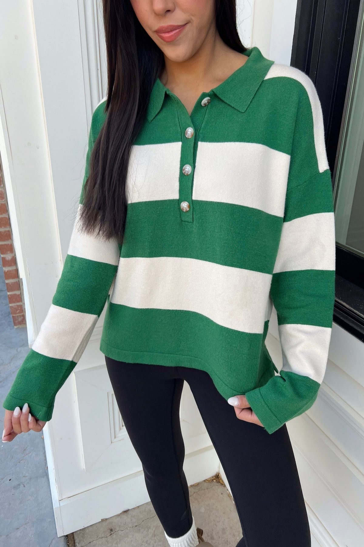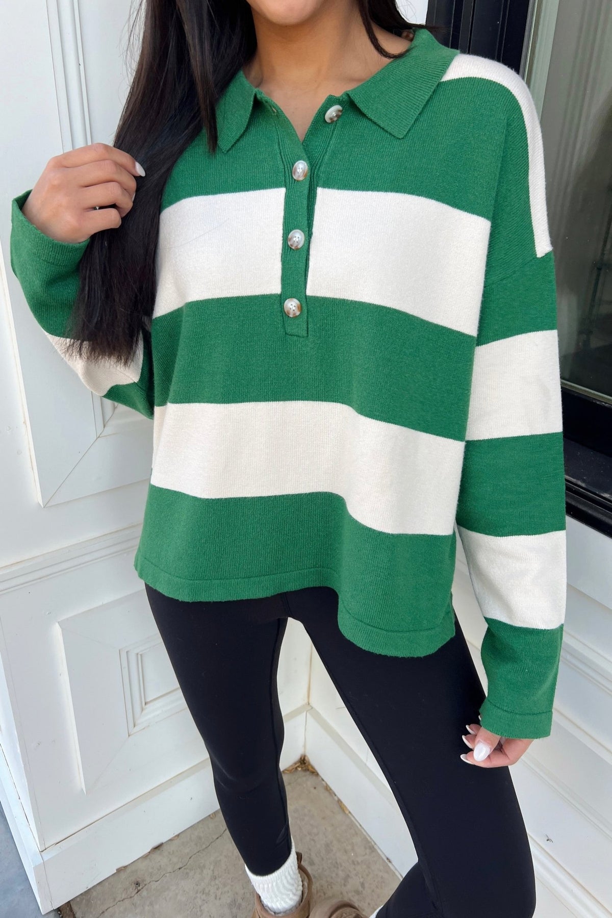 Varsity vibes, grown up edition. This green and cream striped pullover features a relaxed fit, polished collar, and tortoise buttons that dress up your casual look without trying too hard. Throw it on with leggings for errands or jeans for tailgate Saturday. Either way, it’s a win.