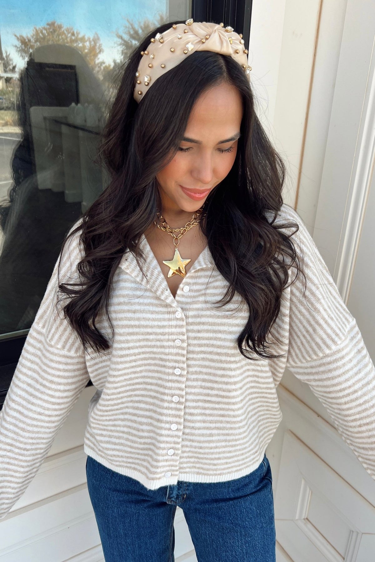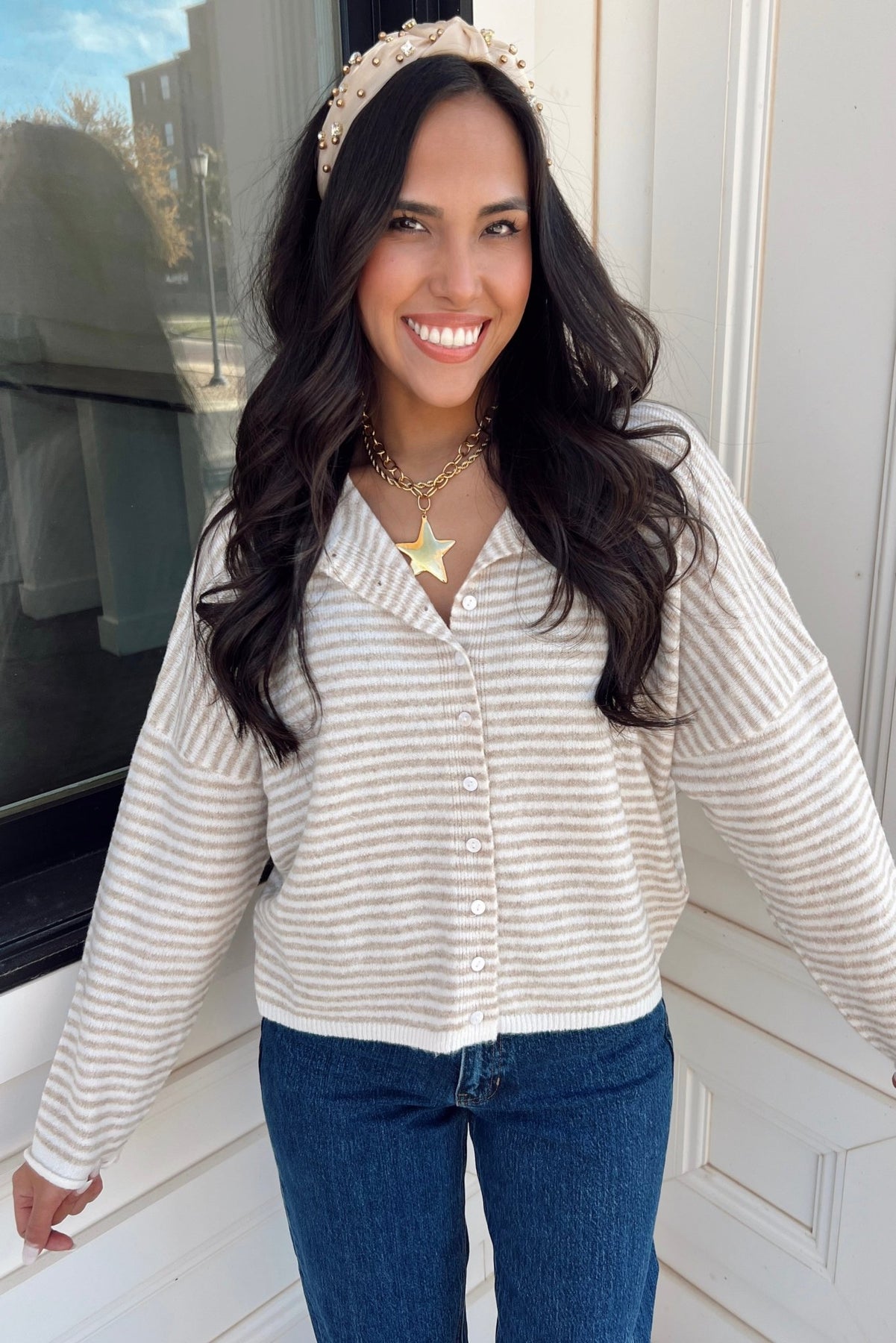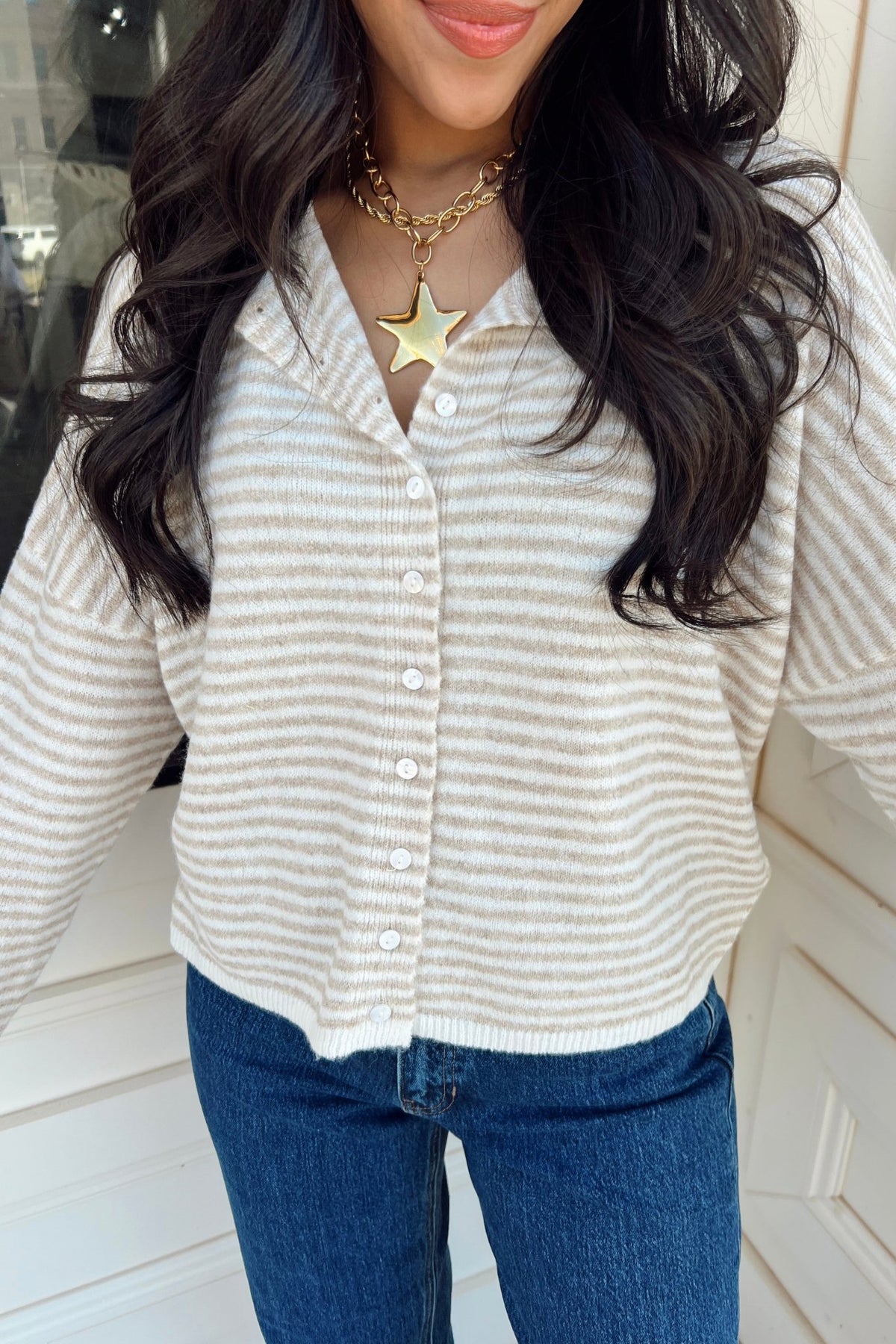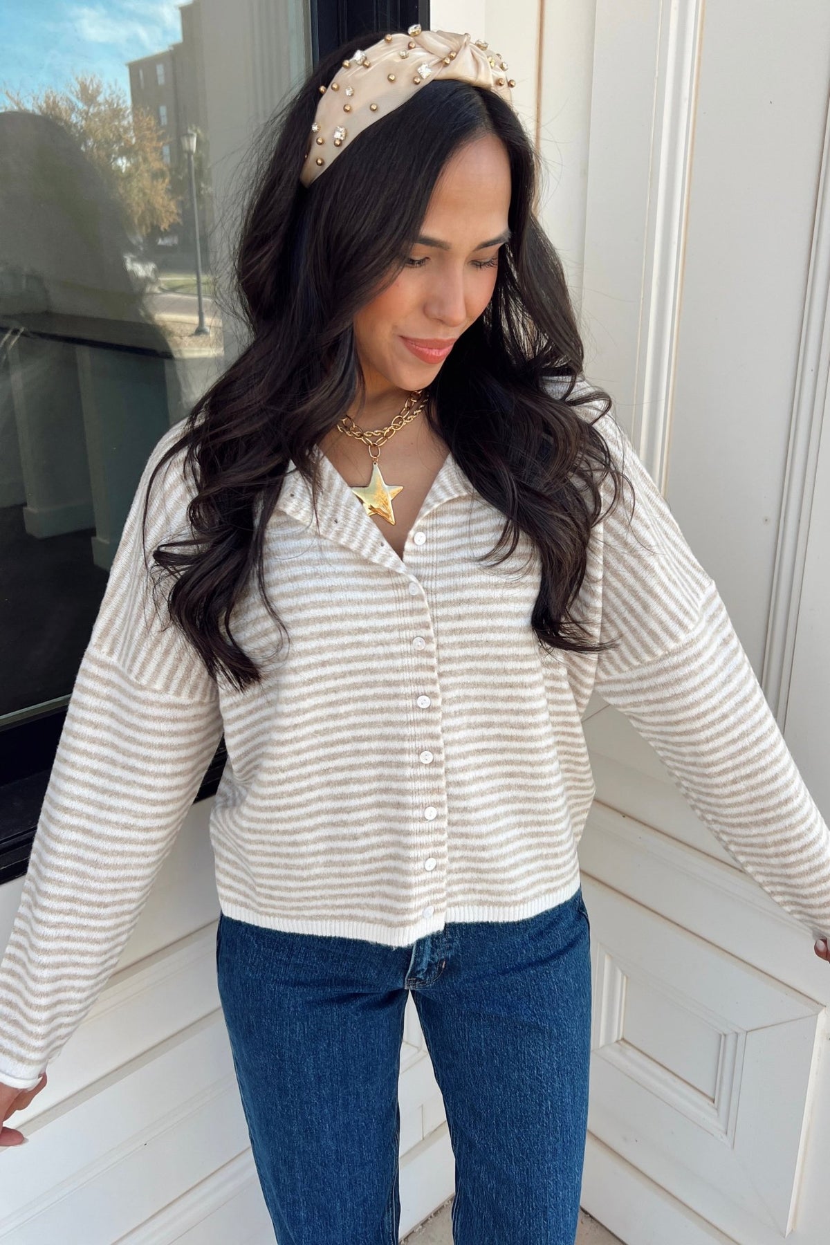 A soft striped knit sweater with a relaxed fit and front button detail. Neutral oatmeal and cream tones keep it understated and pretty, perfect with denim or lounge bottoms.