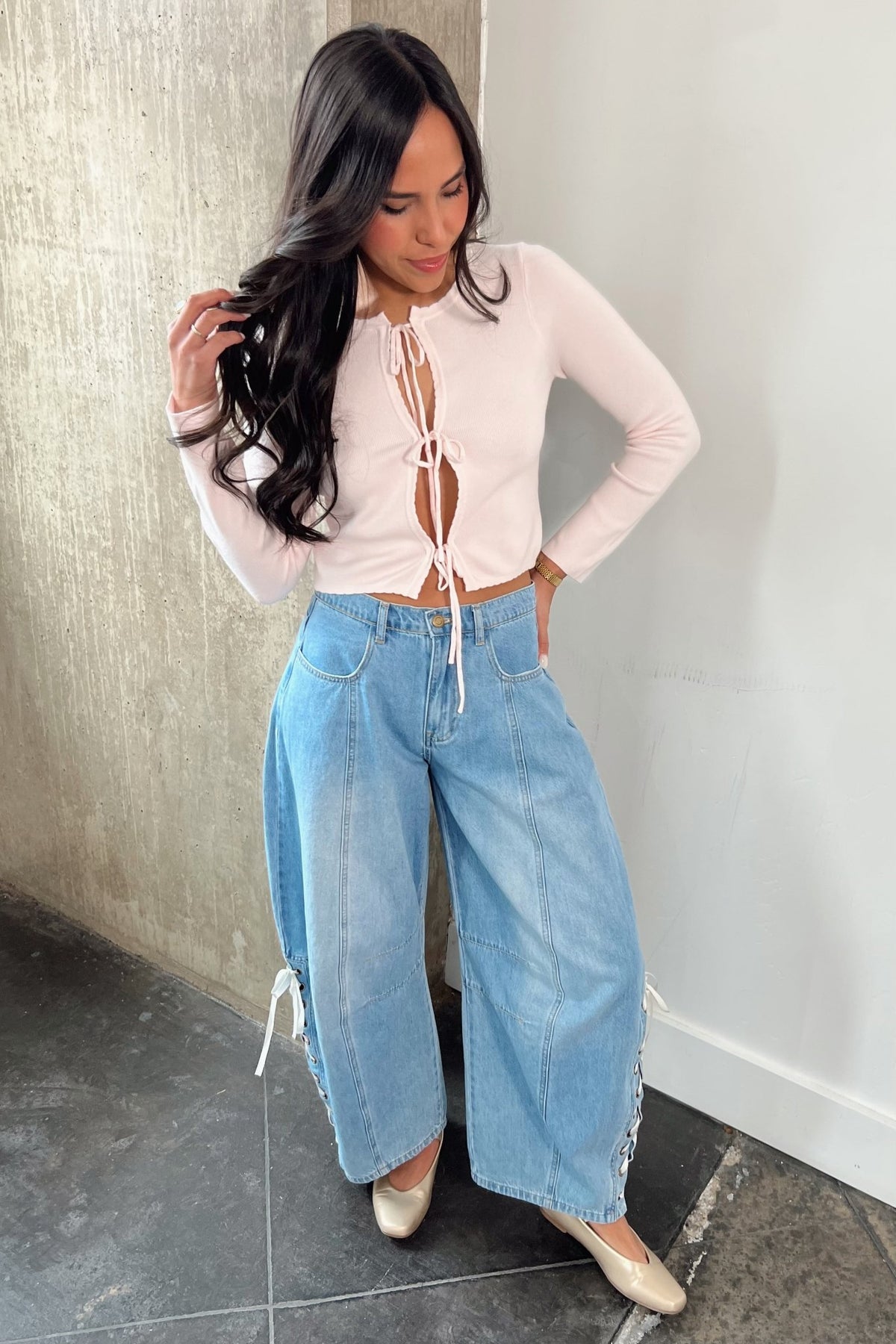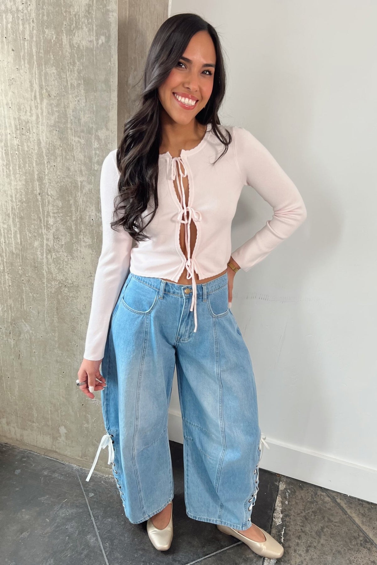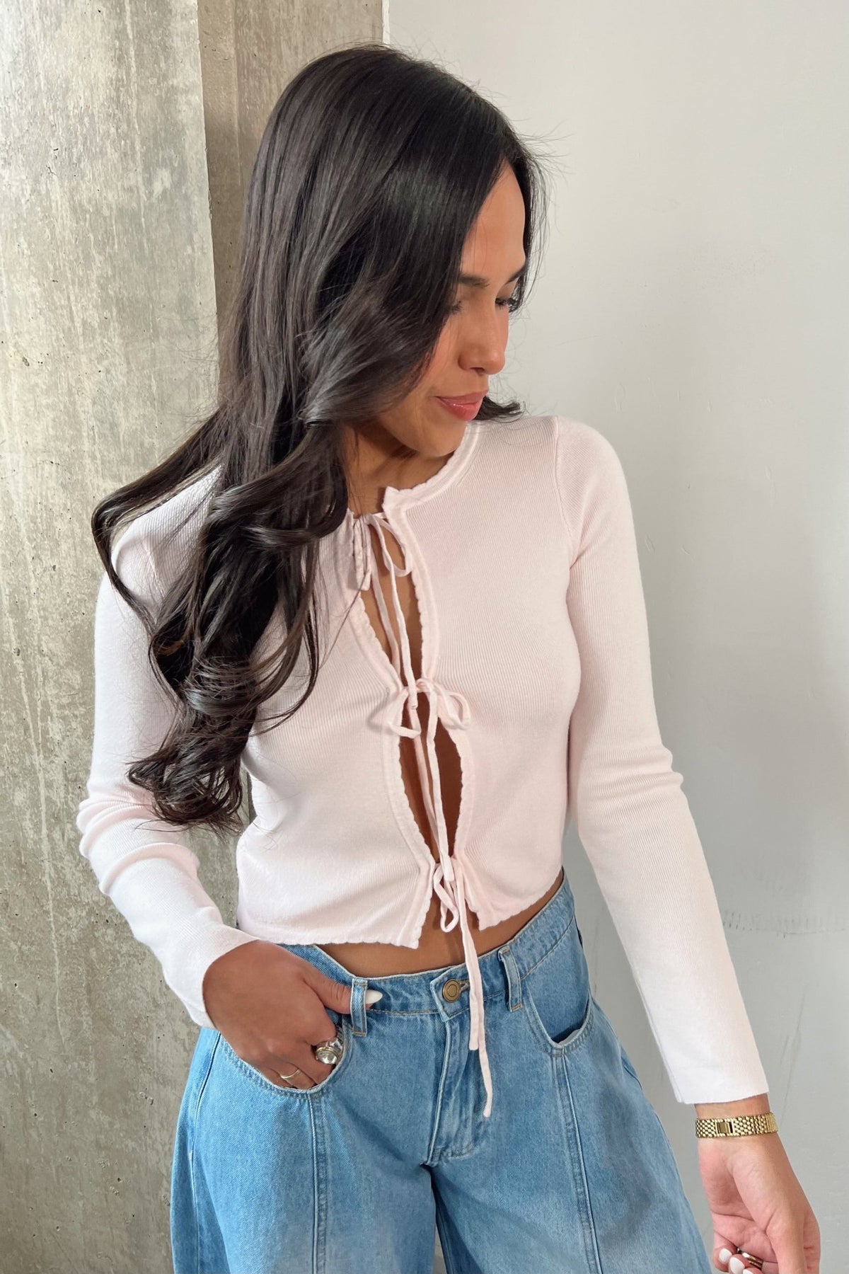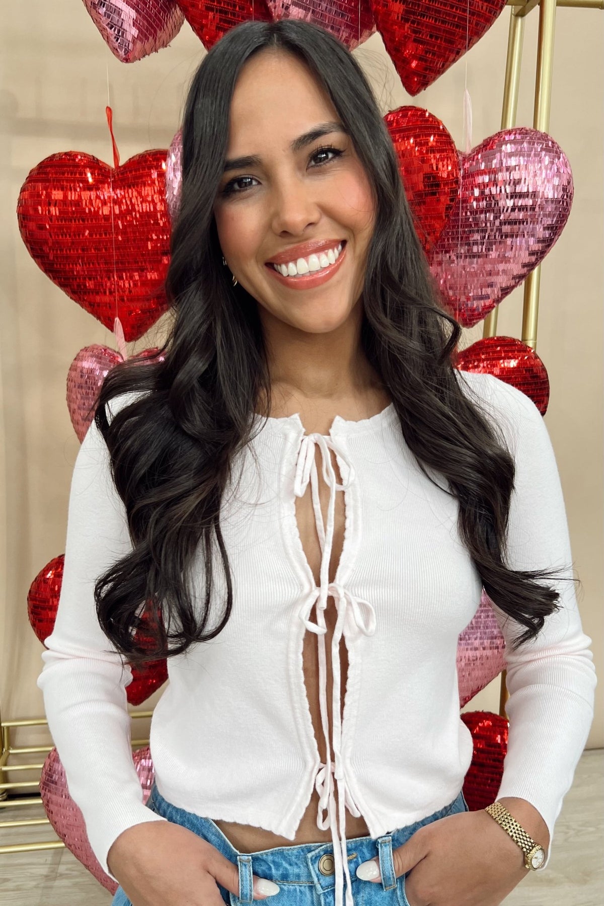 Lightweight soft knit with delicate tie front details that let you style it your way. Wear it tied up for a fitted look or loosen it for a more relaxed vibe. Easy with denim, dressy enough for date night, and cute far beyond Valentine’s Day.