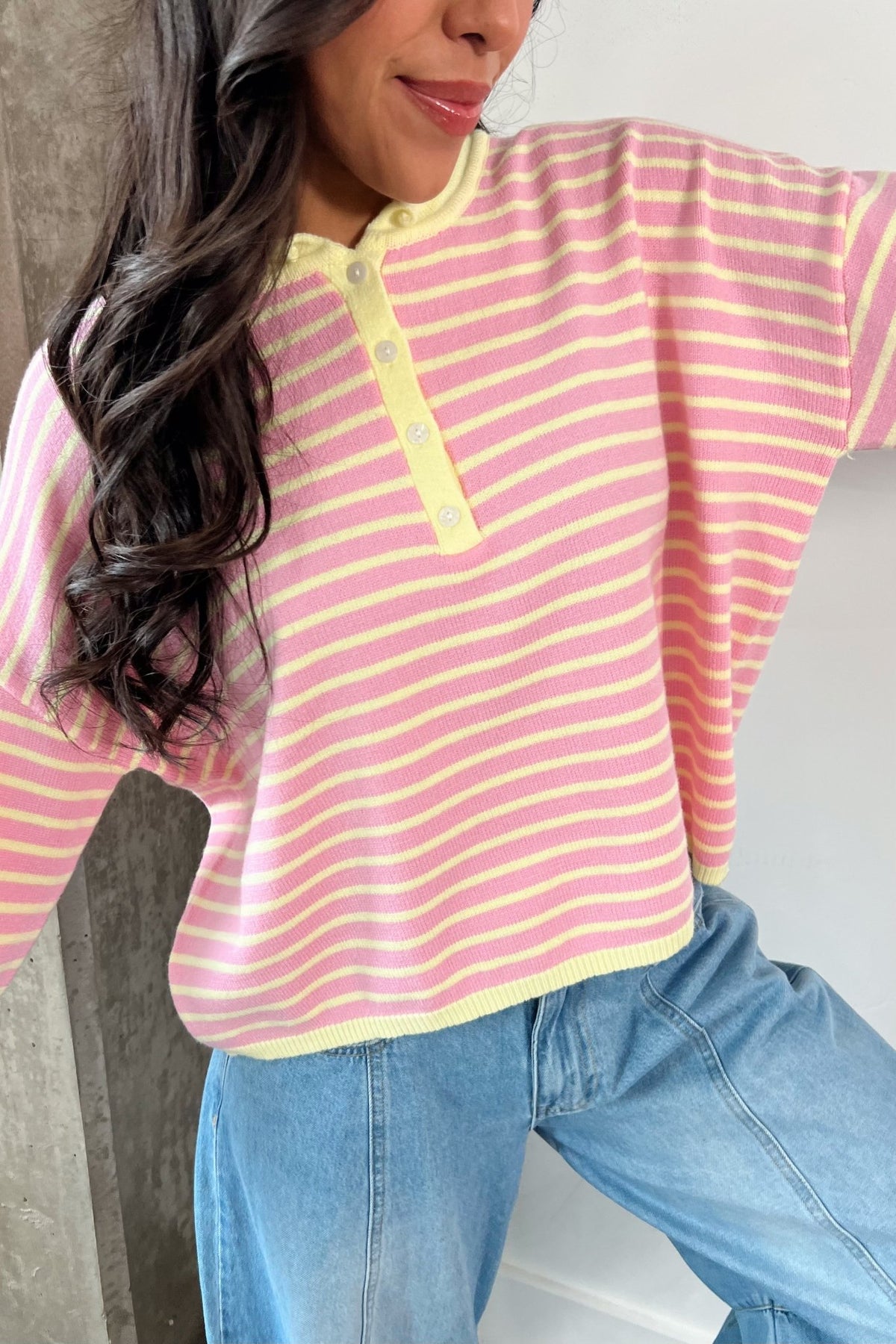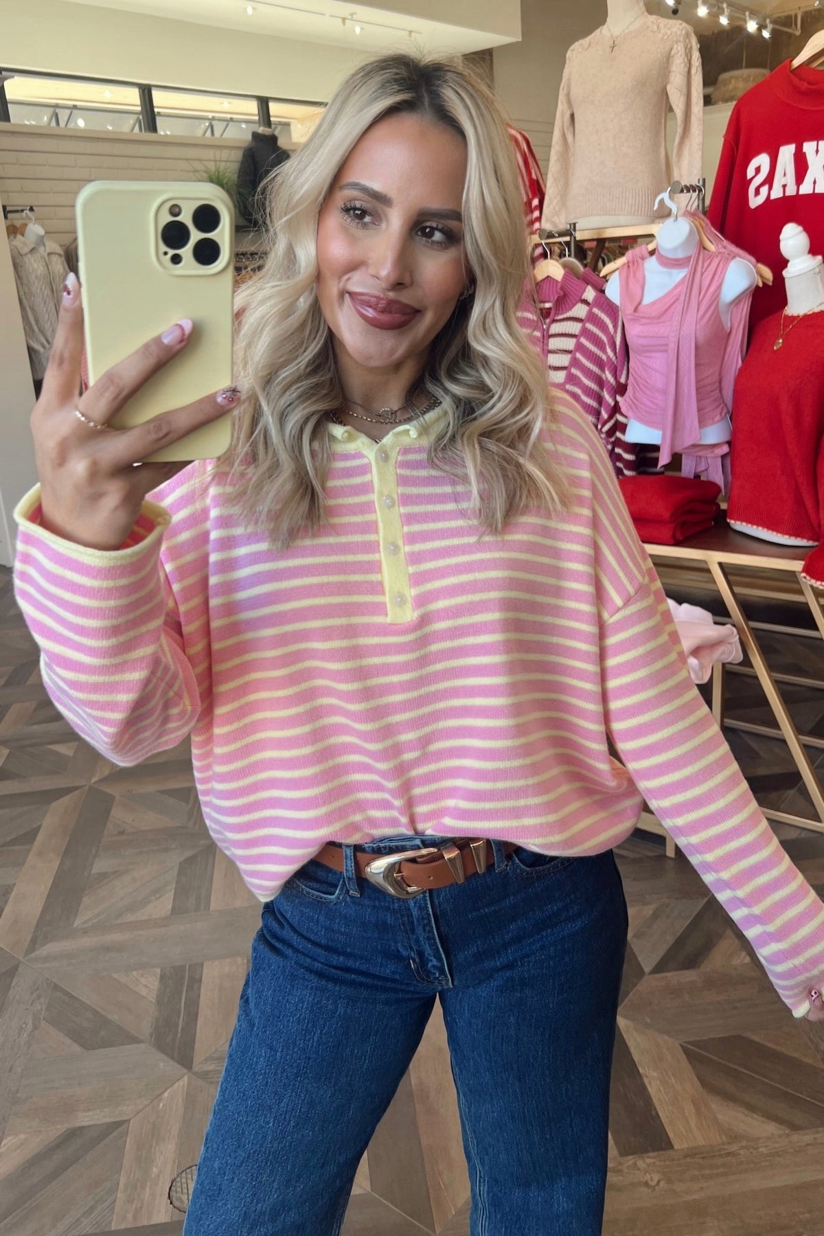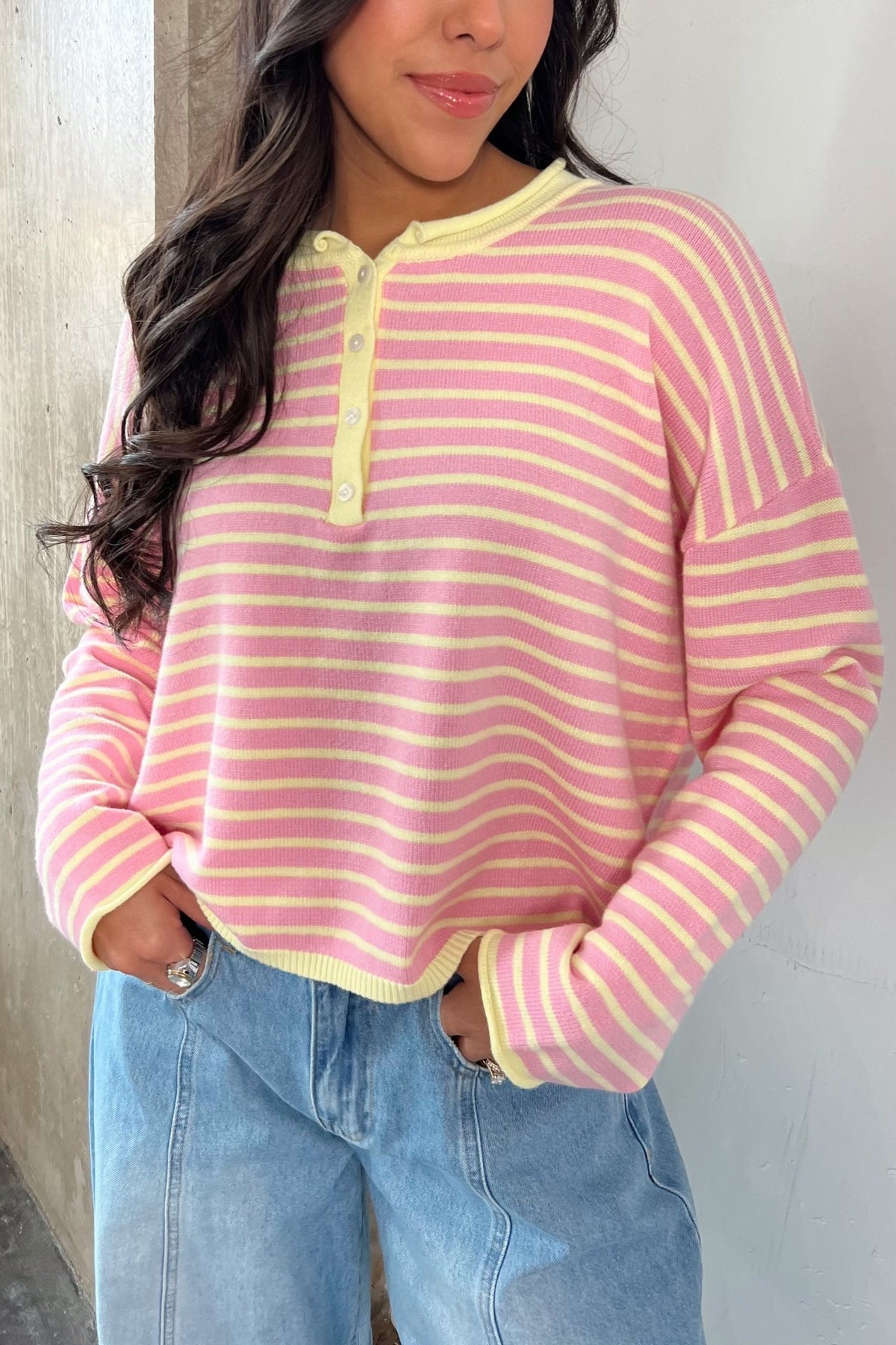 Soft knit with subtle stripes and a relaxed henley neckline. Easy with denim, perfect for layering, and one of those pieces you'll will live in.