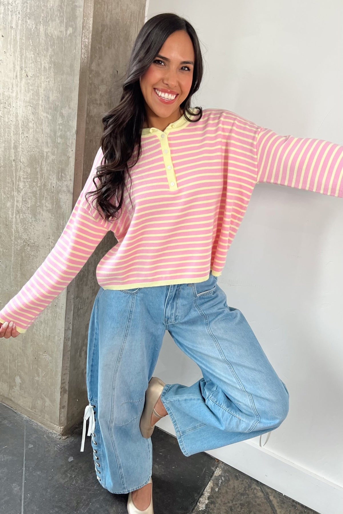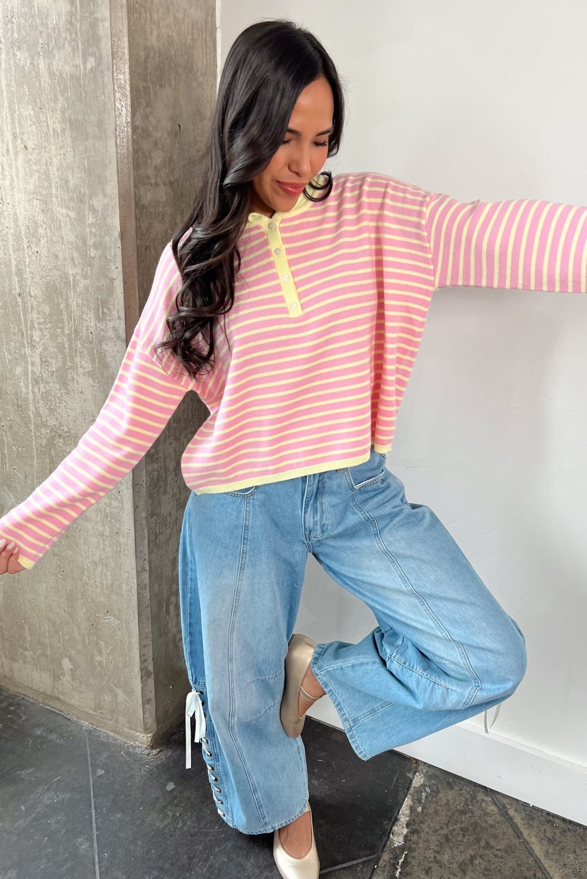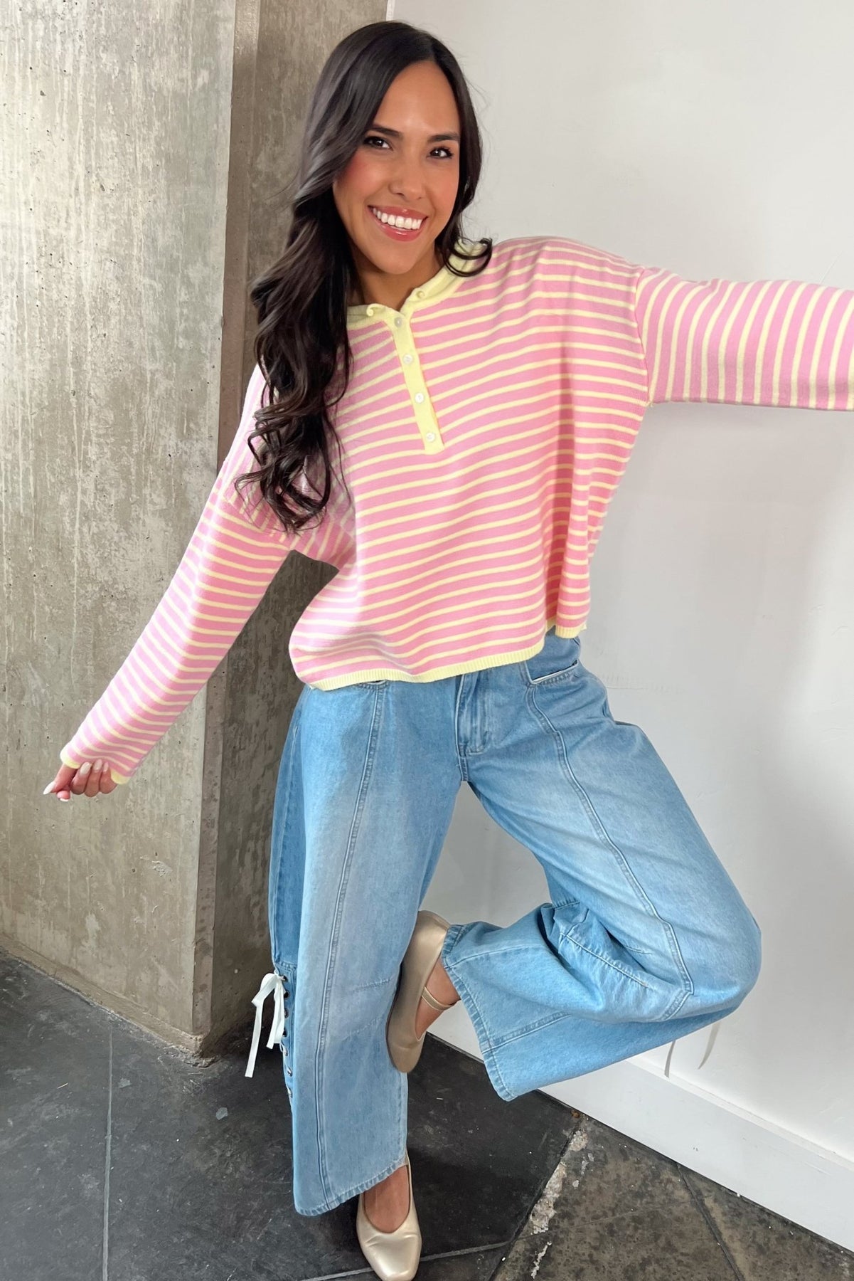 Soft knit with subtle stripes and a relaxed henley neckline. Easy with denim, perfect for layering, and one of those pieces you'll will live in.