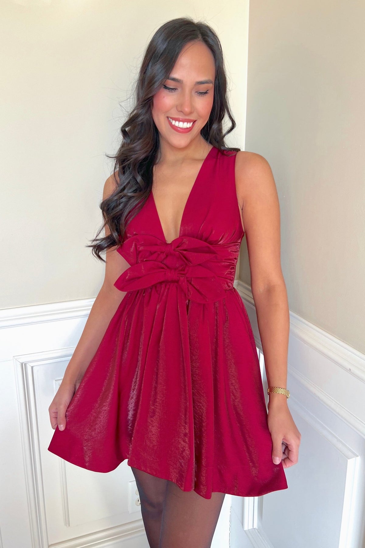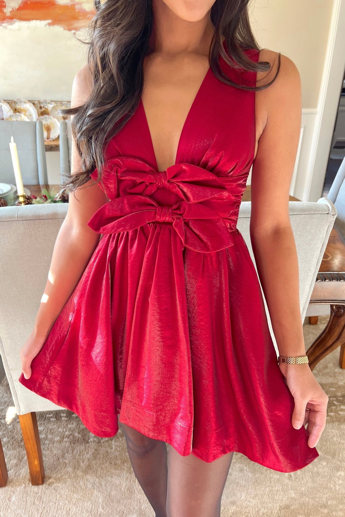 A shimmering red mini with a statement bow, because you are the gift this season. The ultimate holiday party dress.