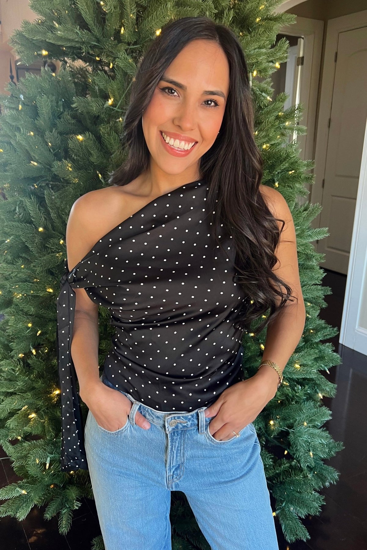 A silky one shoulder silhouette with subtle shimmer polka dots. She's your dressed up holiday moment, minus the fuss.