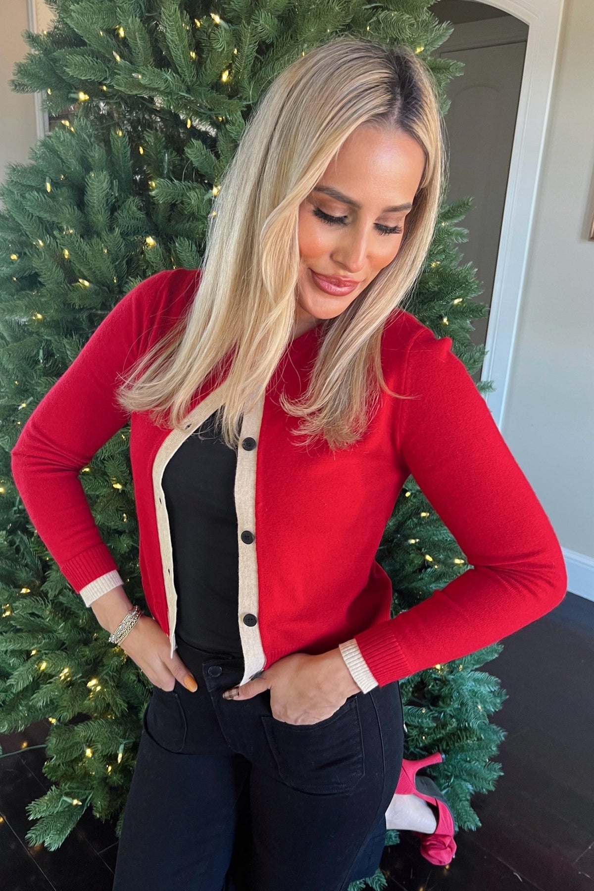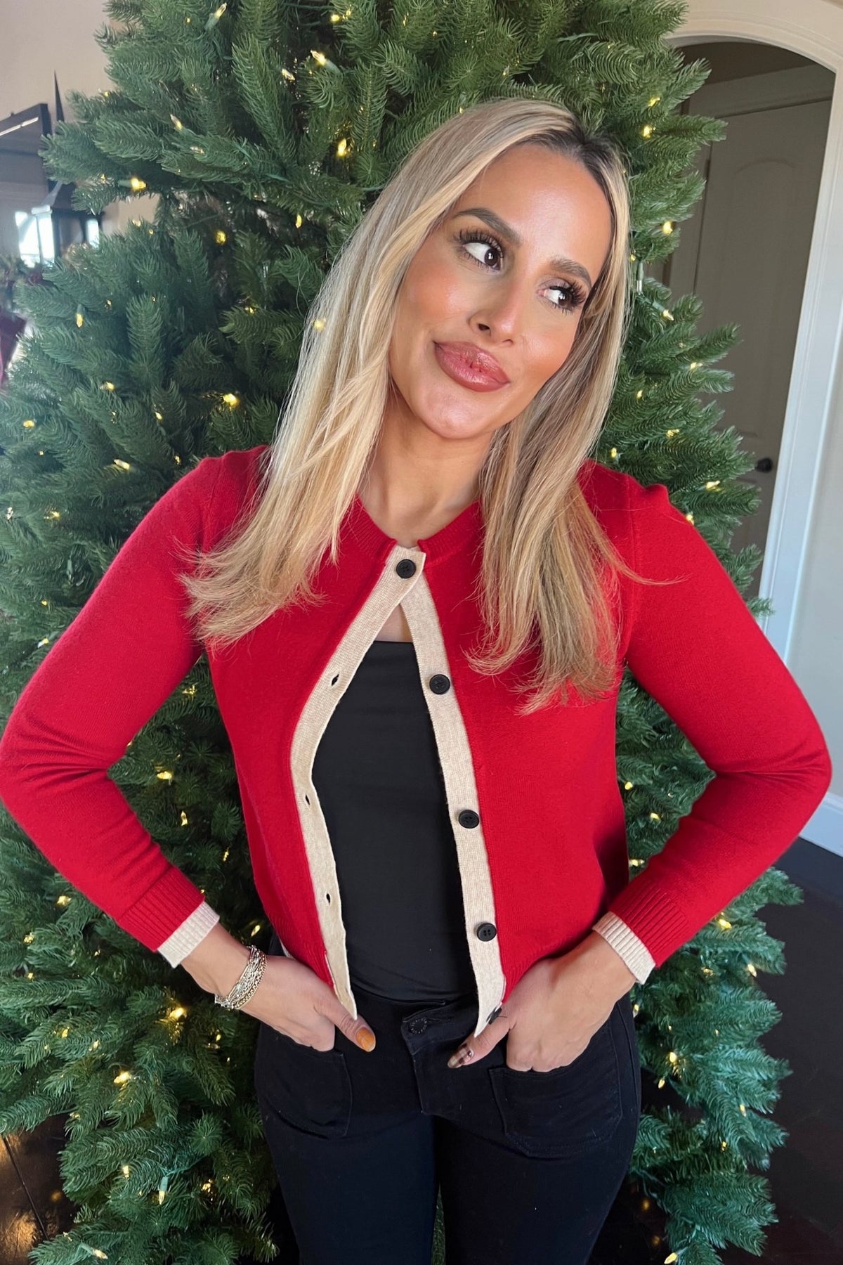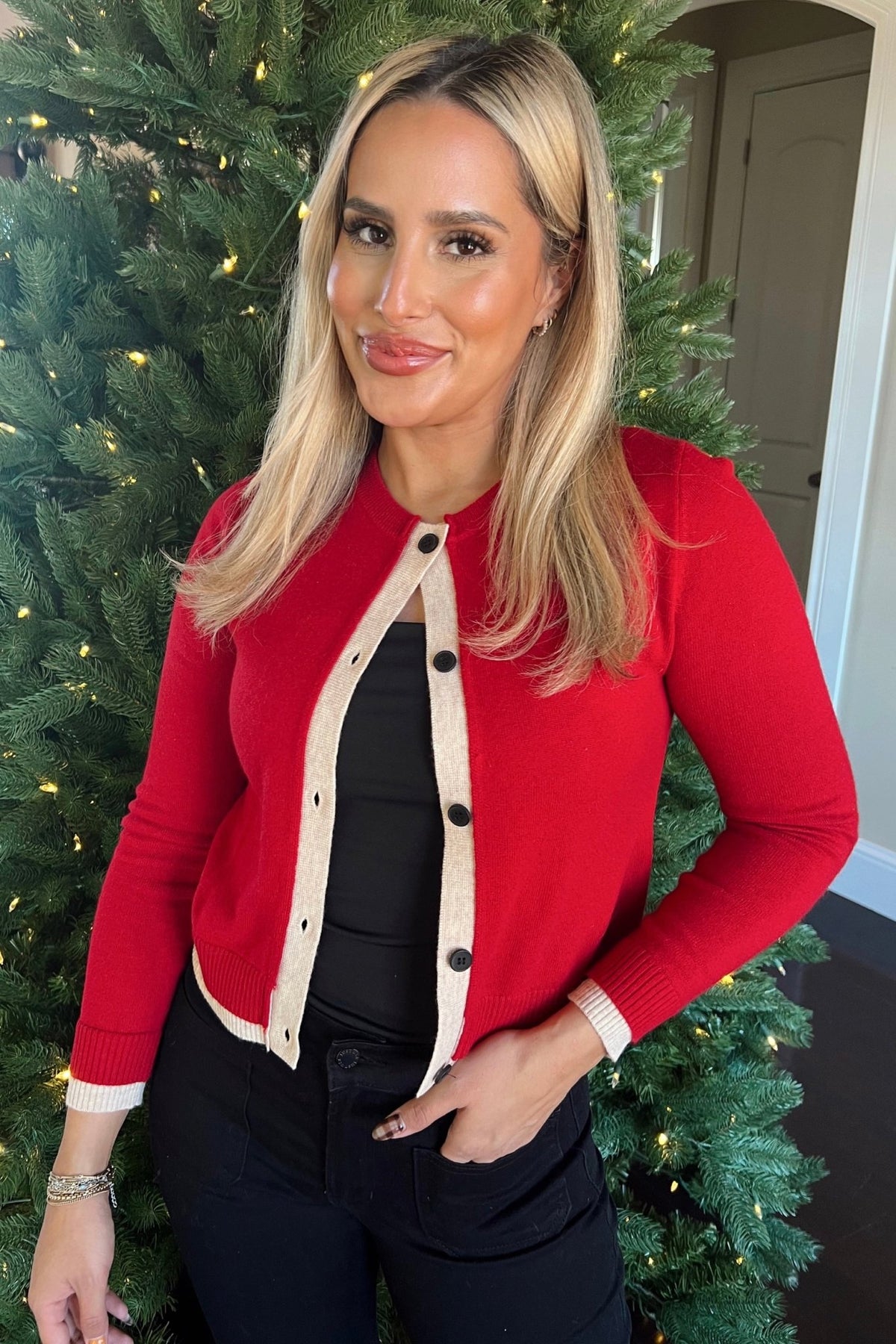 A pop of red with classic contrast trim. The Holly Lane is the kind of cardigan that feels cheery without trying too hard.
