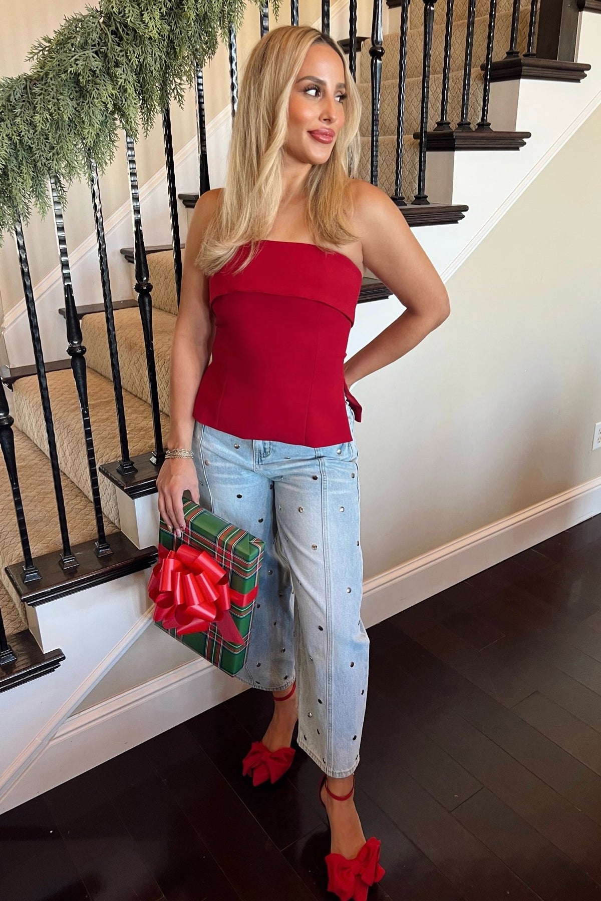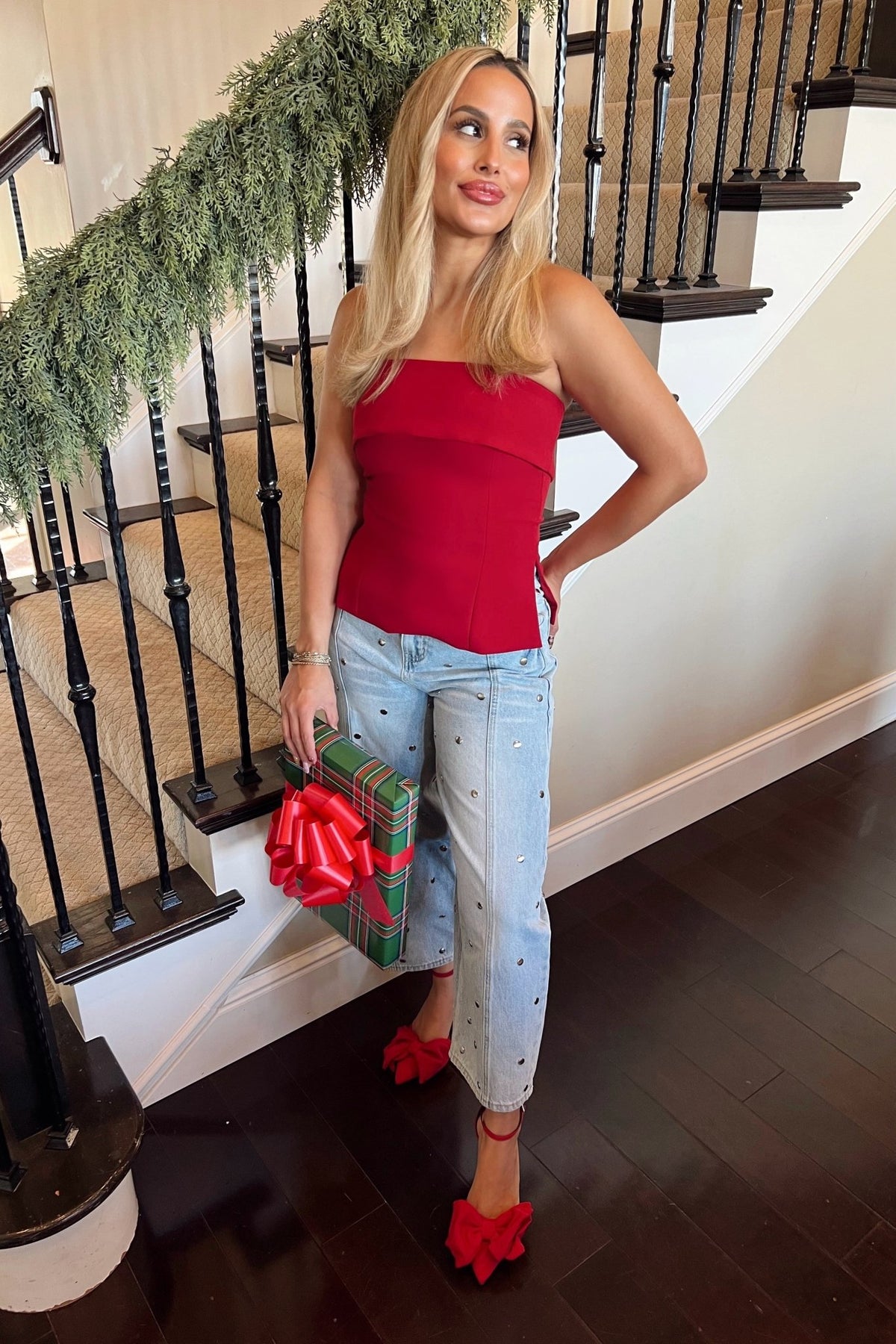 Clean lines and a structured fit make this your go to holiday party top. Polished, bold, and beautifully festive.
