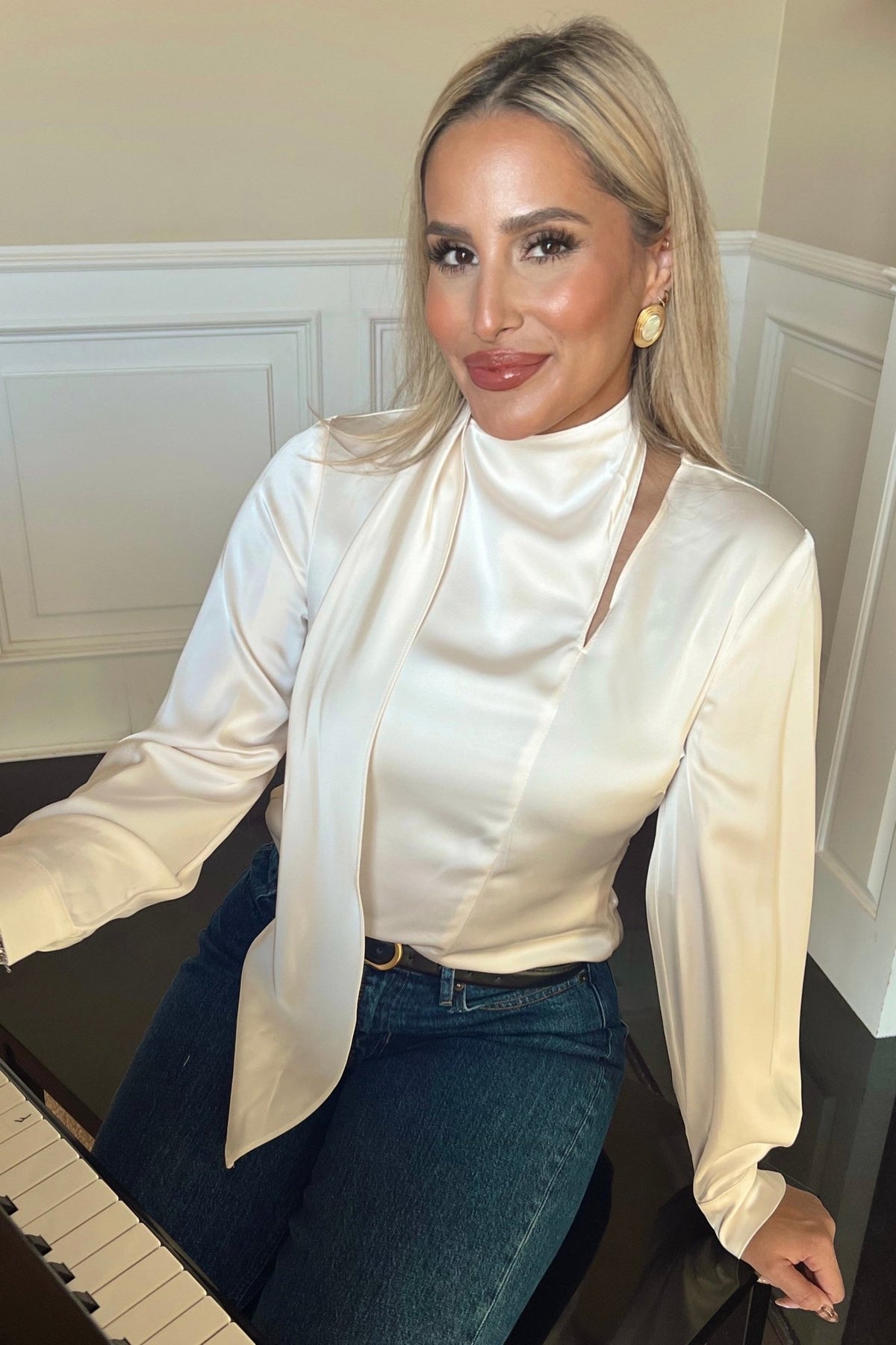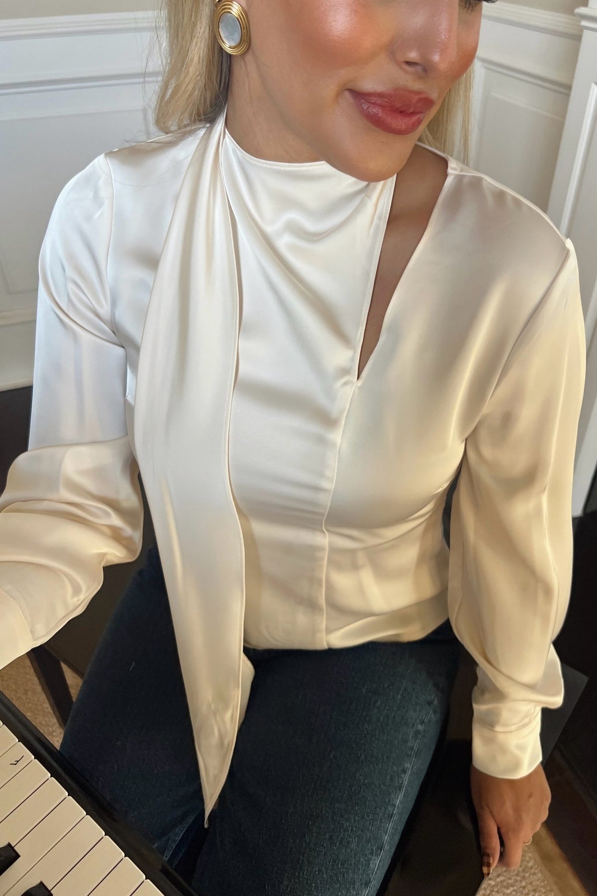 This satin blouse is the definition of understated holiday glam. The high neckline and cascading scarf detail create a sophisticated silhouette, while the glossy satin finish gives it that luxe, festive touch. A soft, fluid fit makes it comfortable enough for all night wear without losing its elevated feel. Pair it with denim, leather, or a sleek skirt for the perfect party ready look.