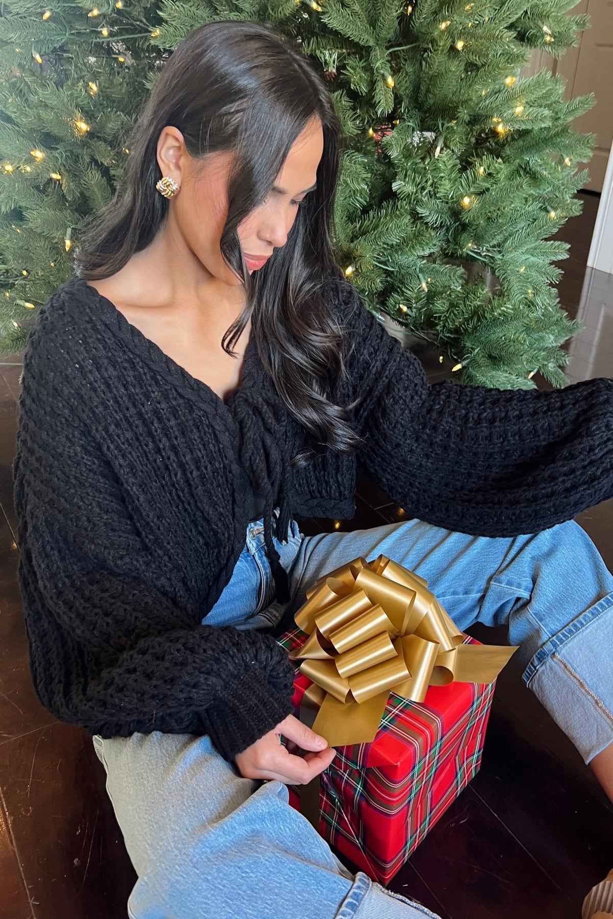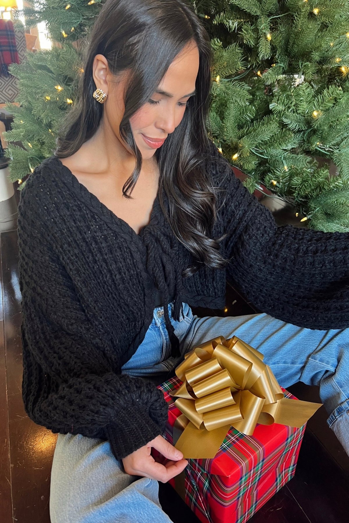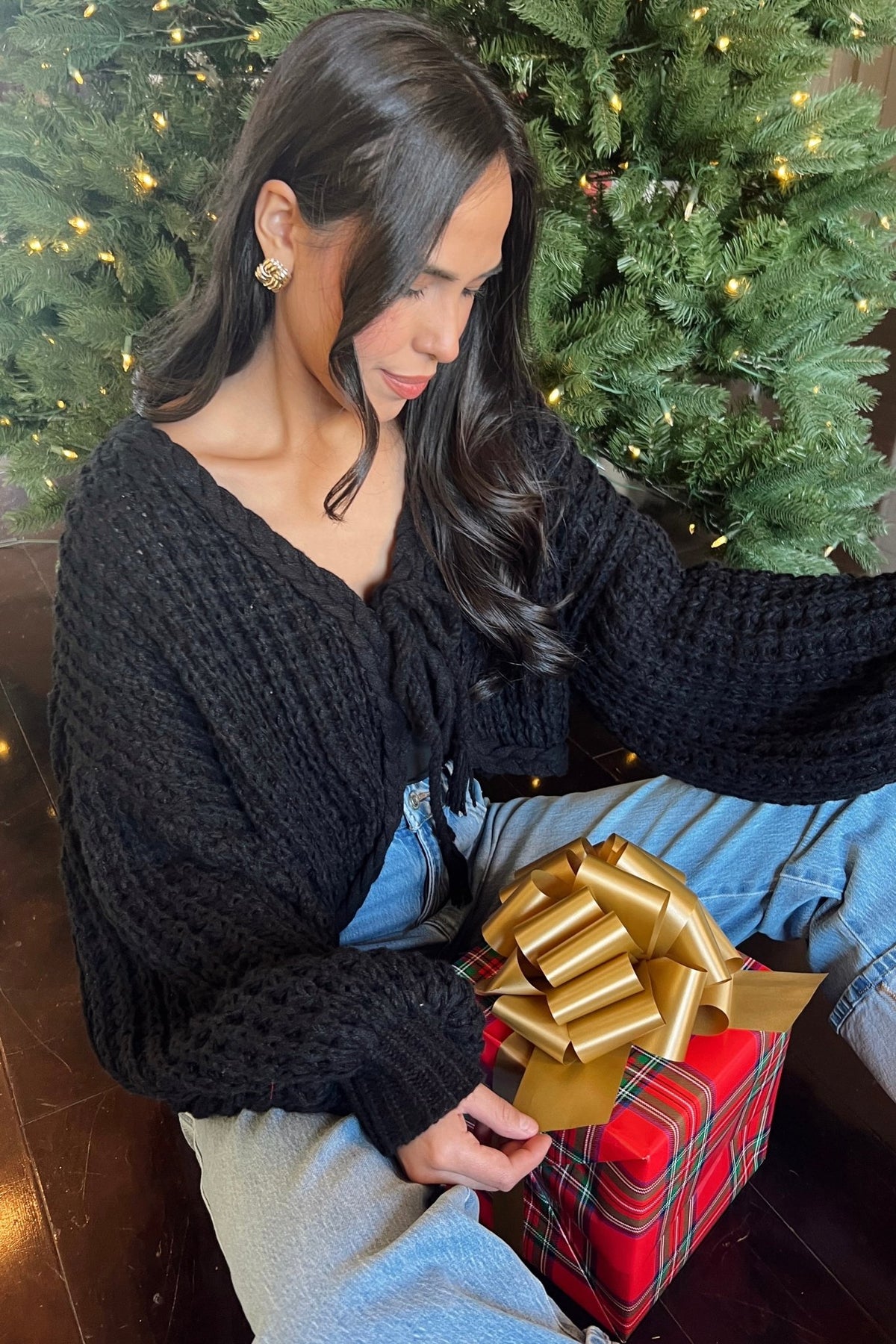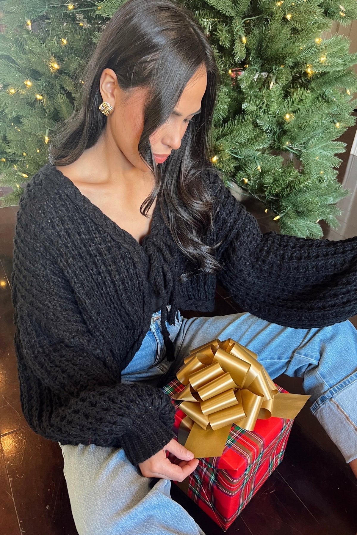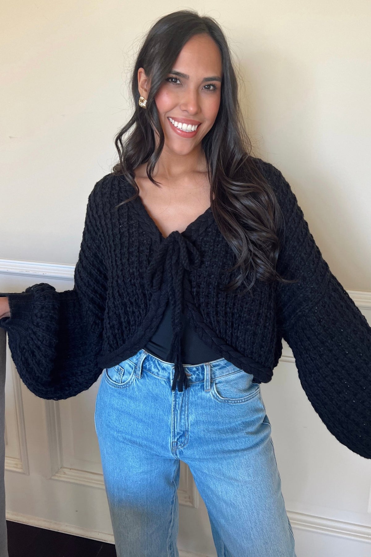 A soft, textured knit with a flirty tie front. Easy for gatherings, dinner dates, or a festive night out.