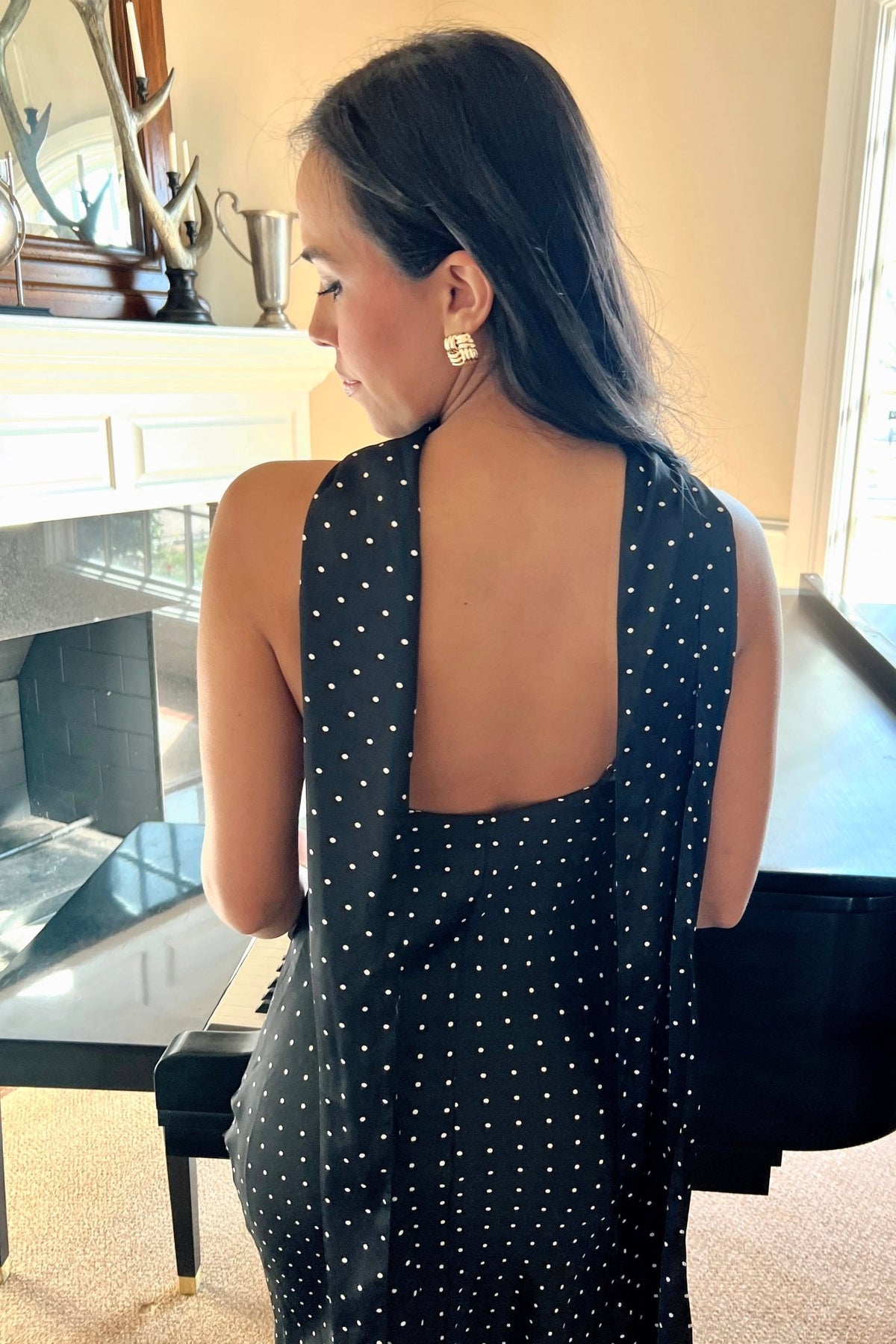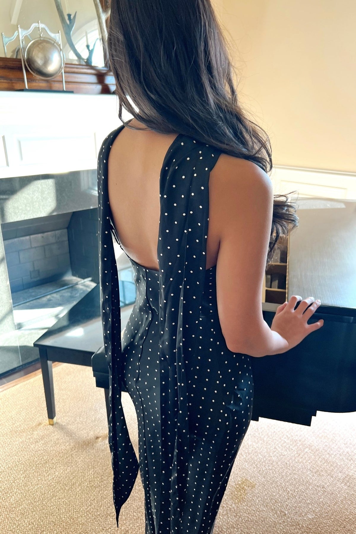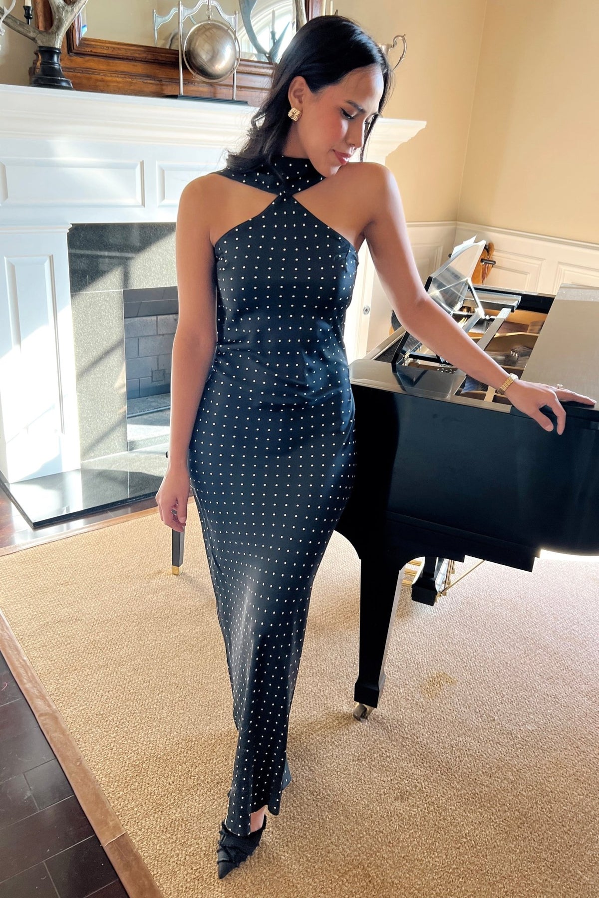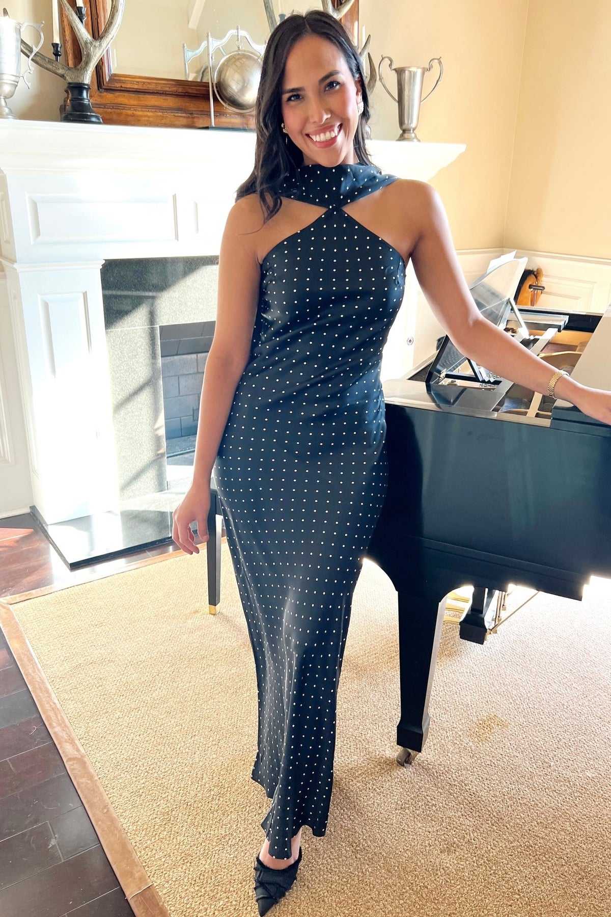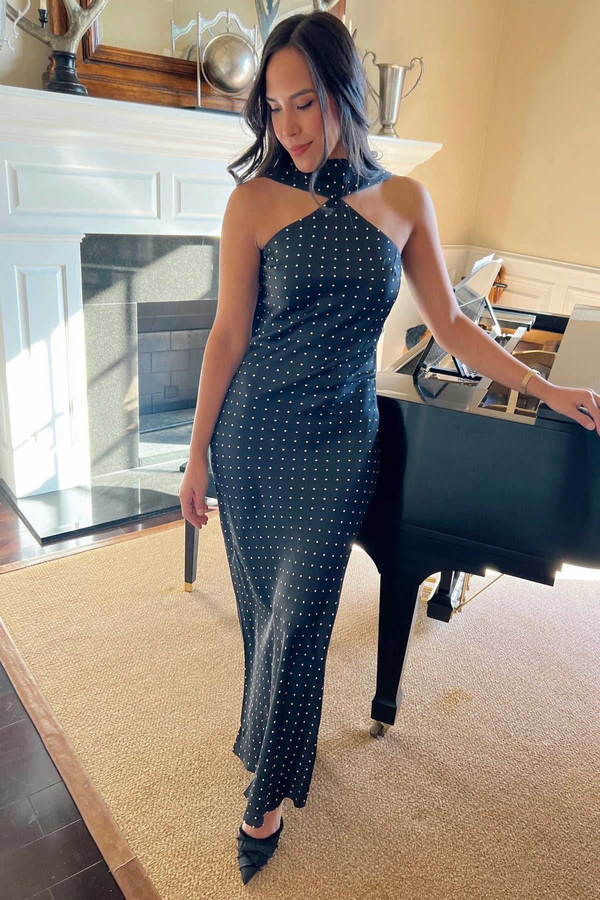 A sweeping silhouette with delicate dotted shine. Effortlessly dressy for winter parties, New Year’s, or any night you want to make an entrance.