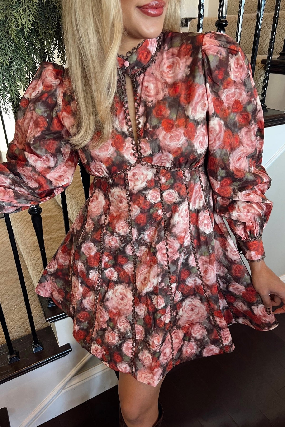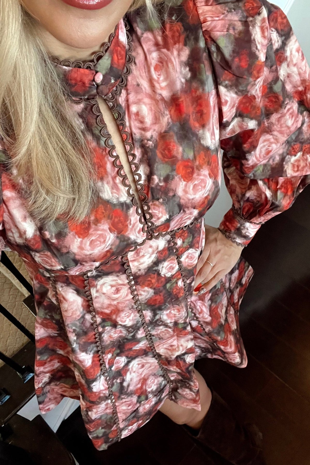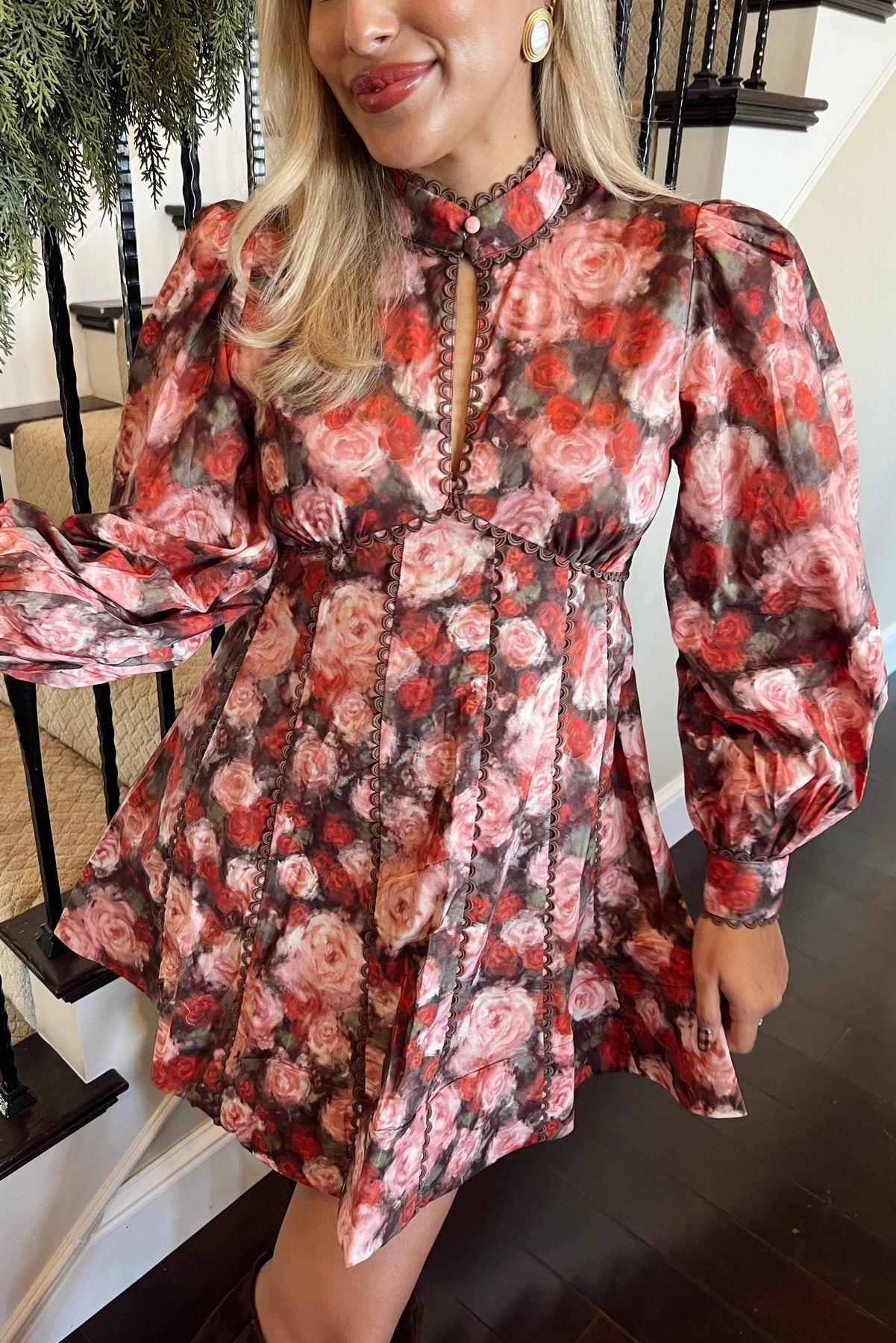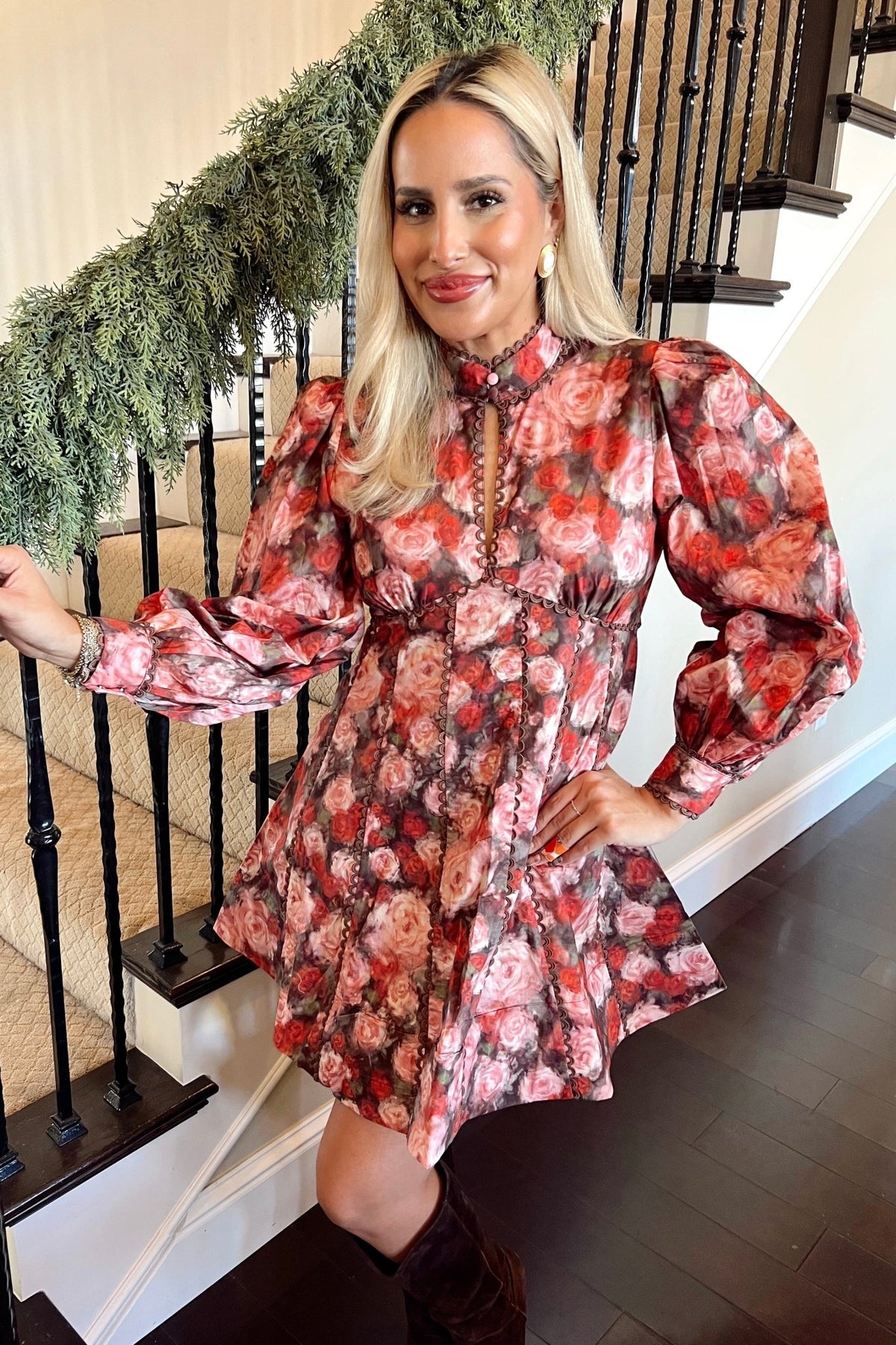 A wintery rose print with feminine structure and festive charm. Romantic, flattering, and ready for every holiday event.
