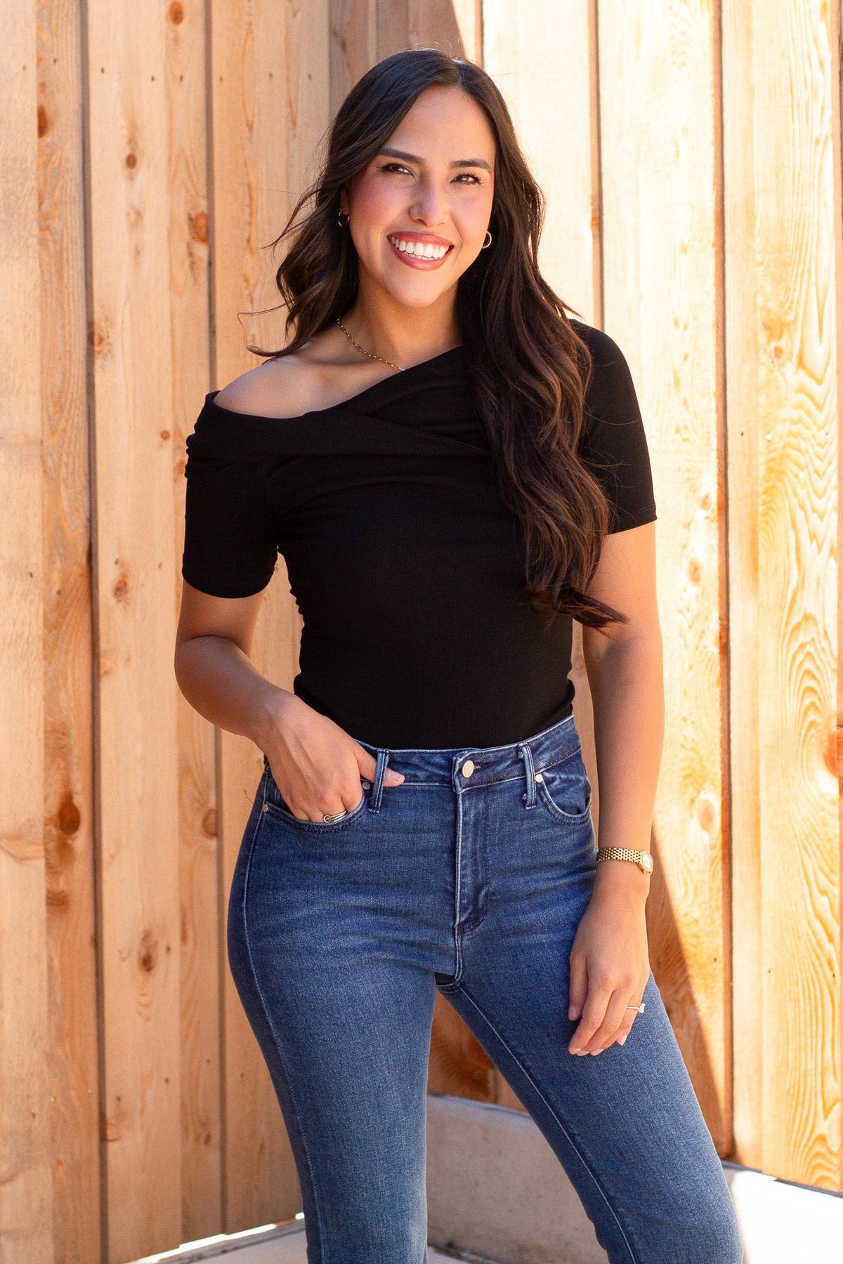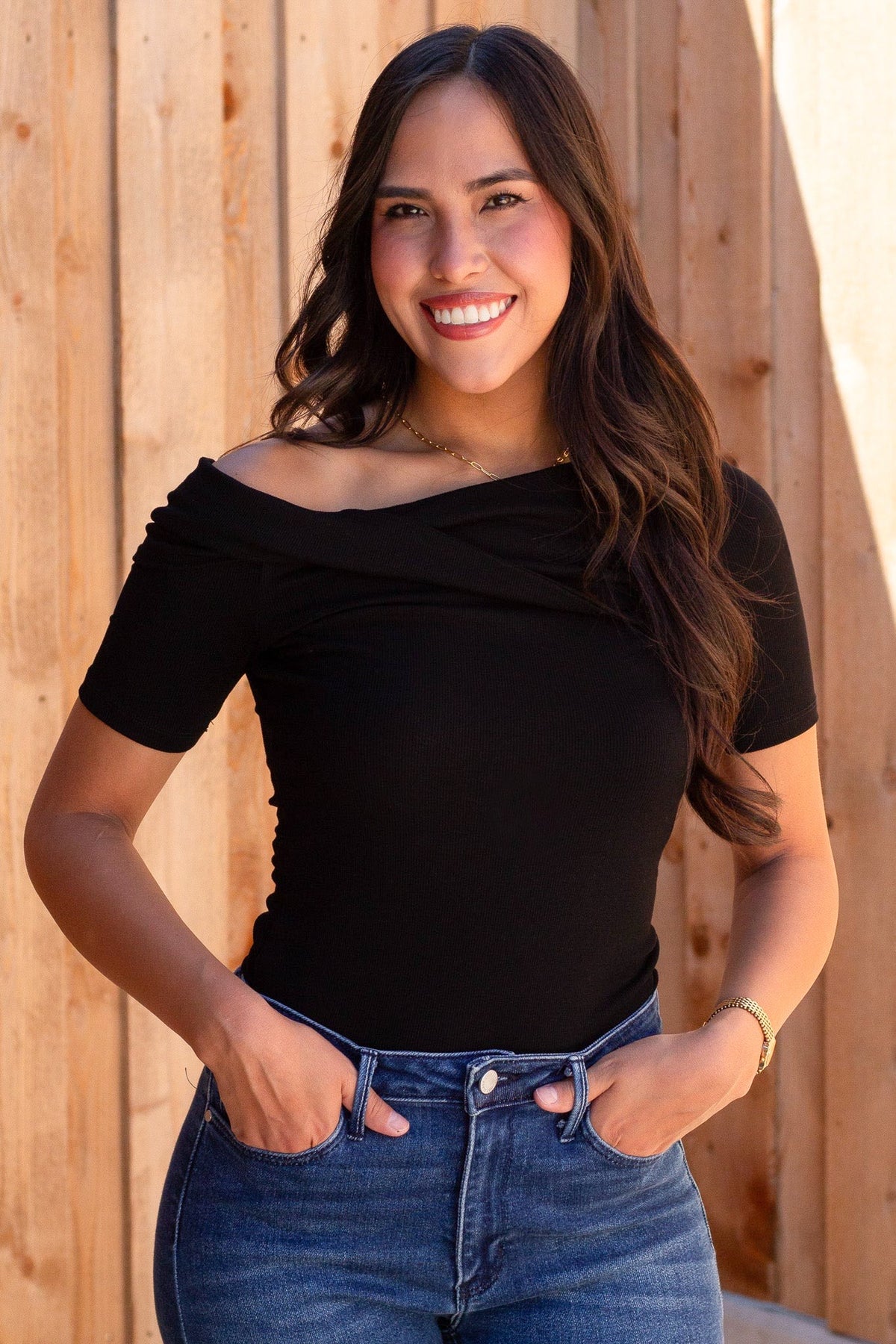 Minimal but make it sultry — this off-shoulder asymmetrical top features a soft ribbed knit and draped neckline that perfectly frames your collarbone. An easy piece to elevate your everyday denim or style with a sleek skirt for a night out.