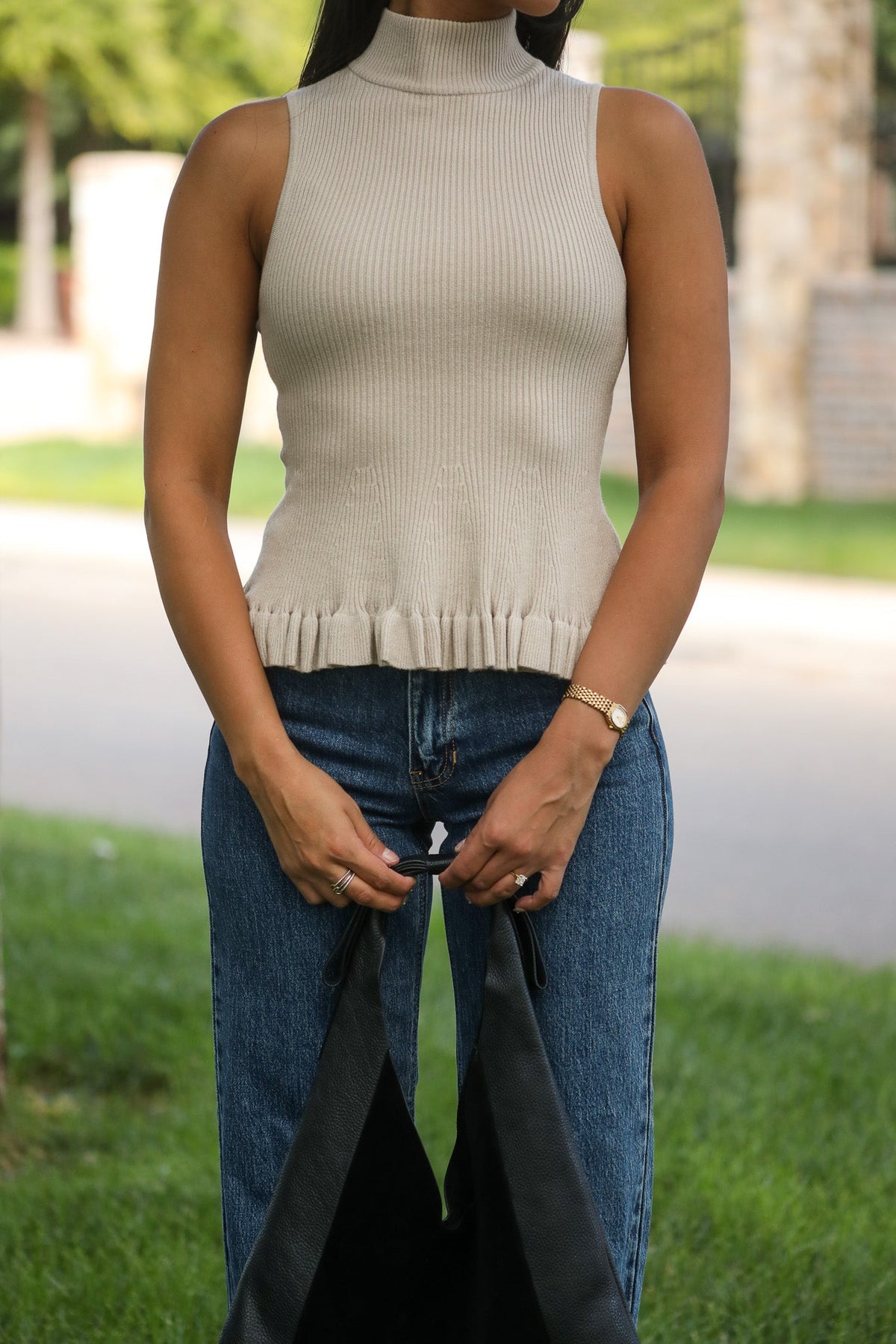 Your wear now AND wear later elevated basic. This ribbed turtleneck tank features a subtle ruffle hem that looks just as good with denim cutoffs as it does under a blazer. Transitional dressing = solved.