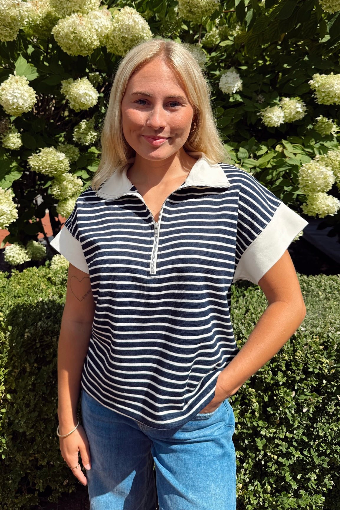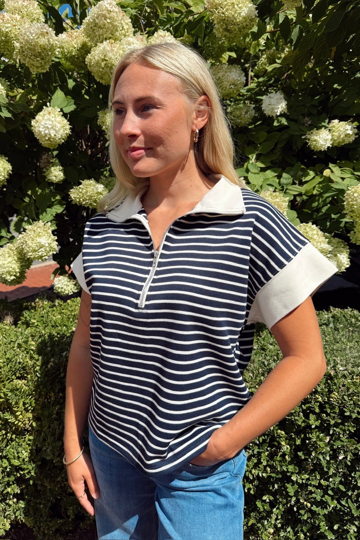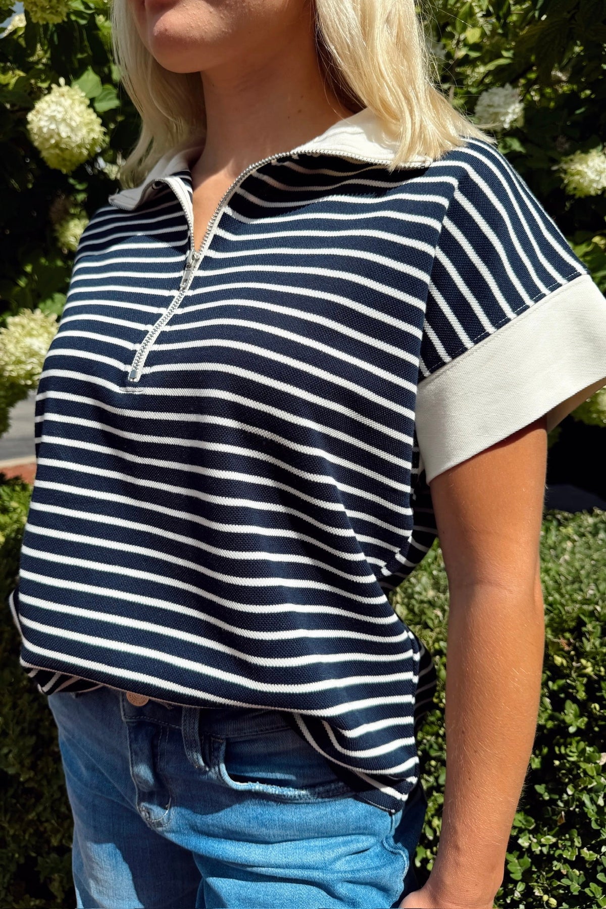 A sporty twist on classic stripes. This half-zip knit polo features a crisp collar and relaxed fit that works with denim, skirts, or layered under jackets. A go-to for those “cute but casual” days.