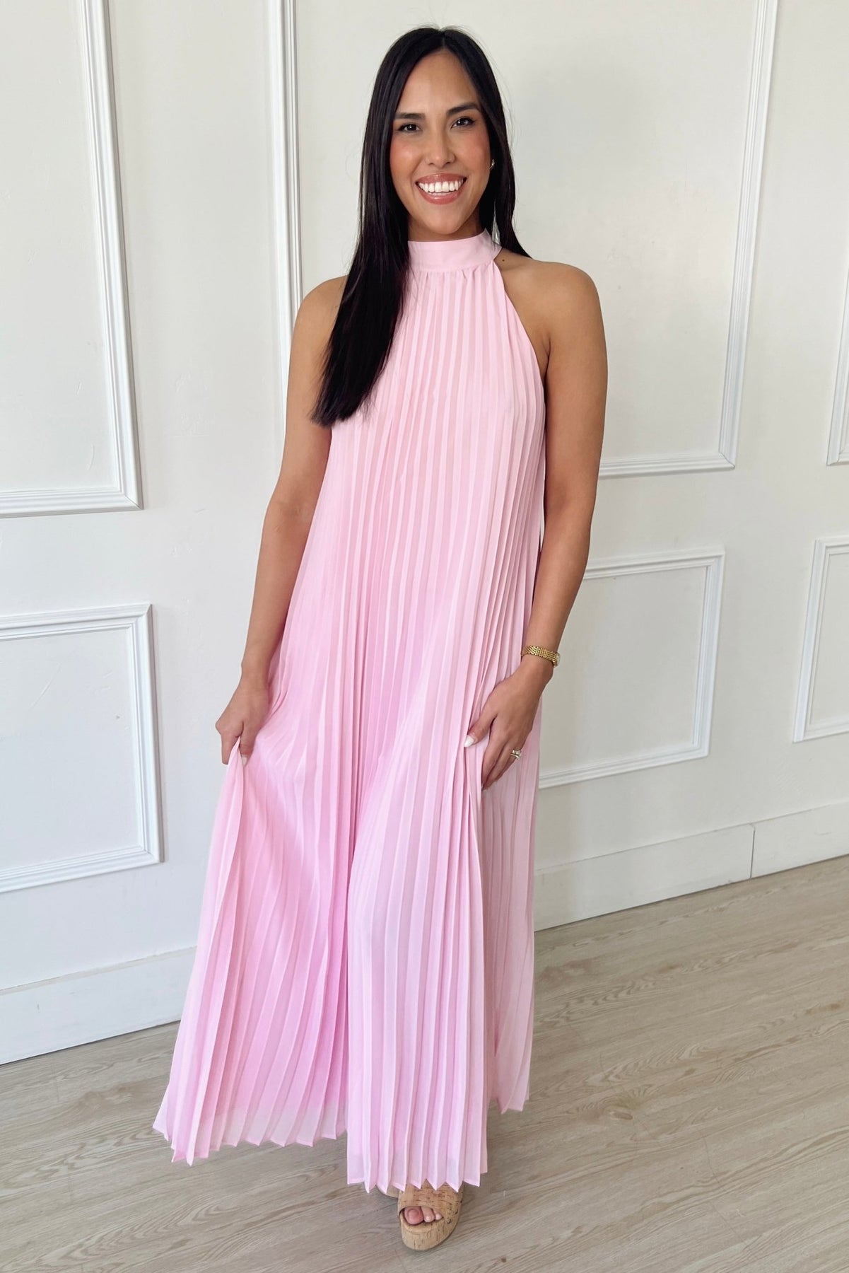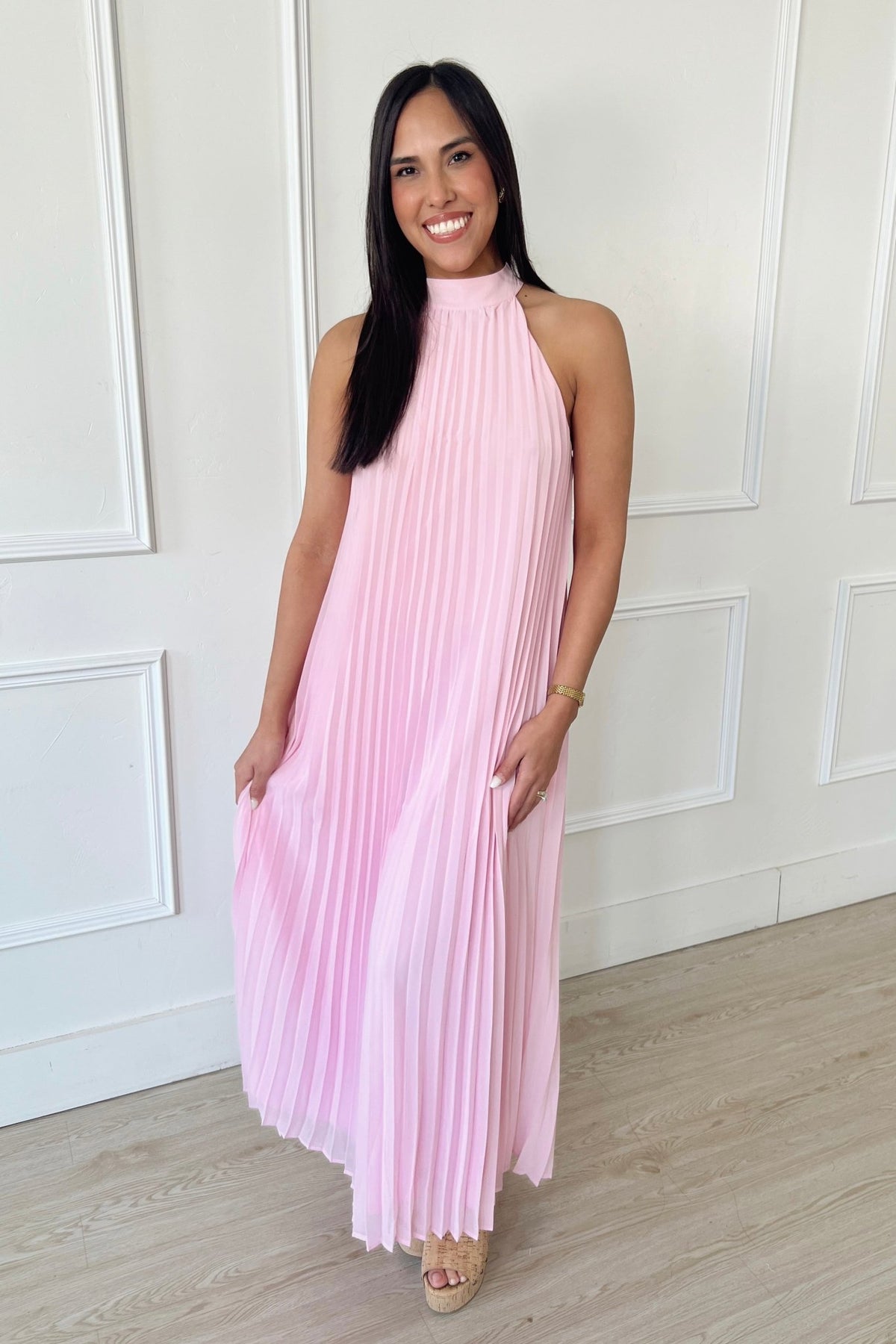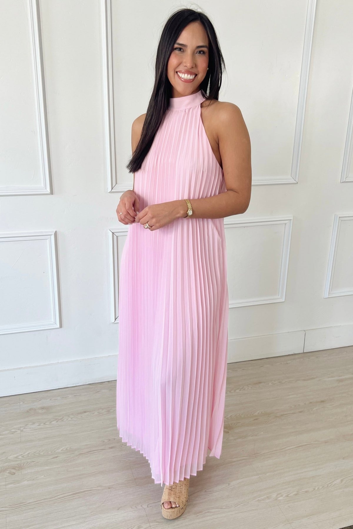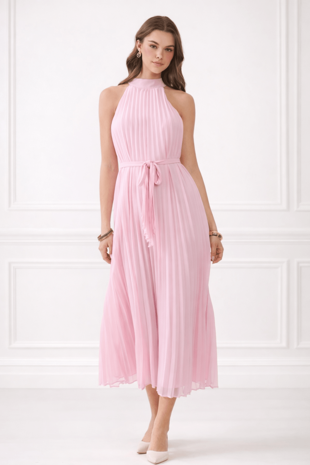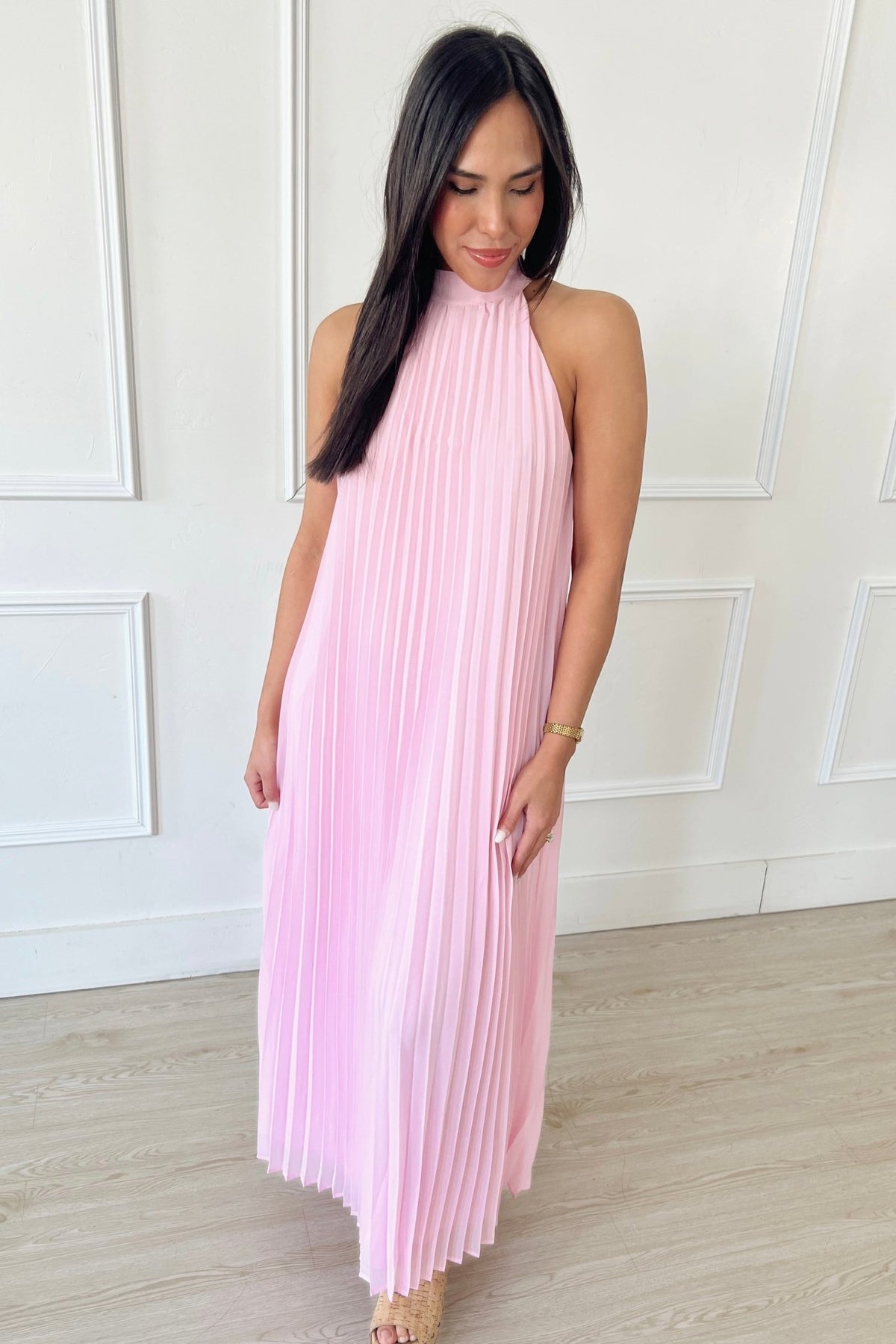 A soft pleated midi in the prettiest blush tone with a flattering removable tie waist and halter neckline. Effortless, flowy, and made for every special moment.