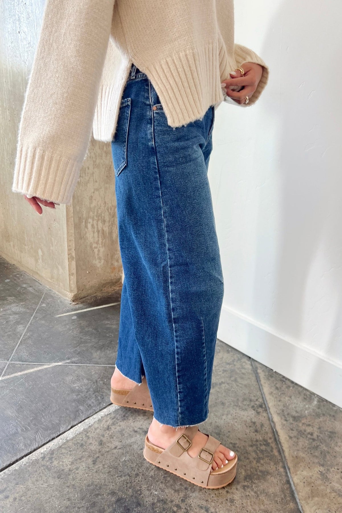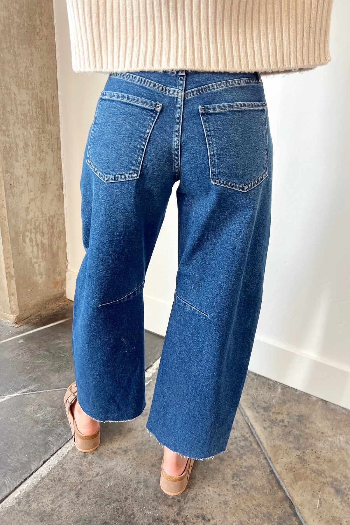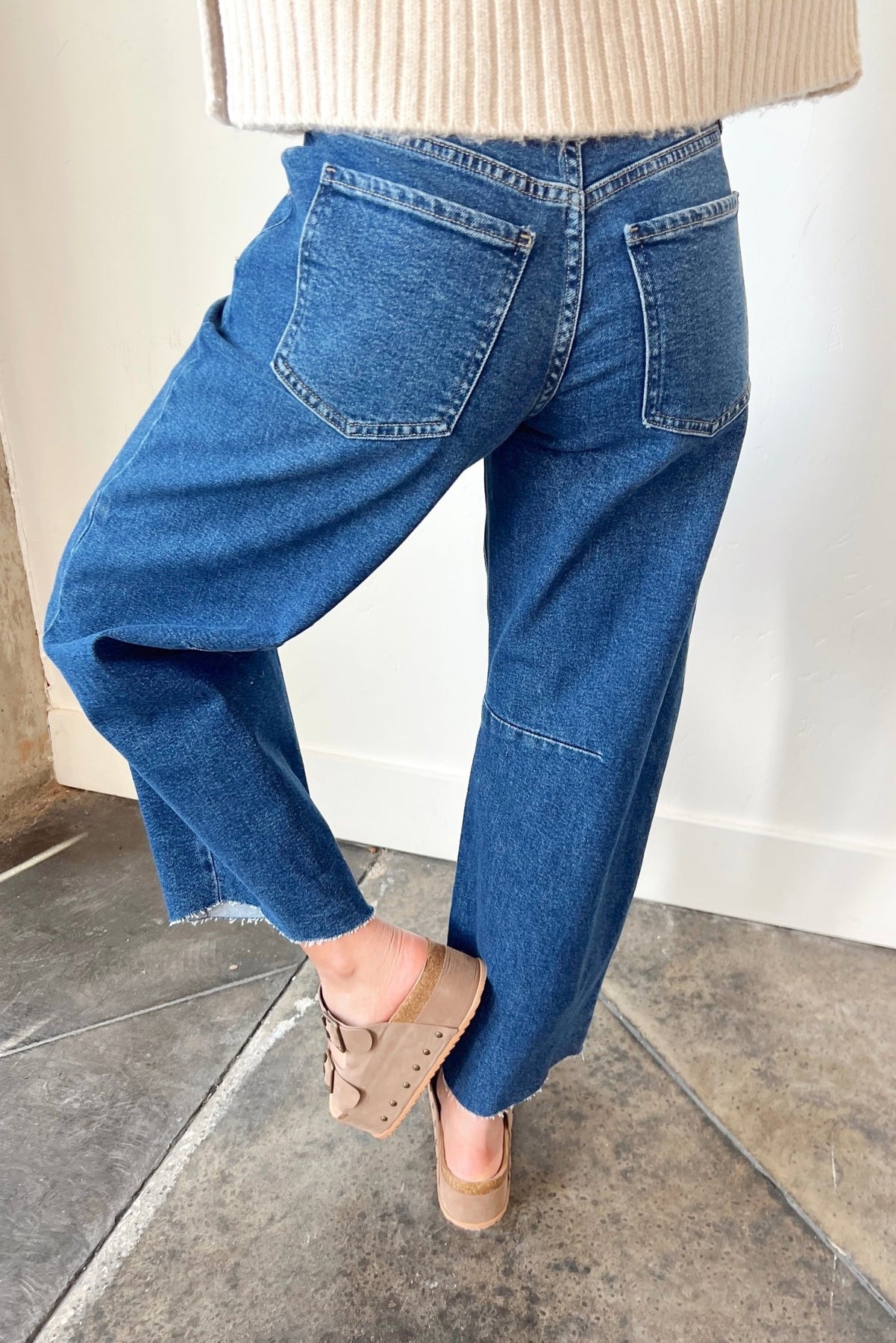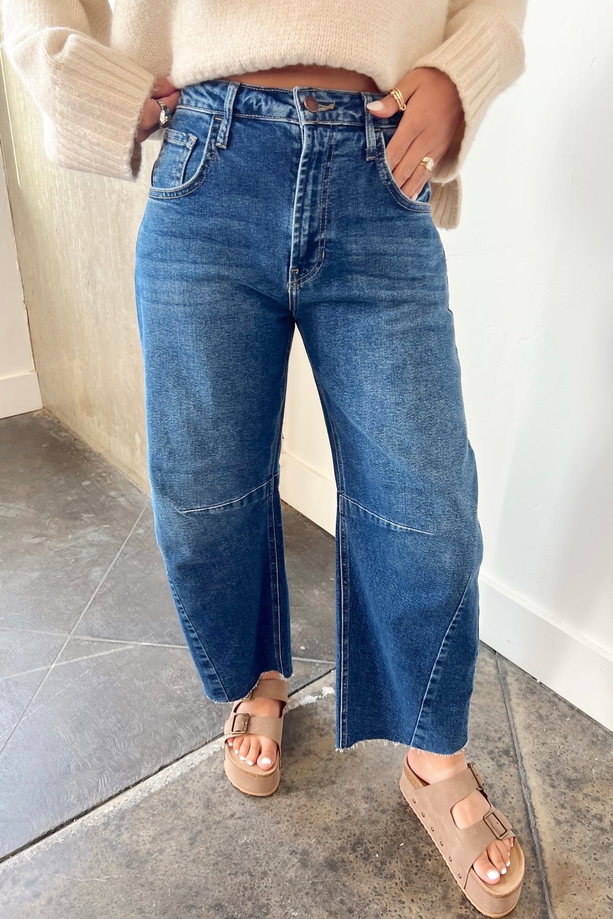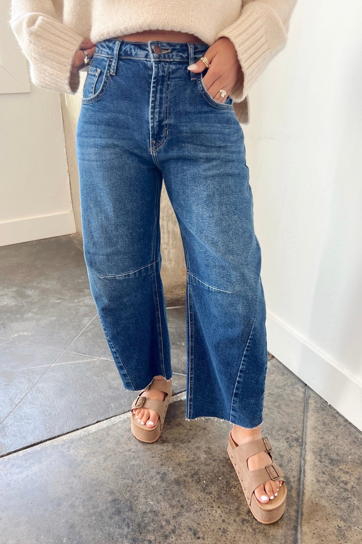 A structured barrel leg with modern seam detailing and a deep indigo wash. Sculpted, stylish, and made to stand out without trying too hard.