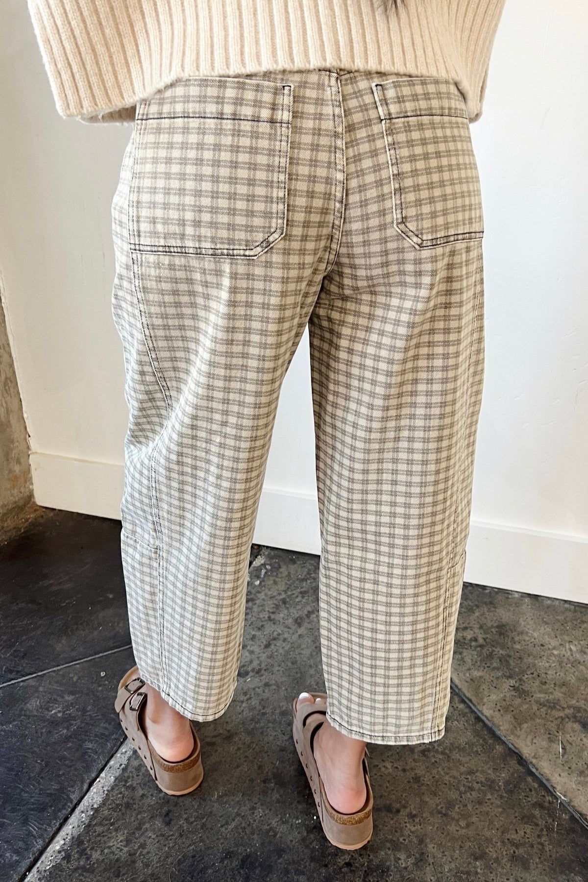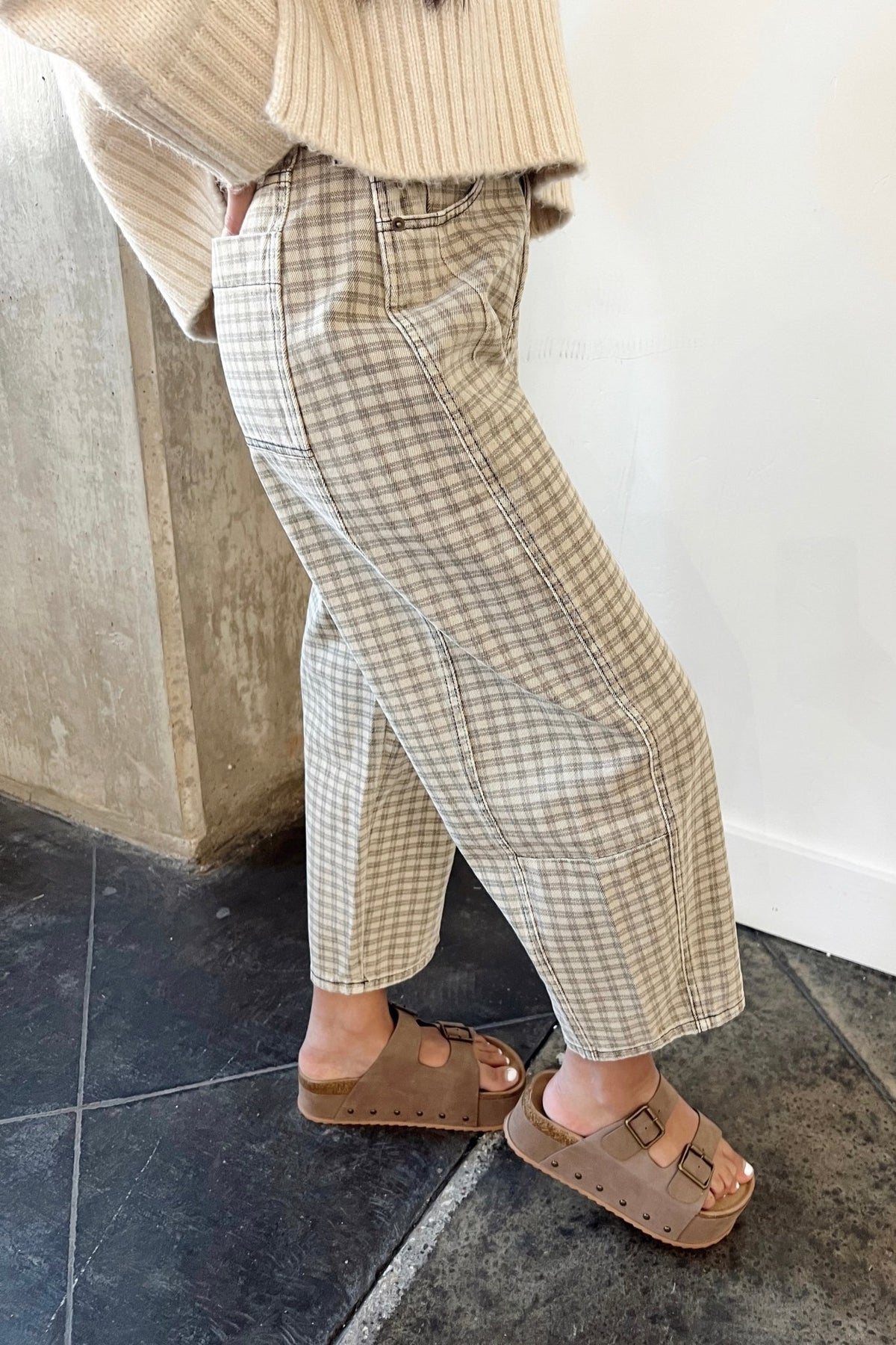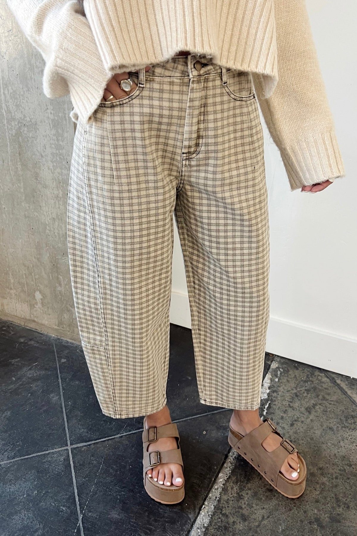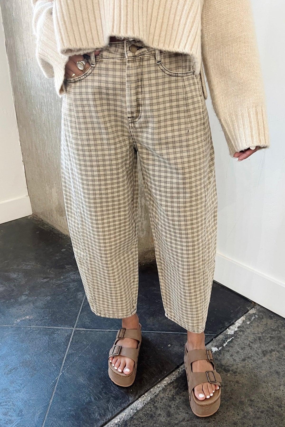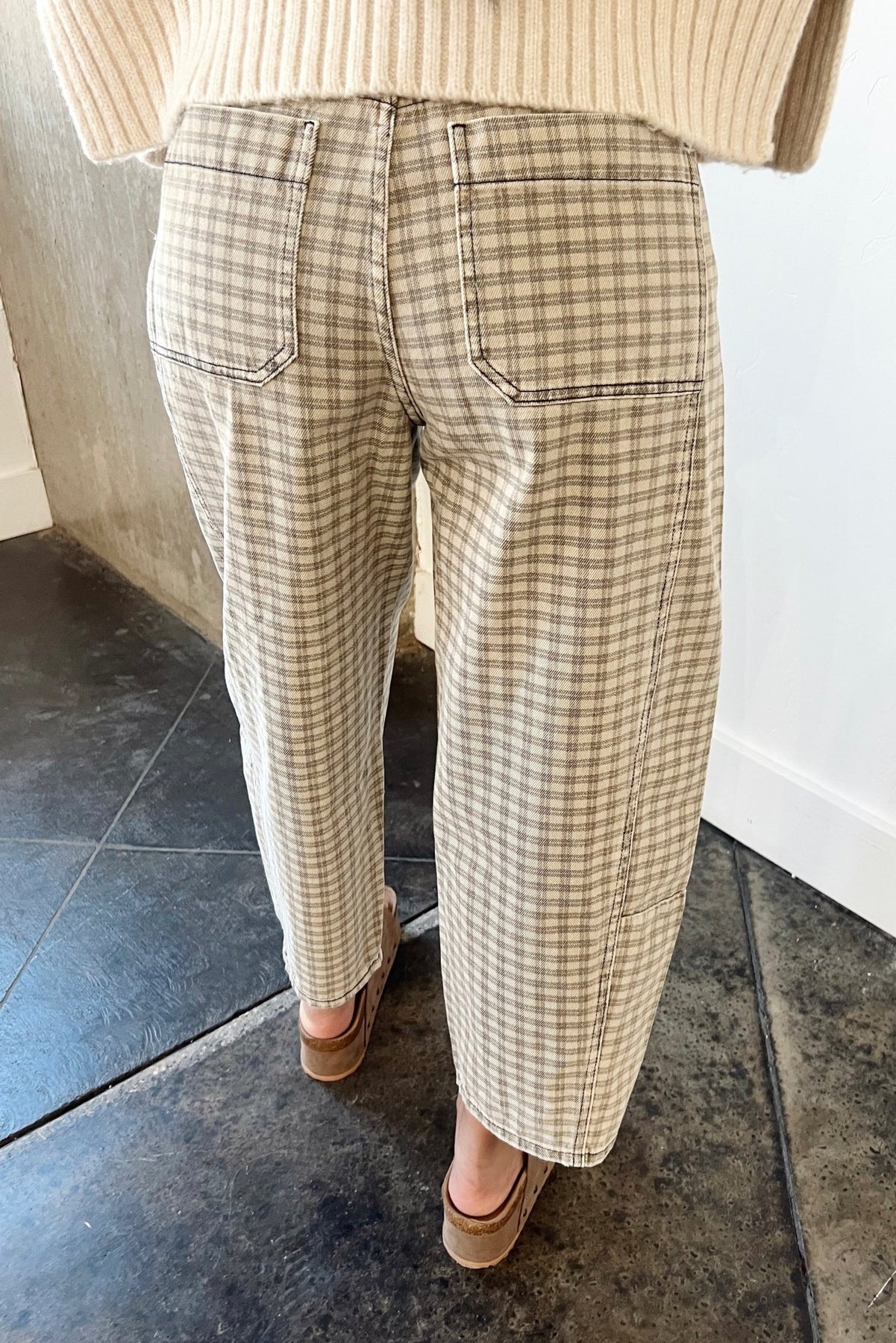 A fresh take on denim with a relaxed barrel leg and soft neutral plaid. These sit comfortably at the waist with a structured-but-easy fit through the leg, making them just as good with a cozy knit as they are with a fitted tee. Easy to dress up or down, and the kind of pair you’ll reach for when you want something different without trying too hard.