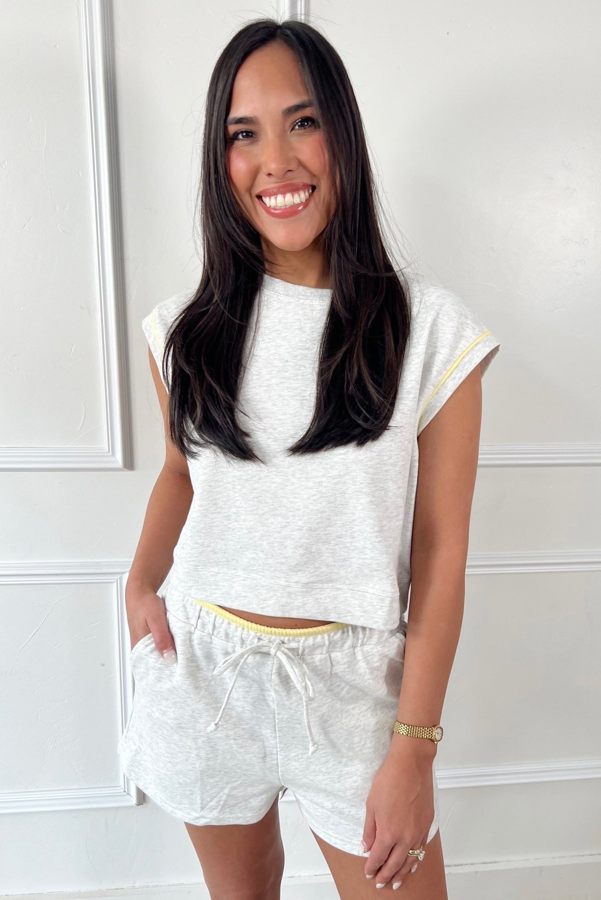 The easiest throw on and go set. This soft heather grey lounge duo features a relaxed muscle style crop top and comfy drawstring shorts with the cutest hint of yellow peeking through. Lightweight, effortless, and made for everyday wear.
