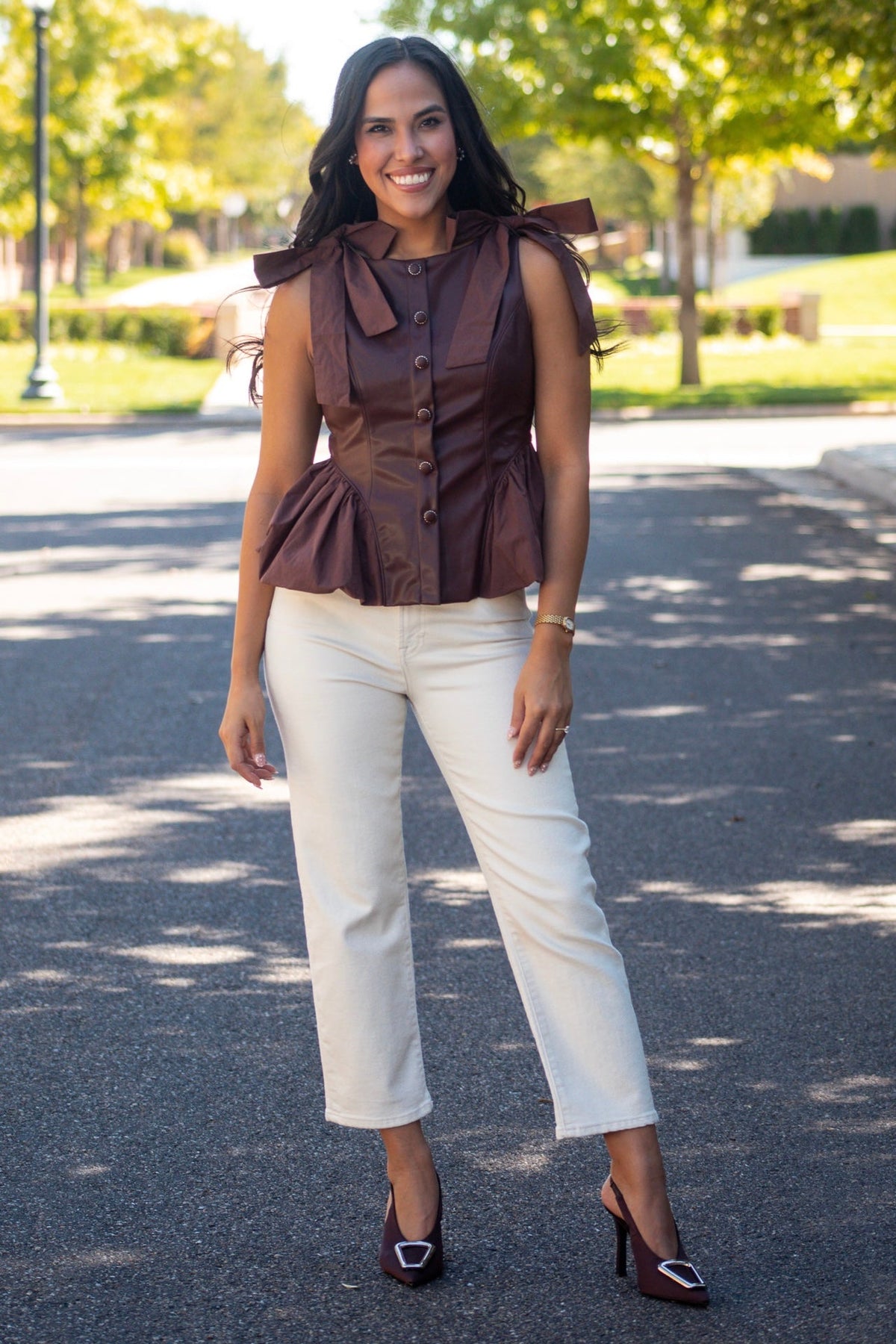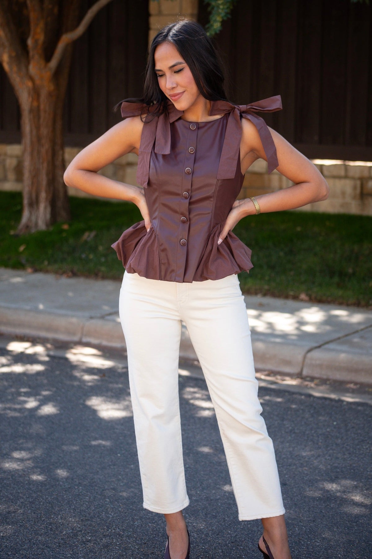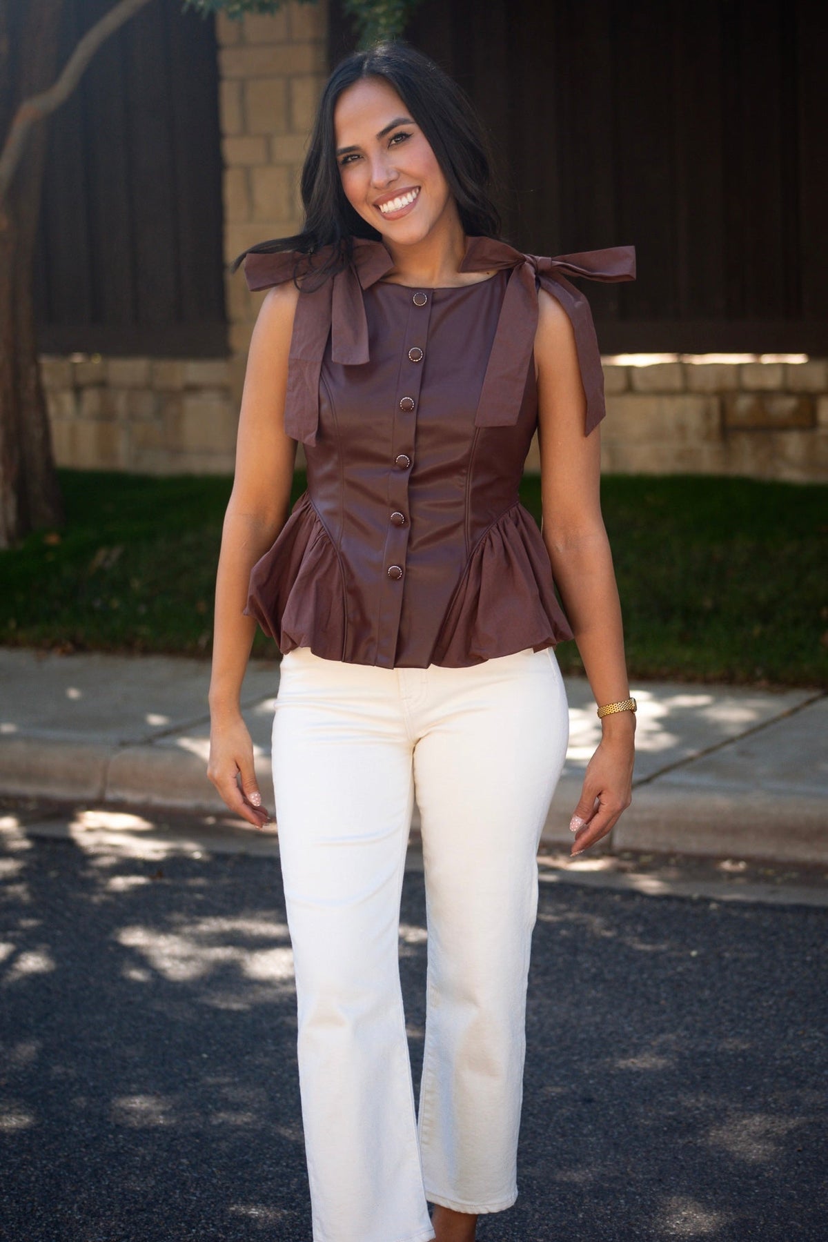 A rich fall favorite, this faux leather peplum top features statement buttons, a flattering fit, and a feminine bow detail on the shoulder. The warm mocha hue makes it perfect for pairing with denim or trousers for a chic, seasonal look that stands out day or night.