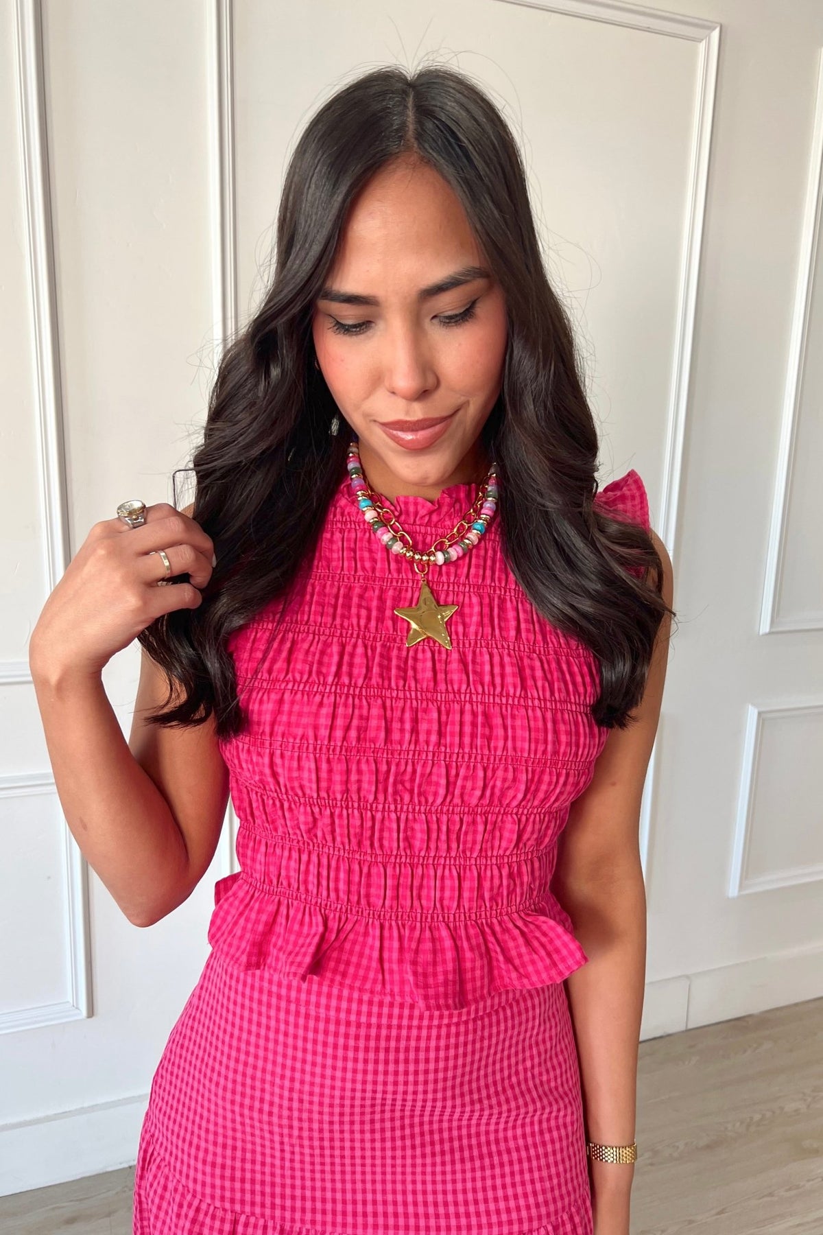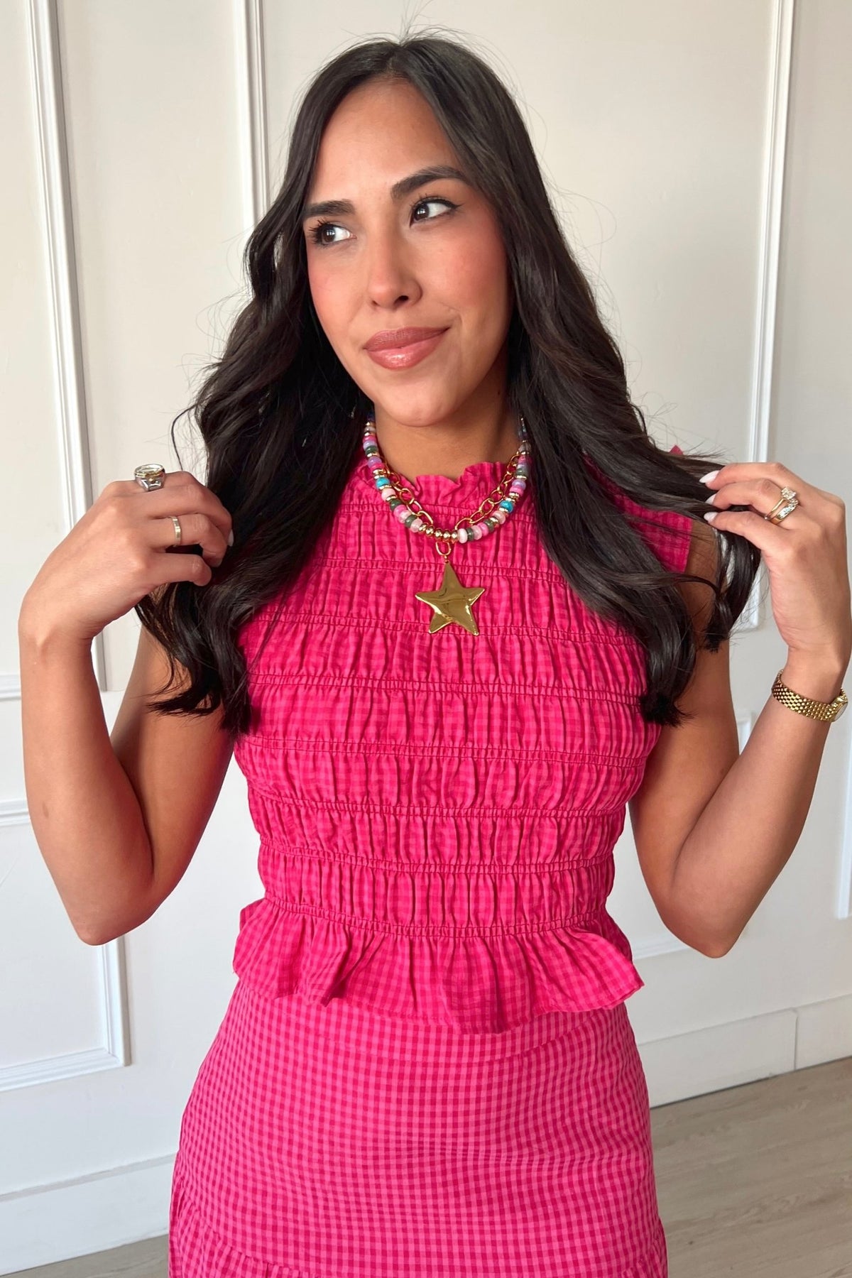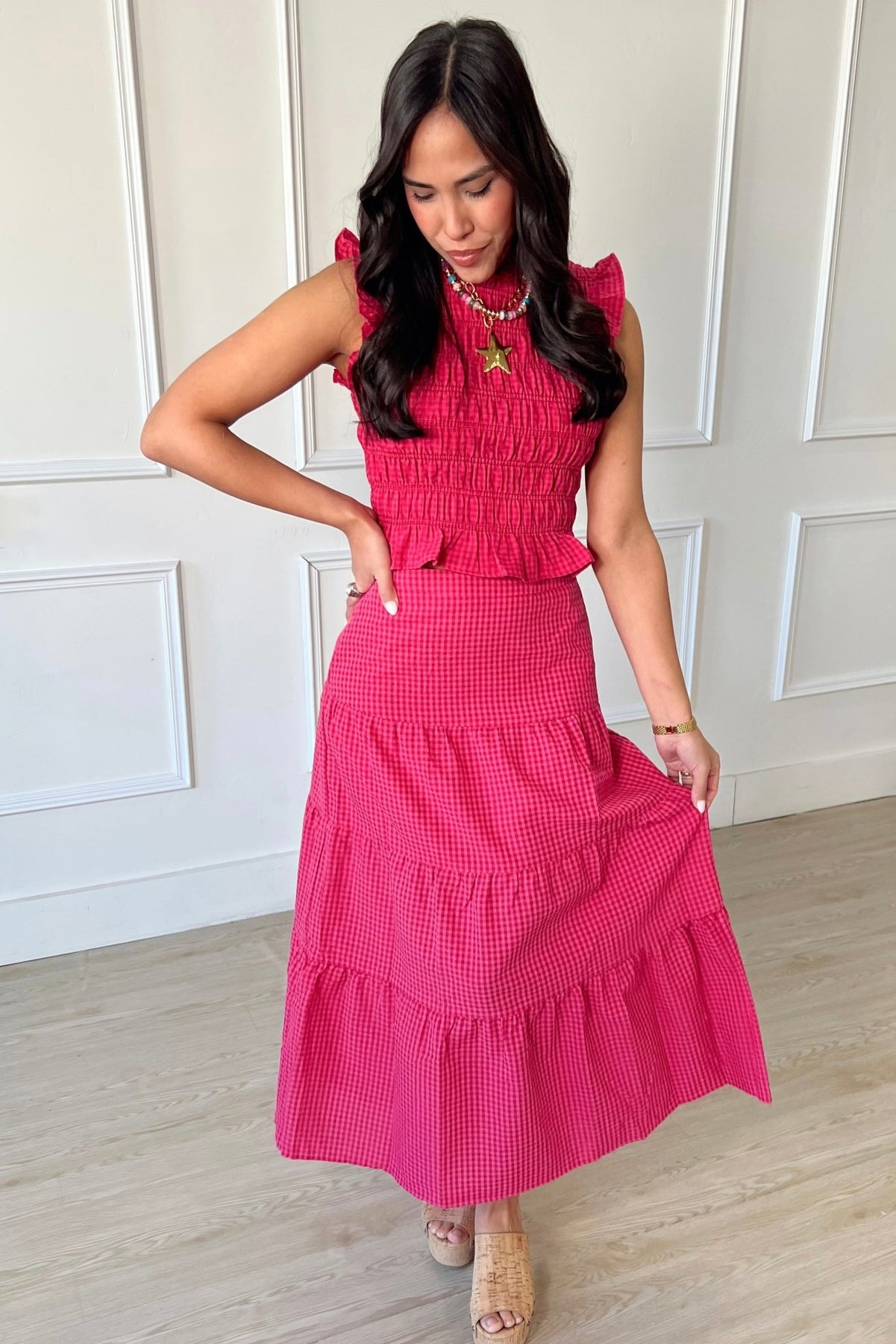 This smocked gingham top brings a playful pop of pink and red. The stretchy, smocked fit and subtle ruffle hem make it flattering and easy to pair with denim, white shorts, or the matching skirt.