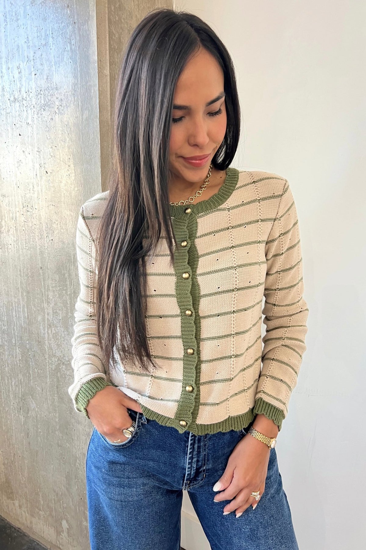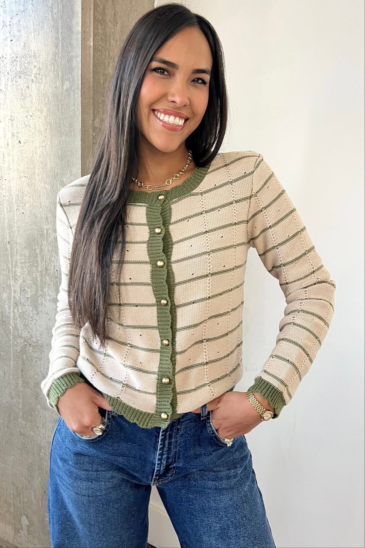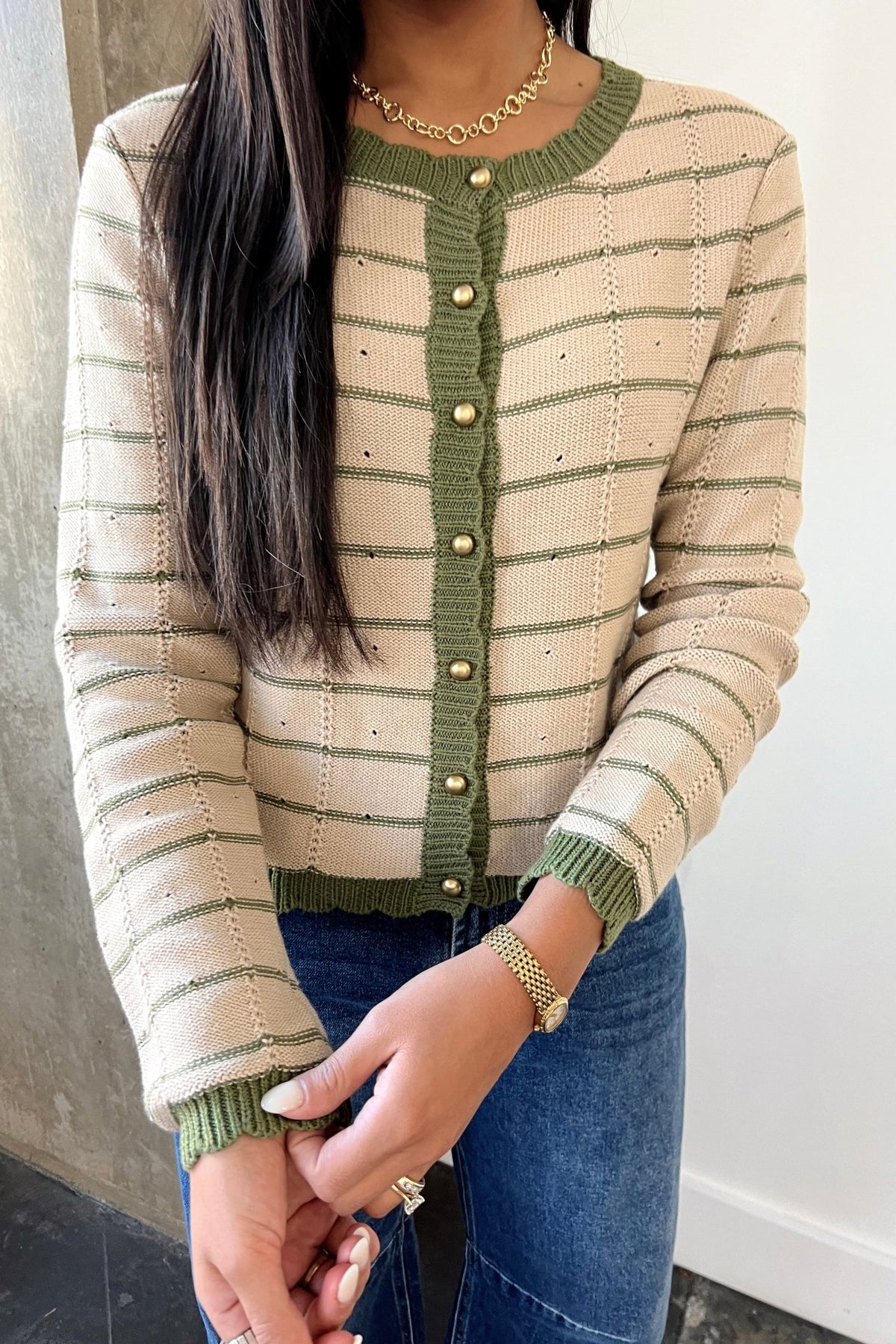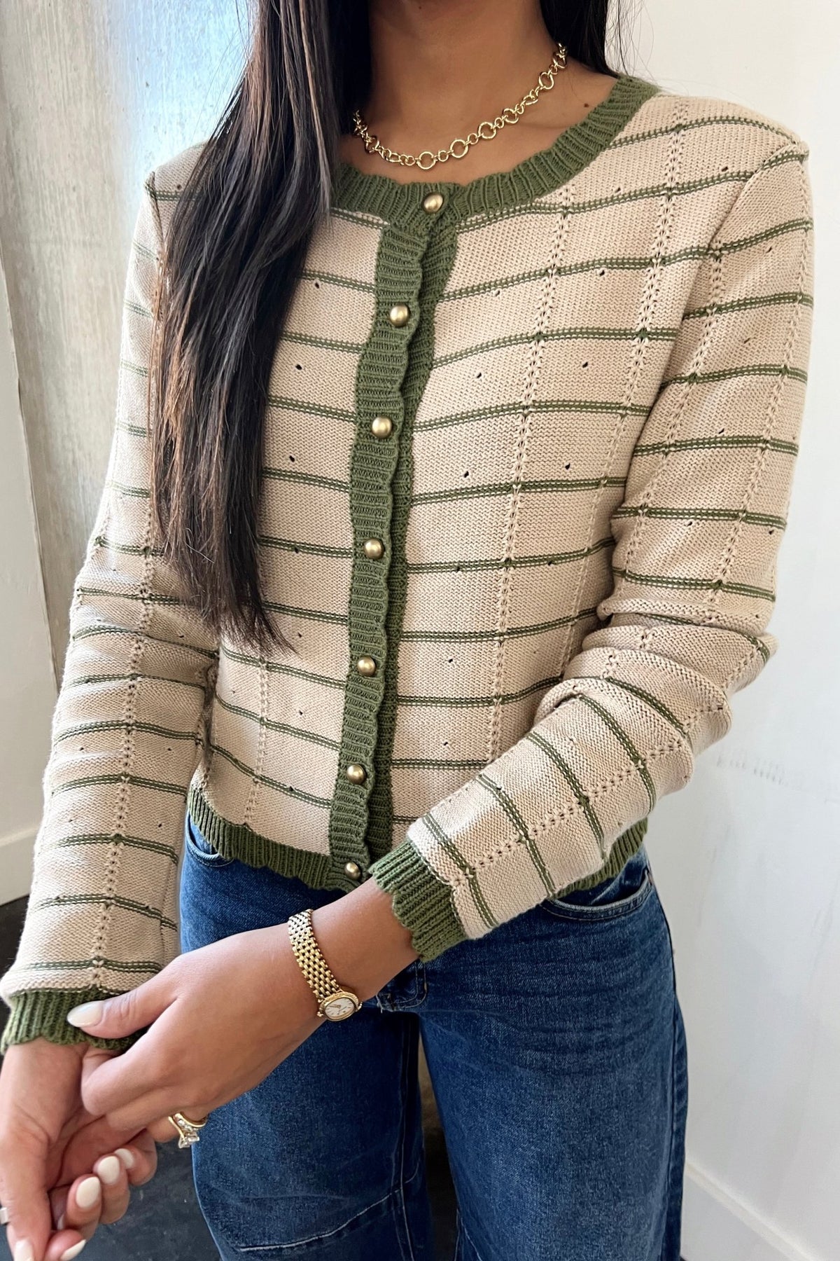 A soft knit cardigan with subtle stripes and olive trim detailing. Finished with gold buttons for an elevated everyday look.