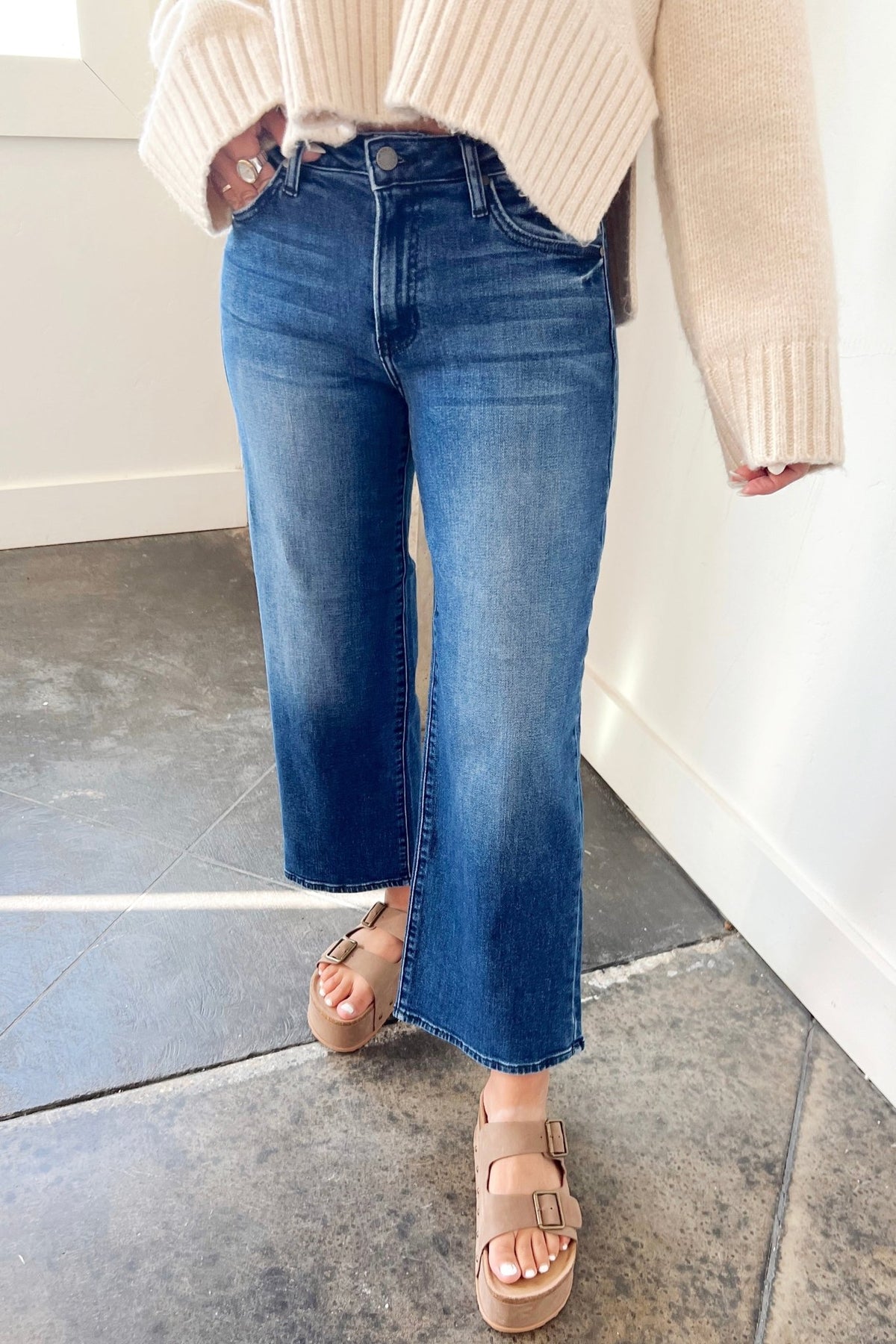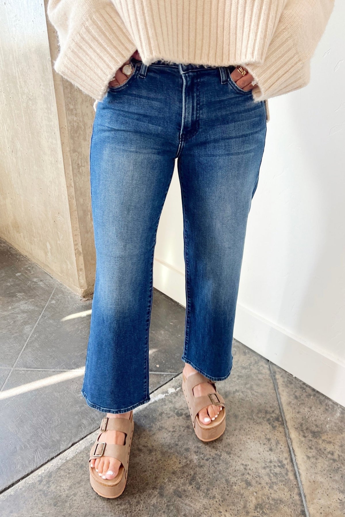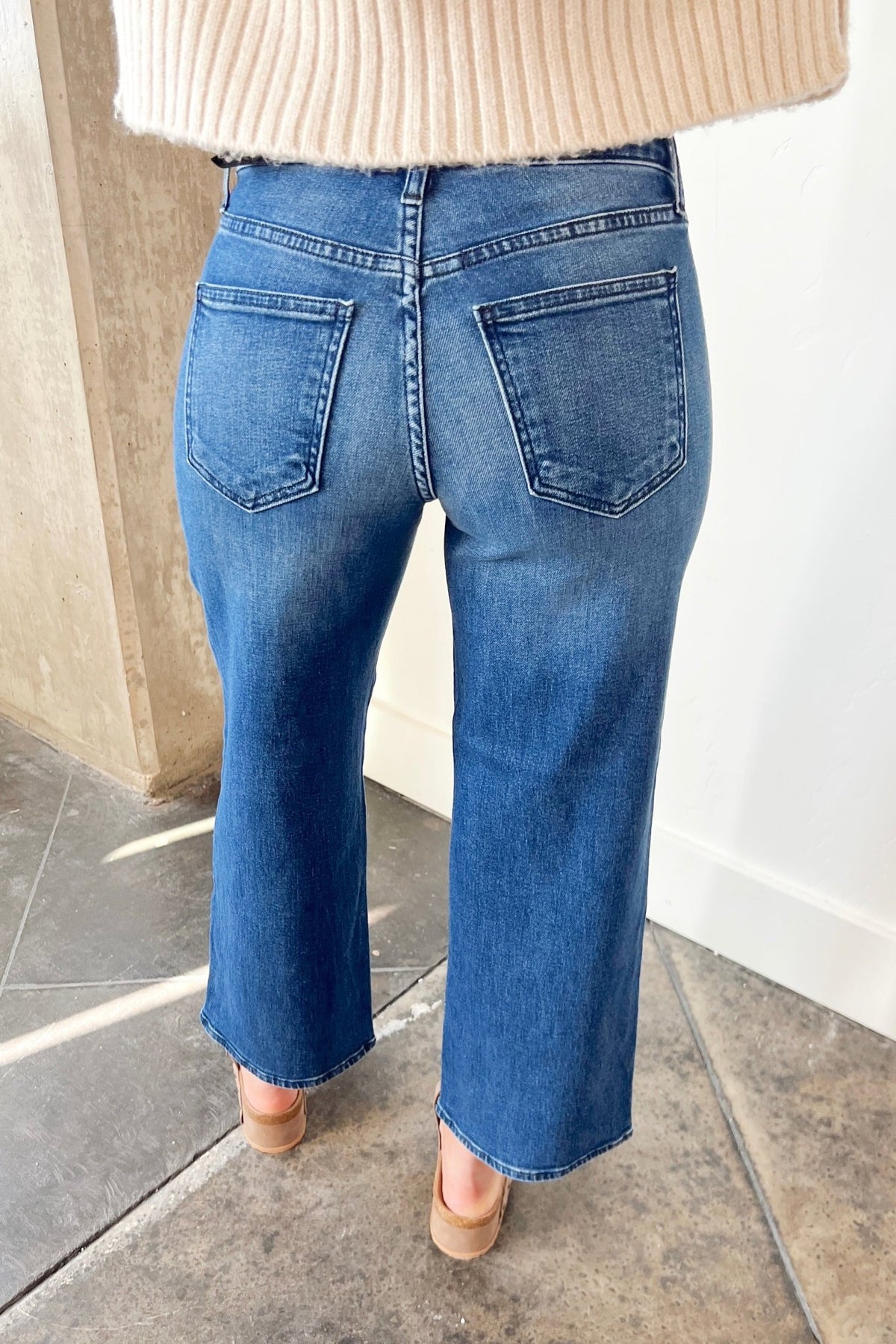A dark wash kick flare that moves with you. Easy, flattering, and ready for sweaters, sneakers, or a night out heel.