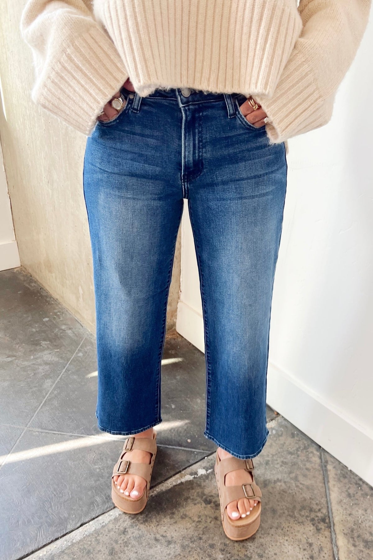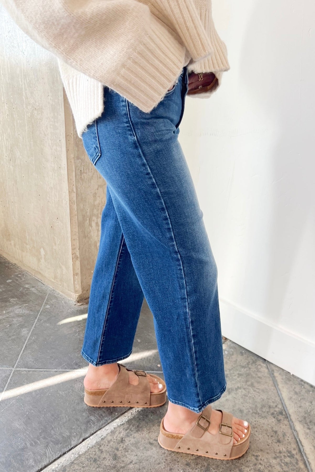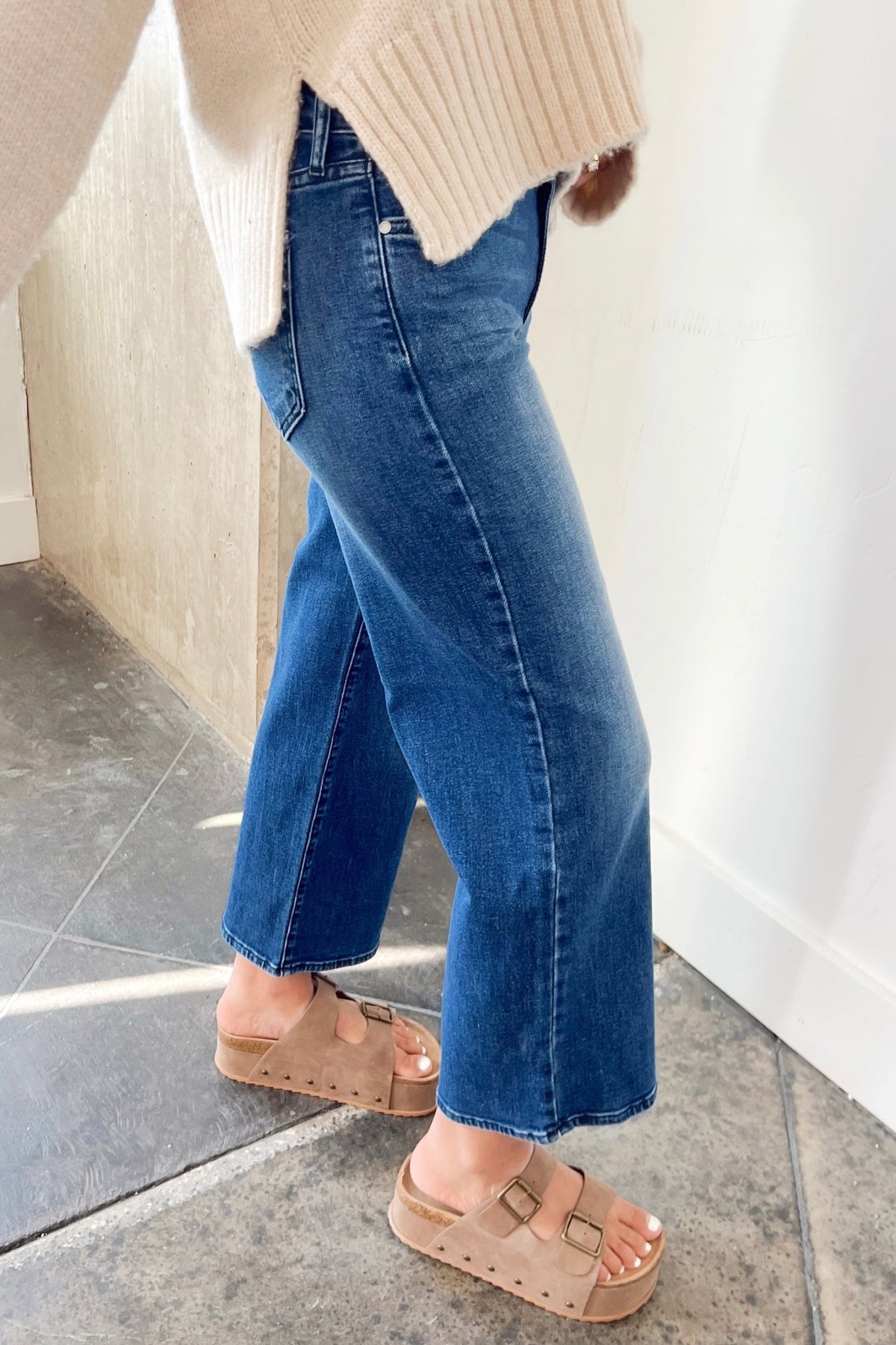 A dark wash kick flare that moves with you. Easy, flattering, and ready for sweaters, sneakers, or a night out heel.